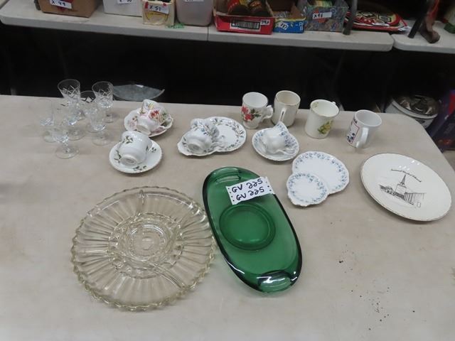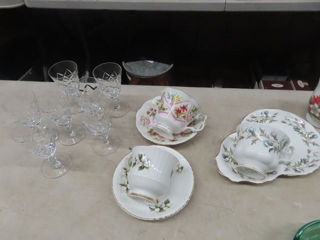 China Cups + Saucers, Royal Albert and others Cut Glass, Trays plus more