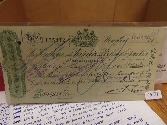 China Hong-Kong Shanghai Cancel Cheque Feb 27, 1941