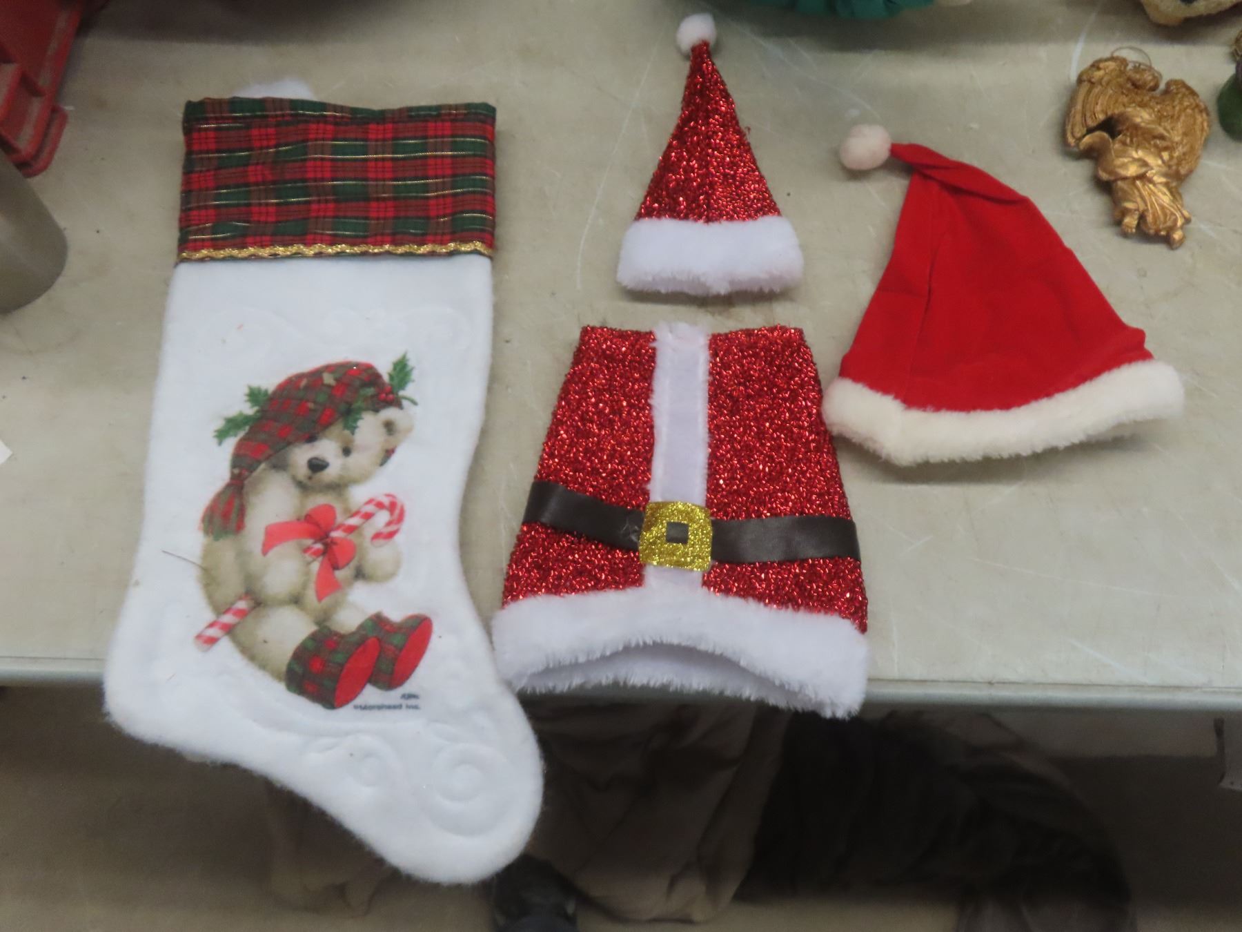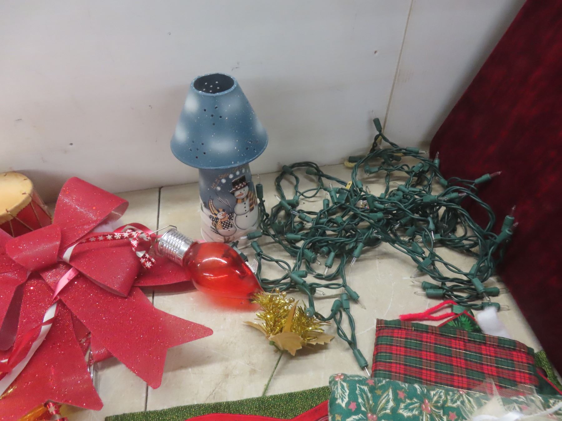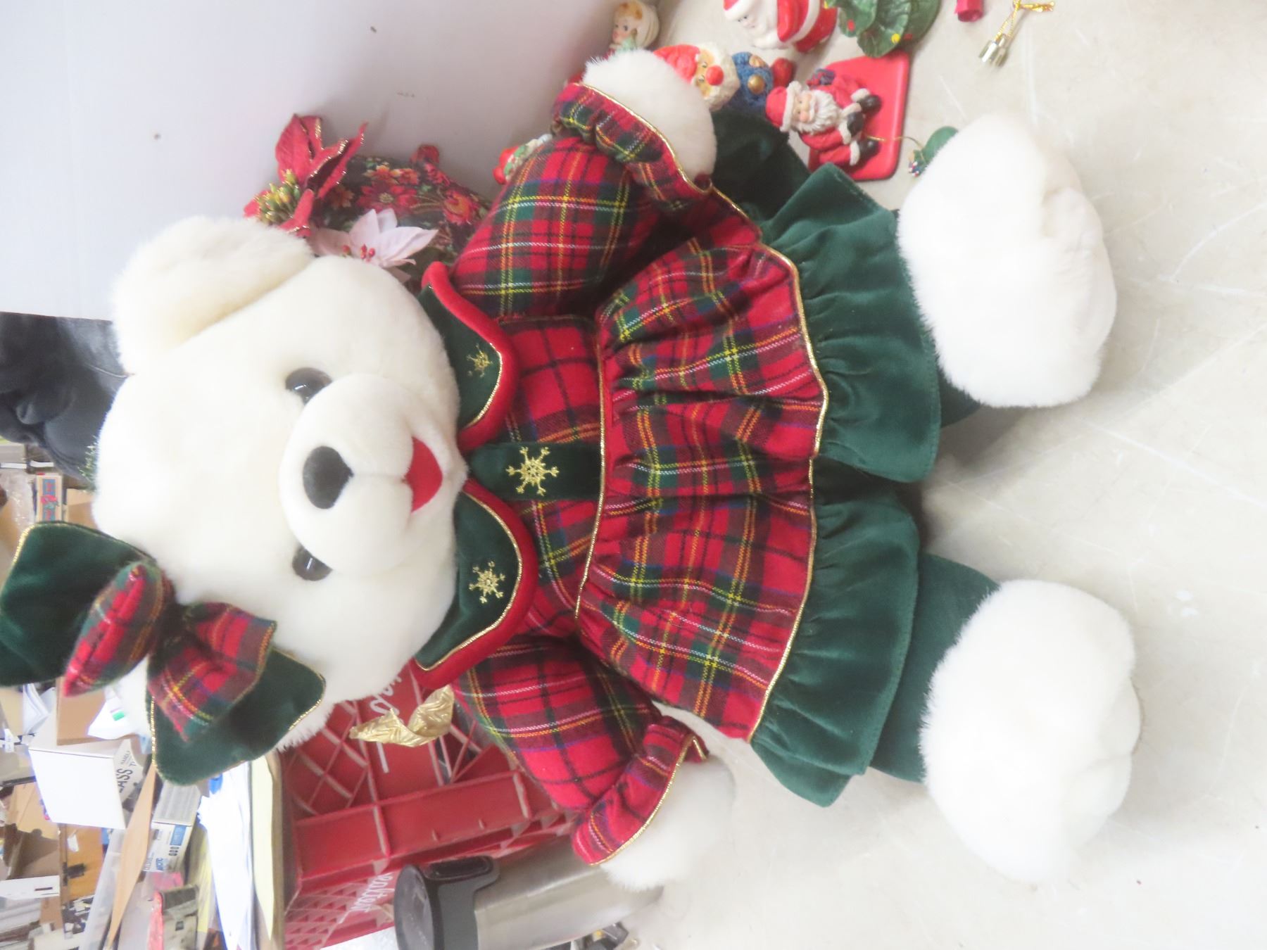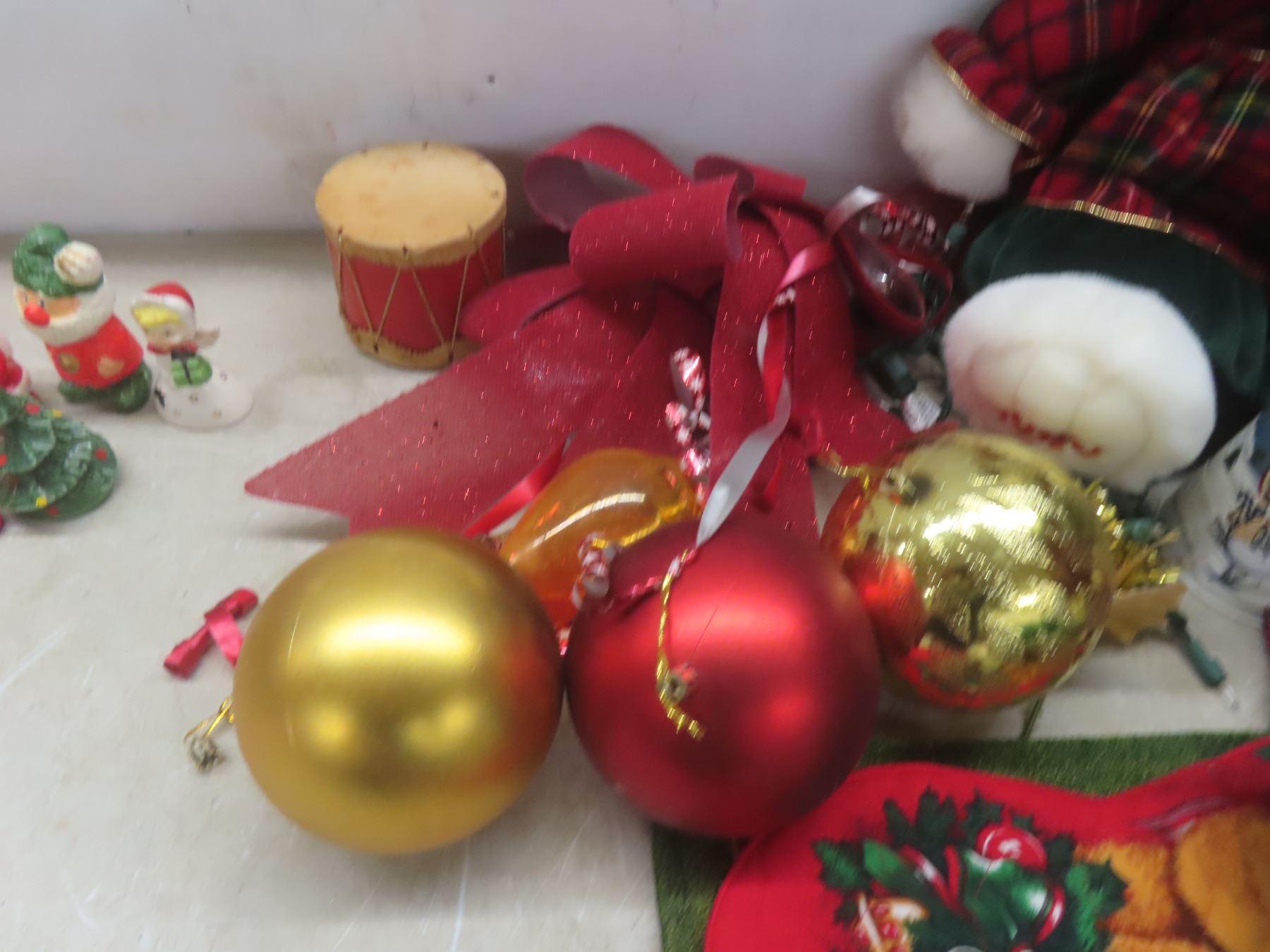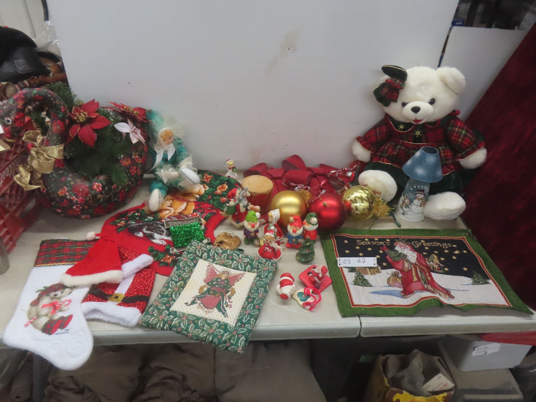 Christmas Décor Lot Including Candle Holder, Stuffed Bear, and More
