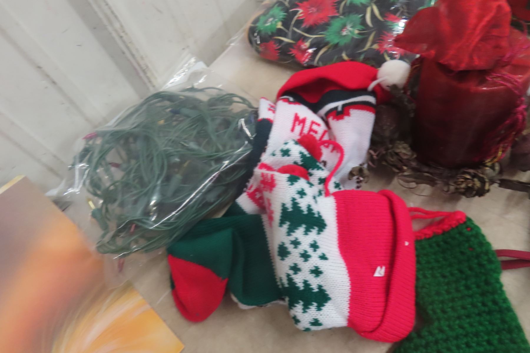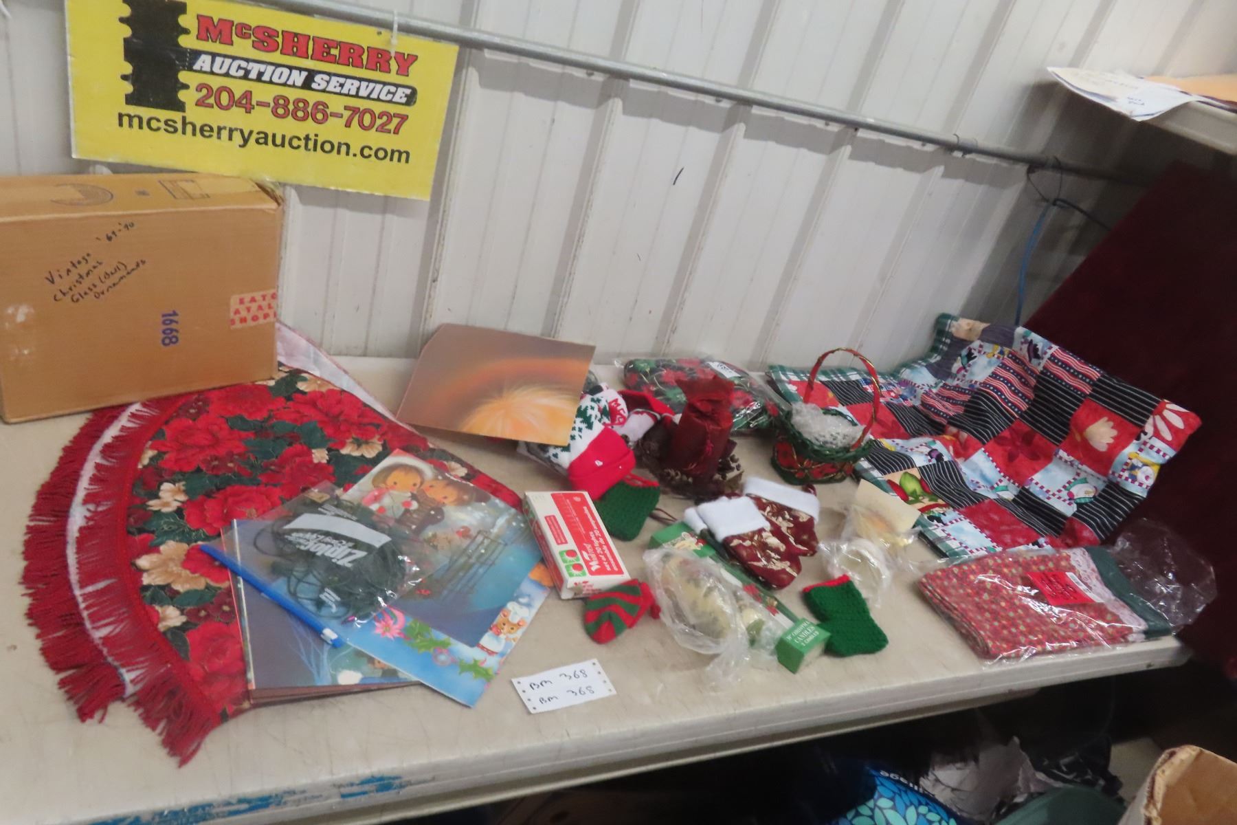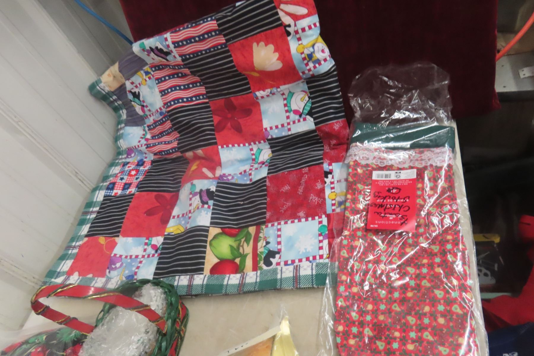 Christmas Tree Skirt, Handmade Quilt, Four Stockings, and Variety of Christmas Decorations
