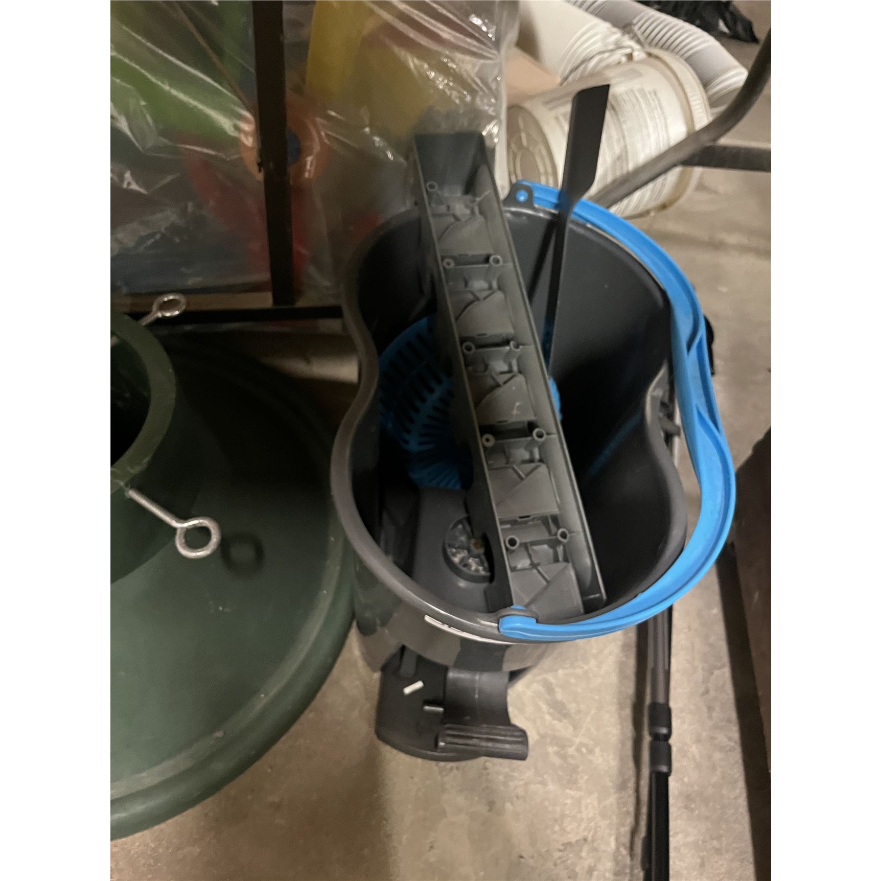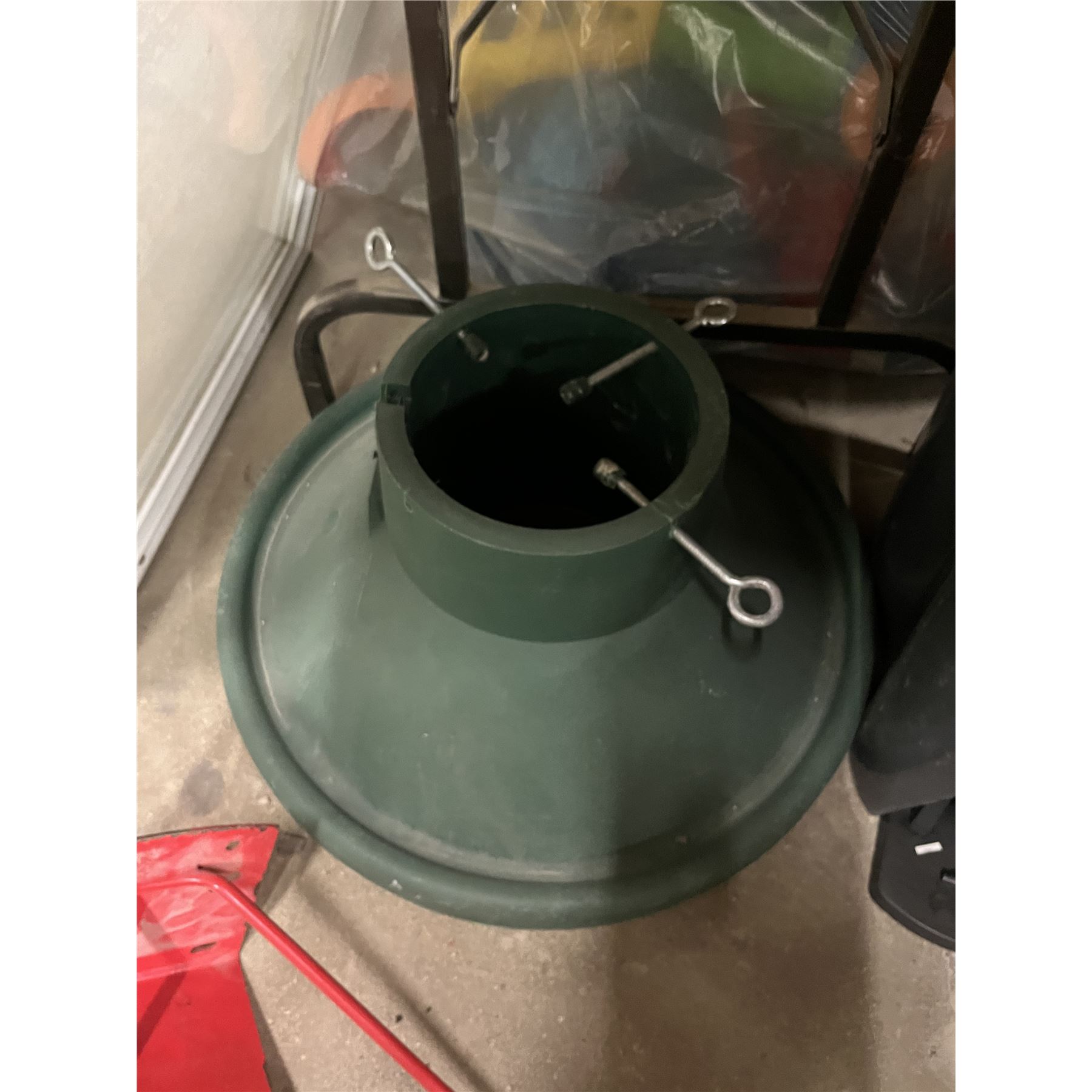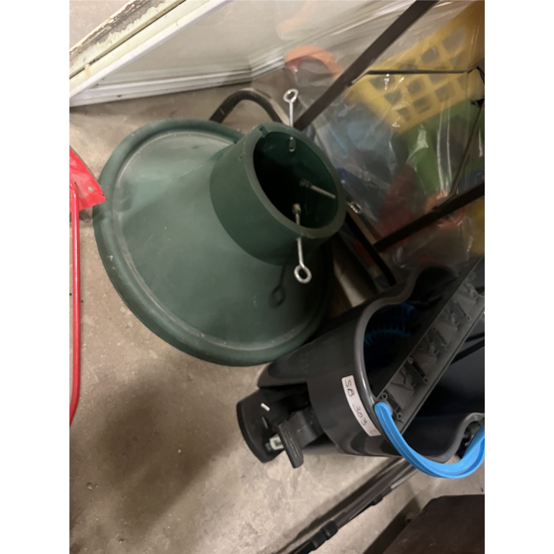 Christmas Tree Stand 22'' Diameter, Broom/Mop Holder, New 22'' Lawn Mower Blade, Wringer Mop Pail (Missing a Gear, Doesn’t Spin)