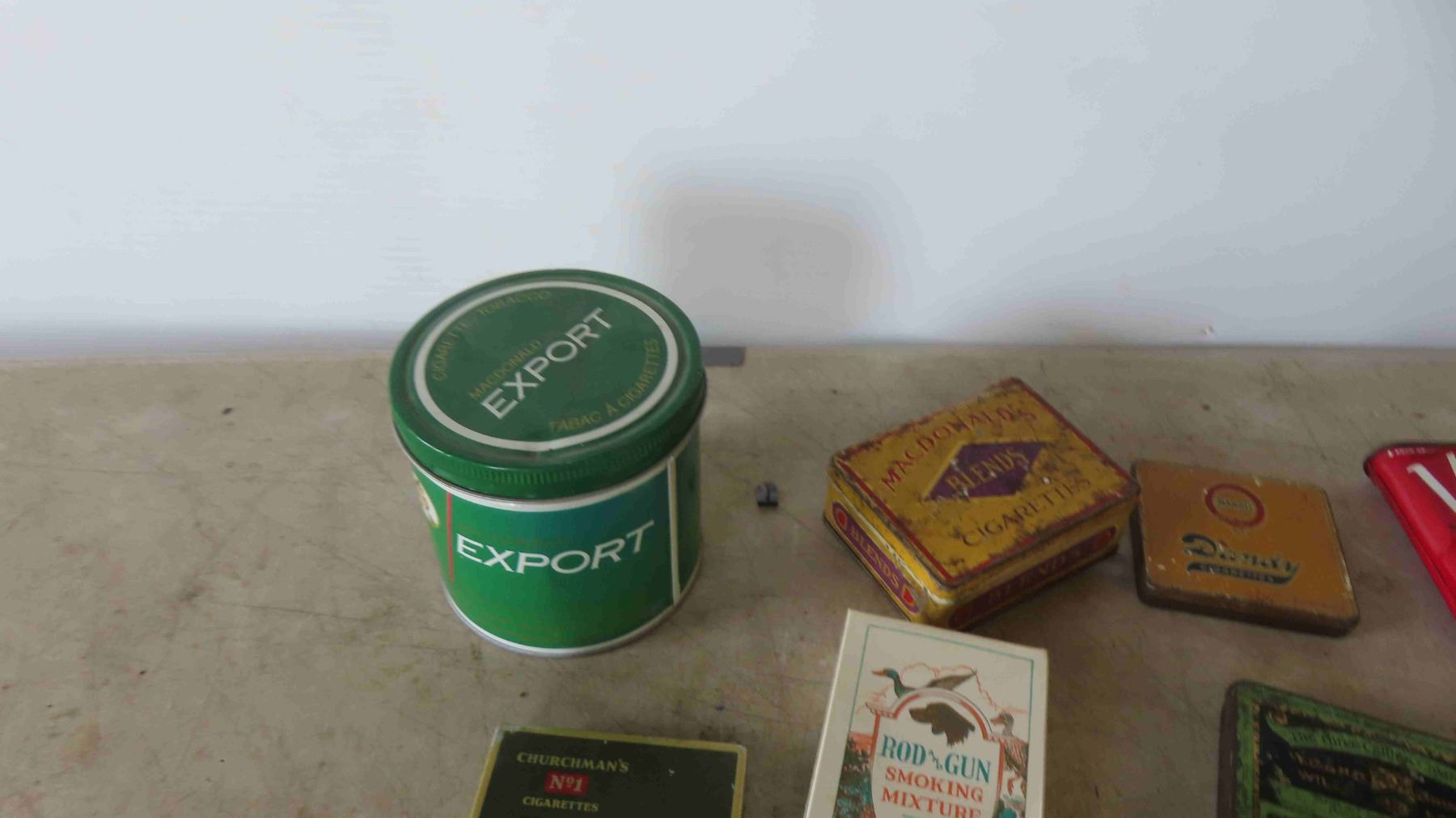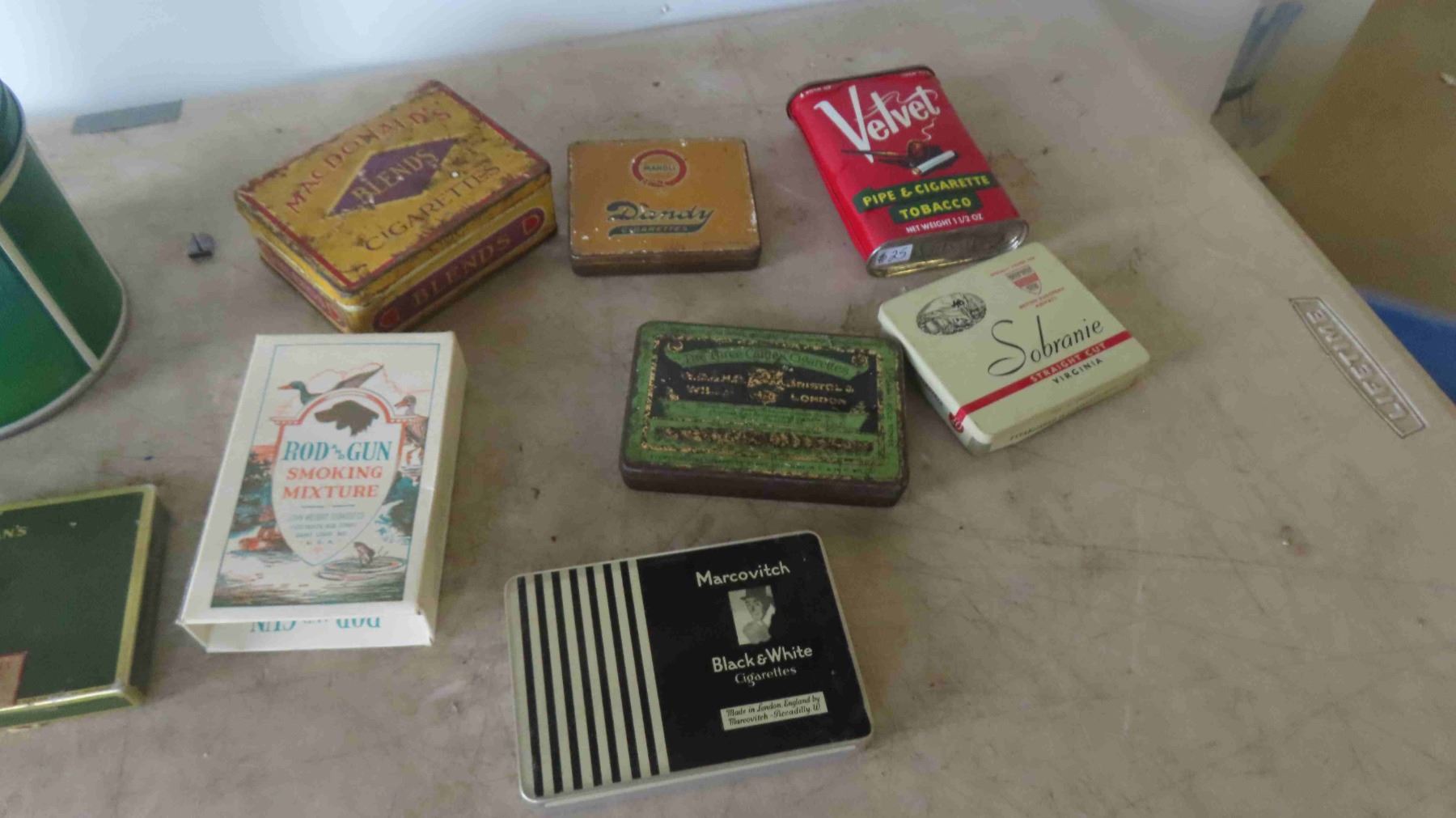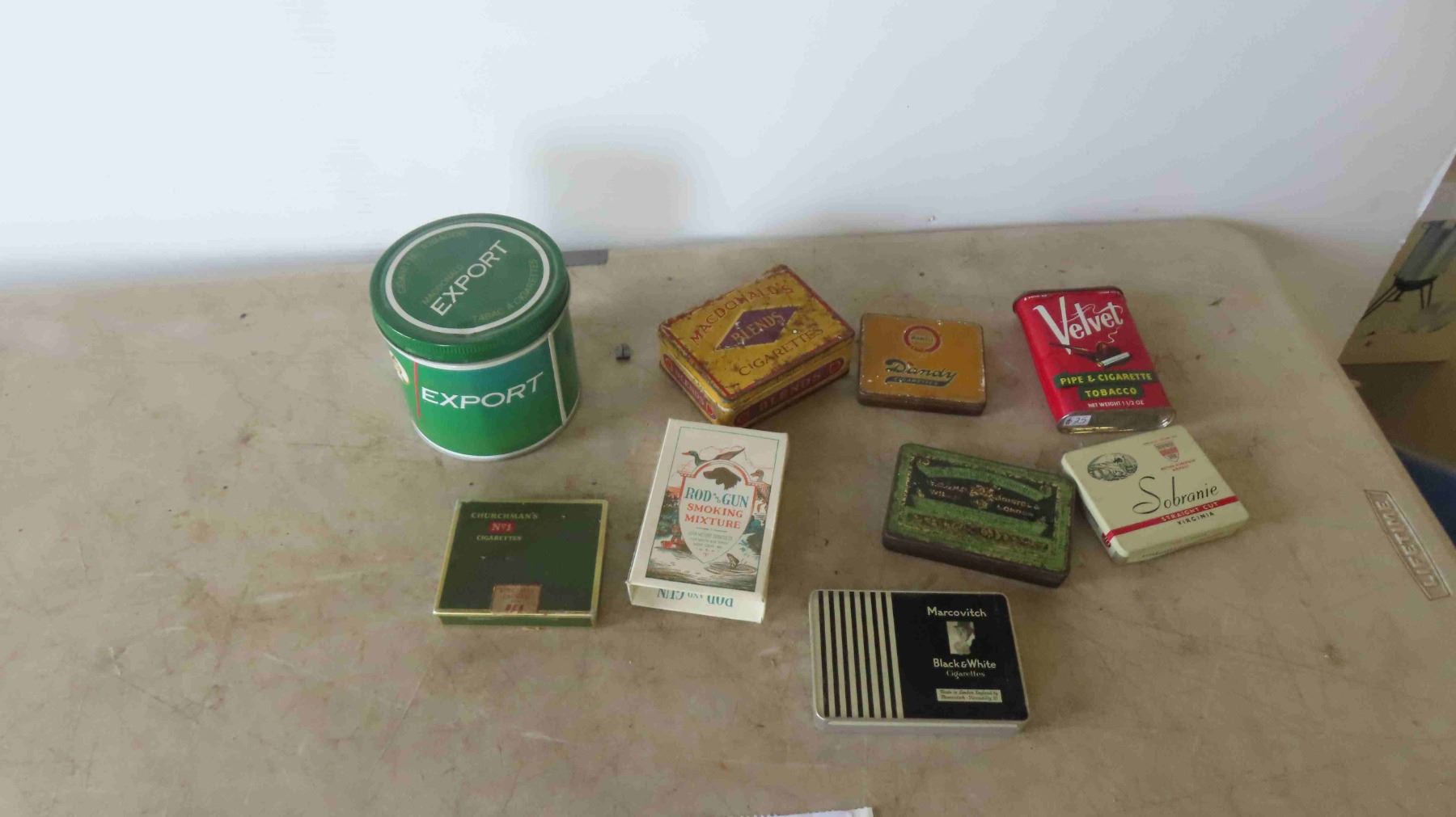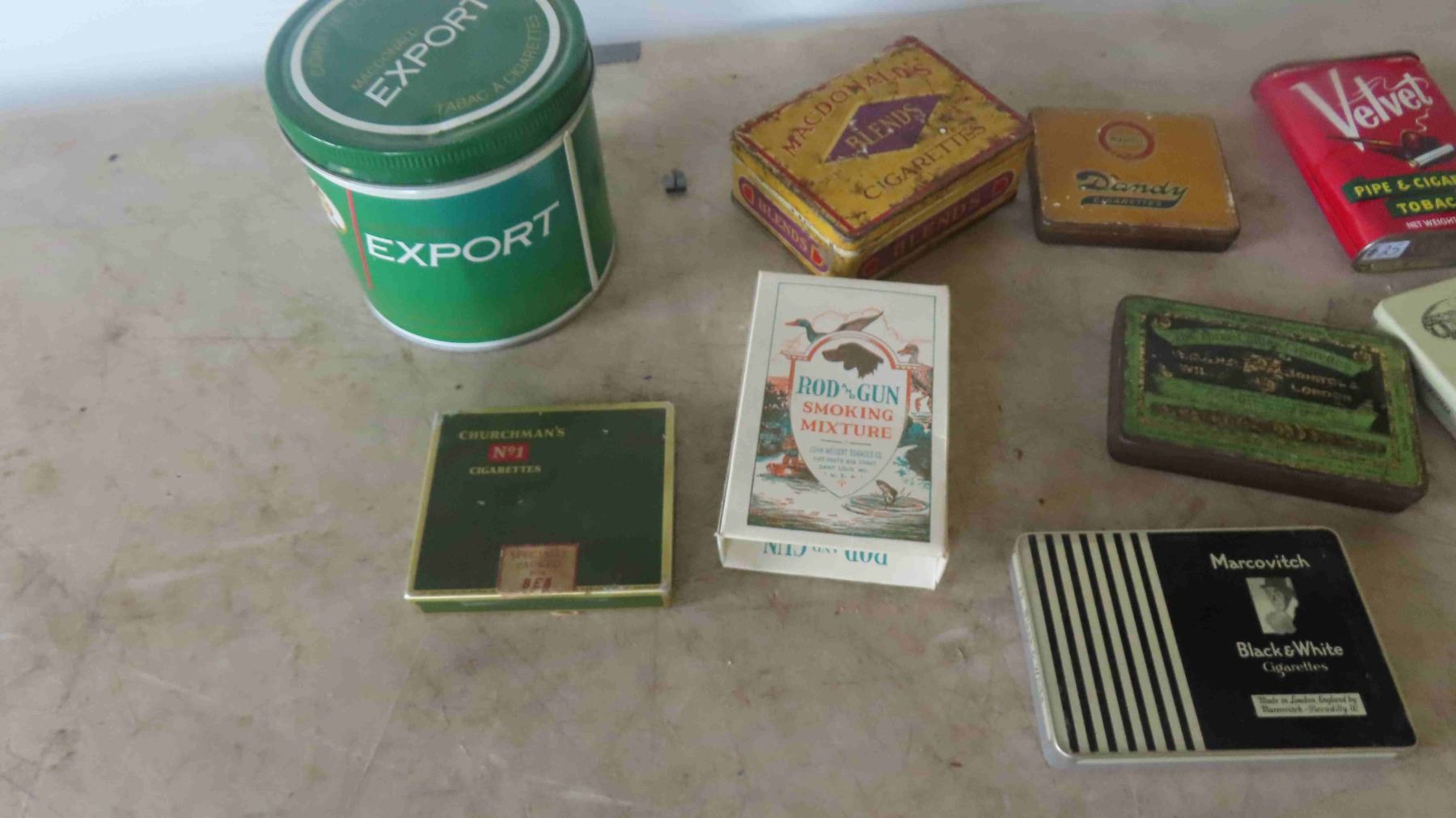 Cigarette & Tobacco Tins: Export, Velvet, Rod and Gun, Marcovitch, Dandy, Plus