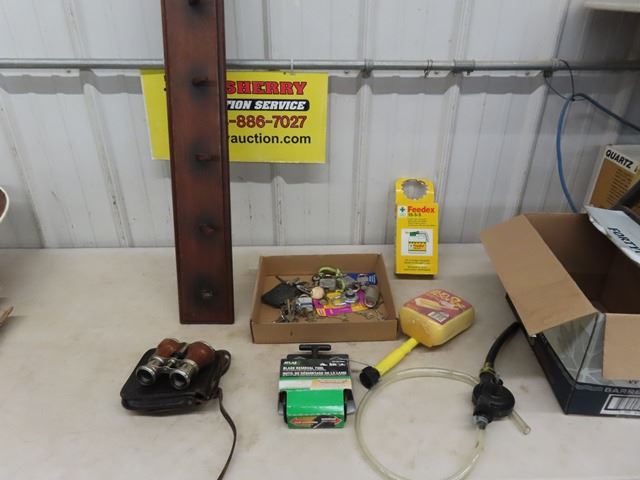 Coat Rack 48", Binoculars, Mower Blade Removal Tool, Box with Locs +