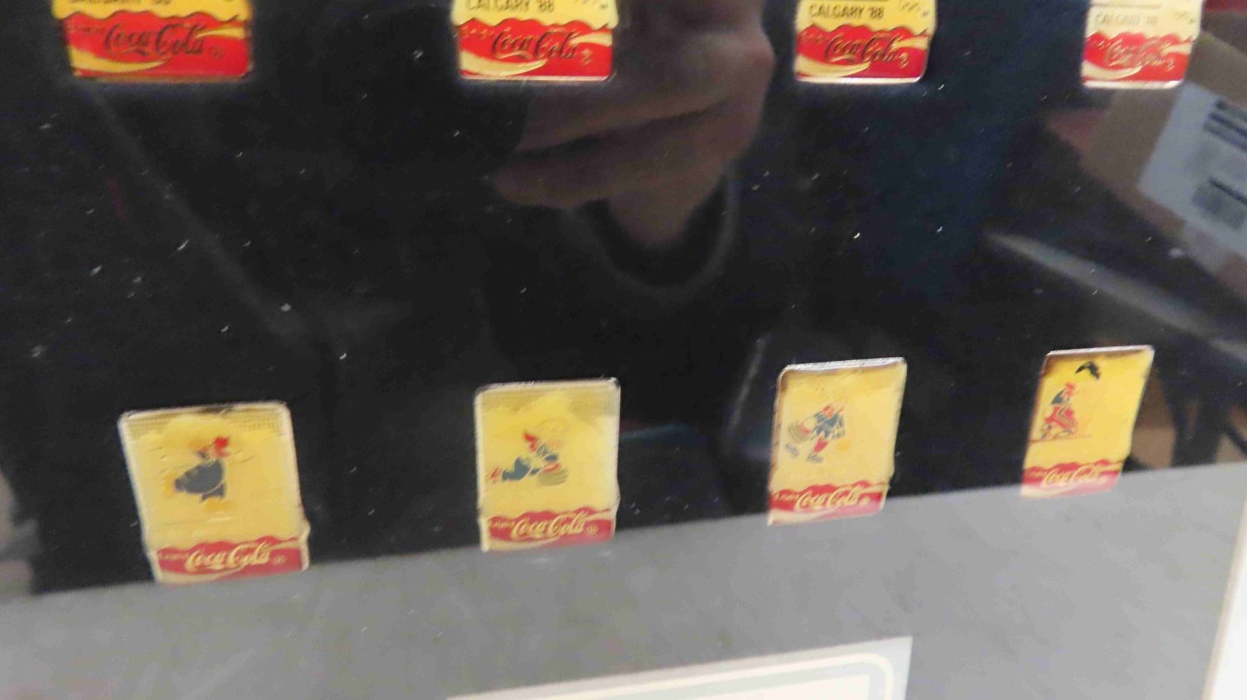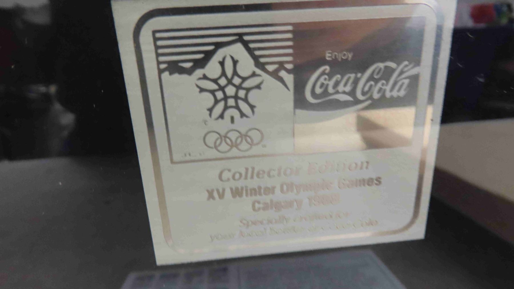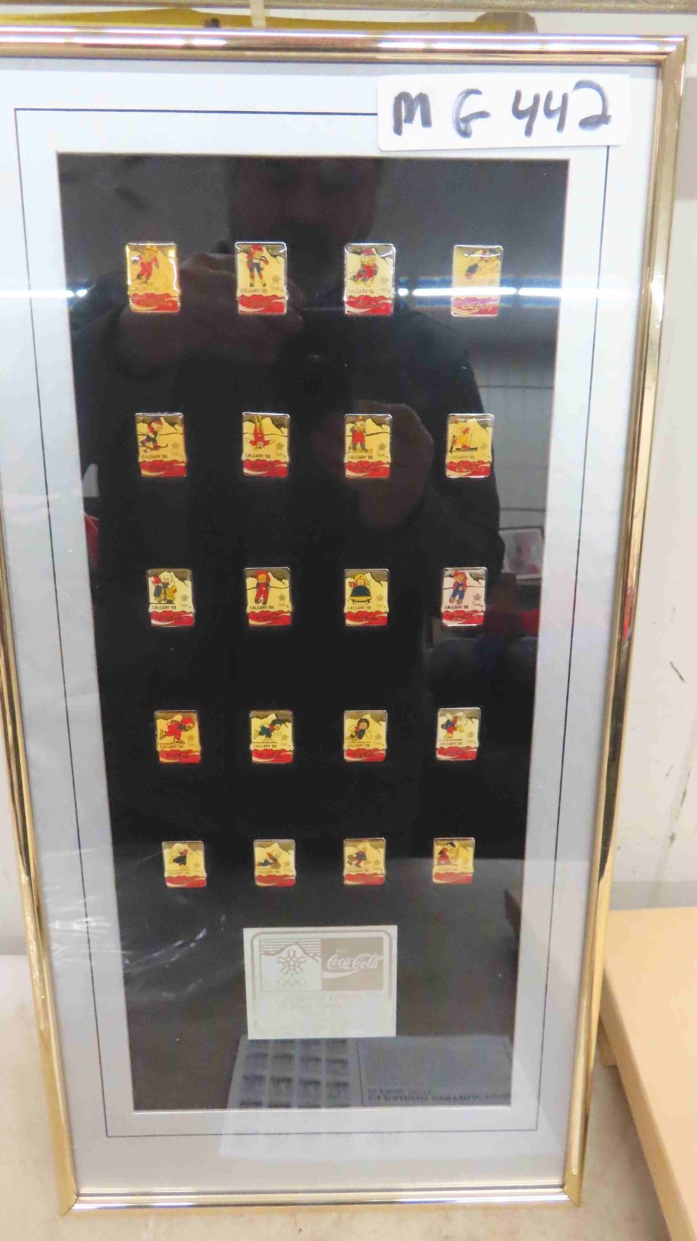 CocaCola Collector Edition XV Winter Olympic Games Calgary 1988 Framed Pin Display 10'' x 20''