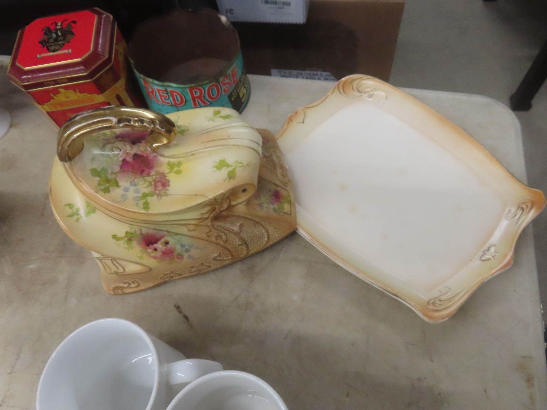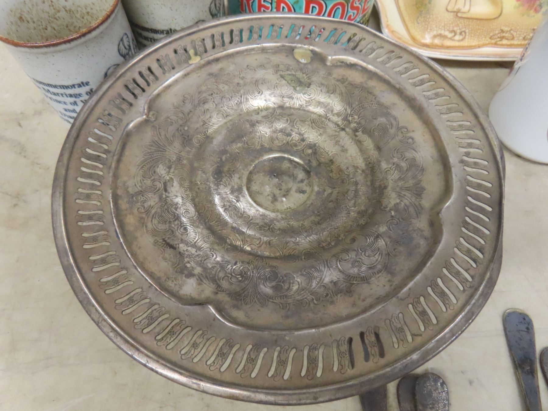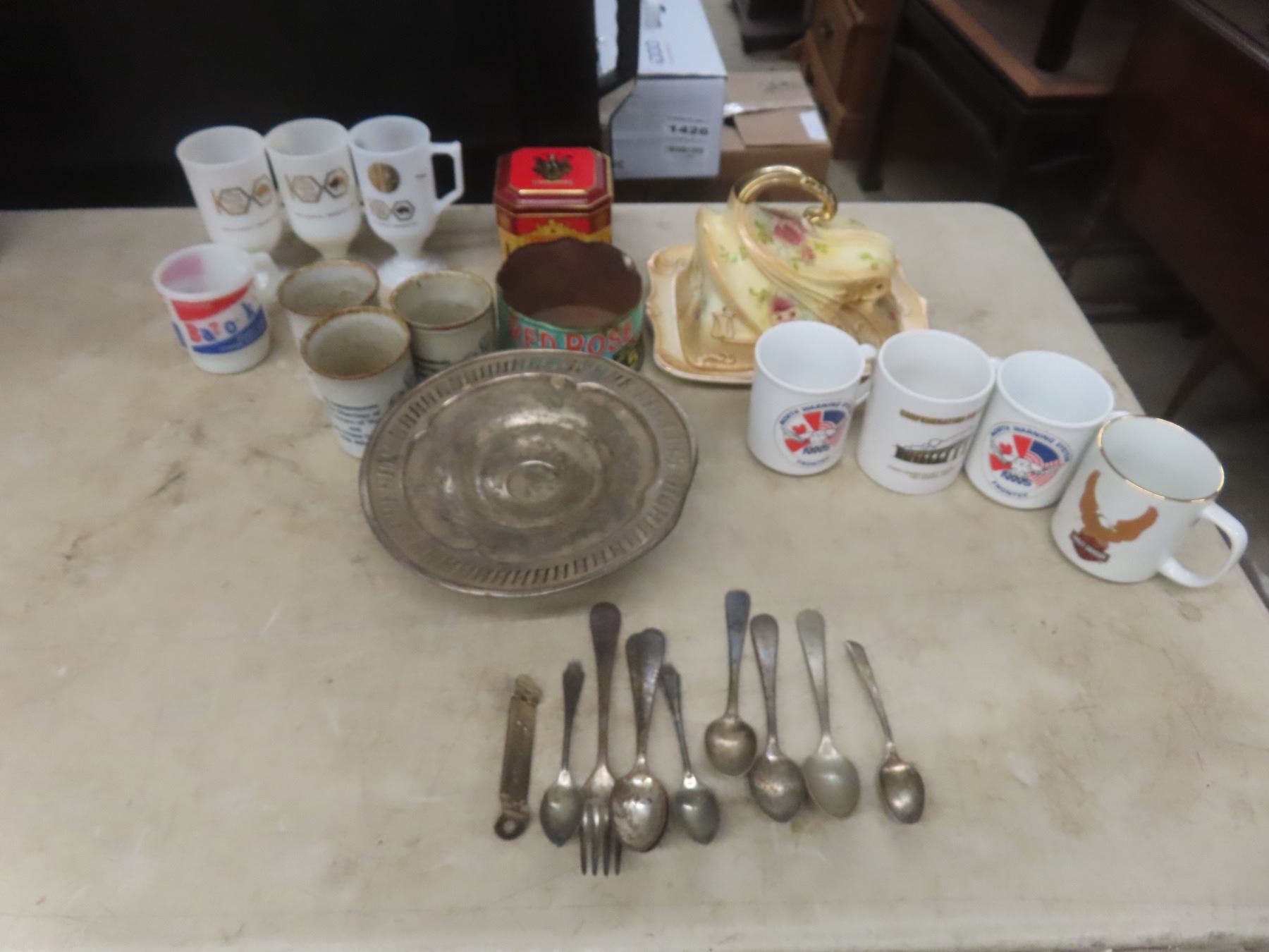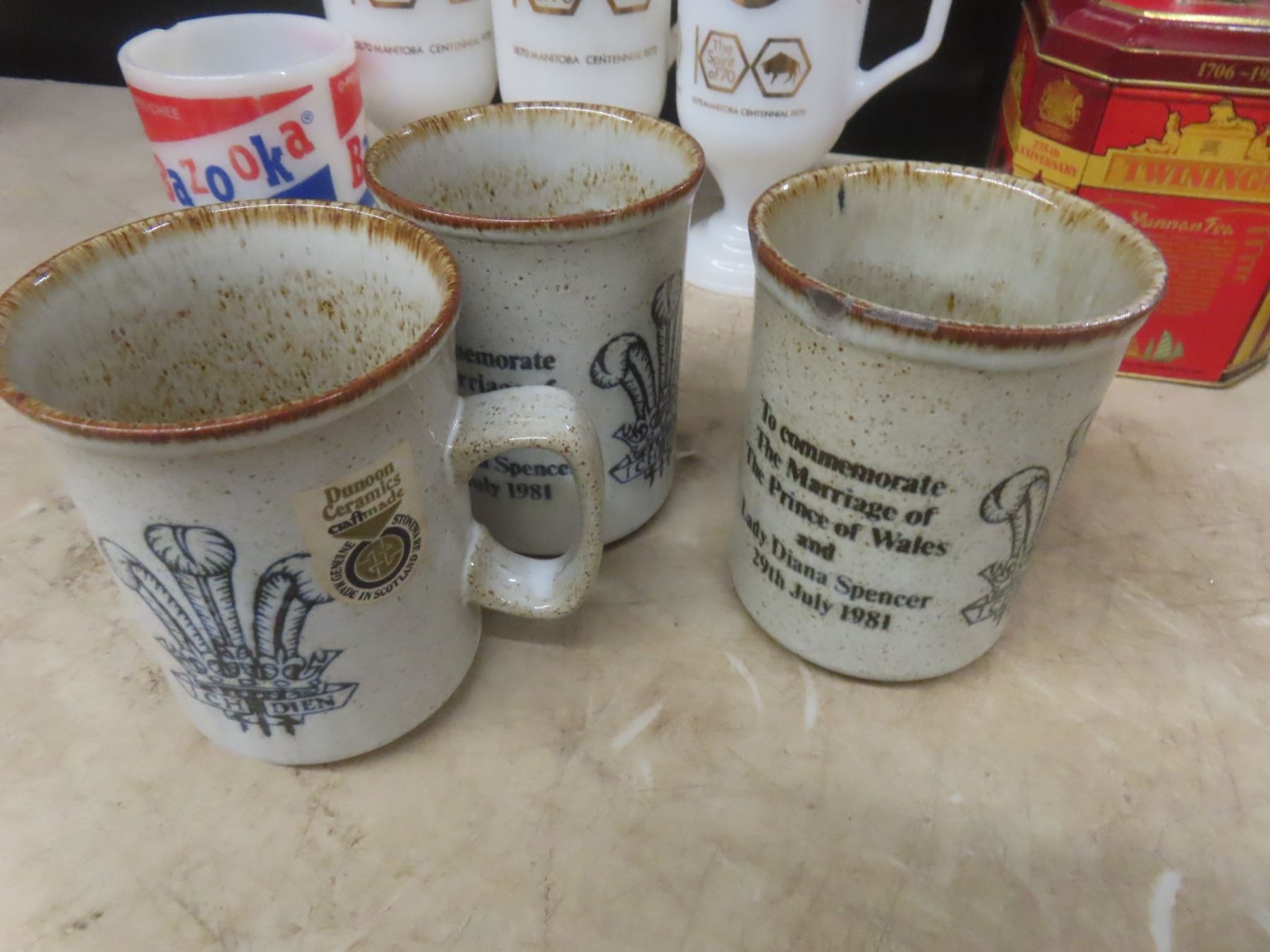 Coffee Mugs Bazooka Fire King, Royal Wedding 2 Piece China Cheese Plate, Footed Tray and 9 Pieces Silverware