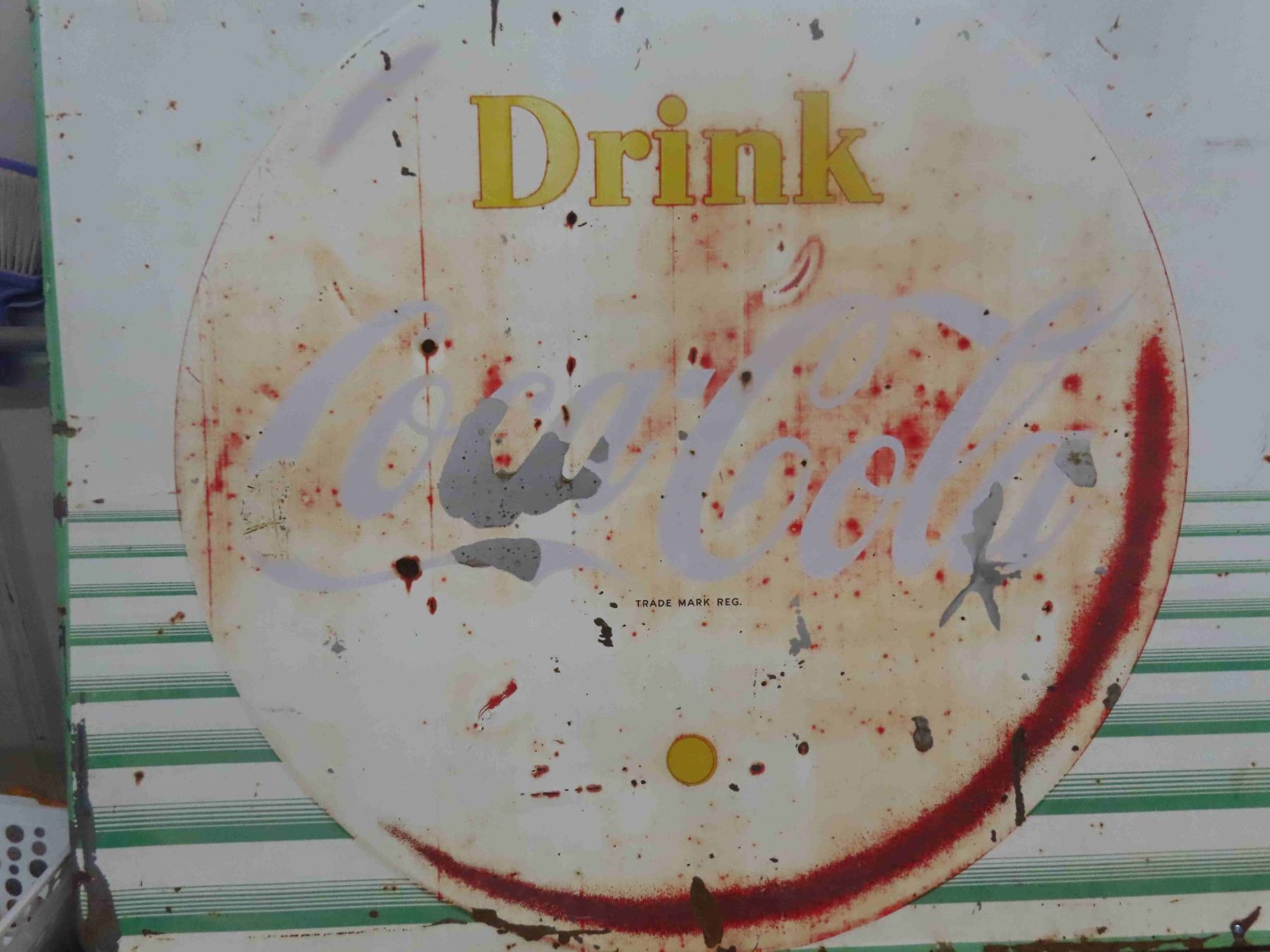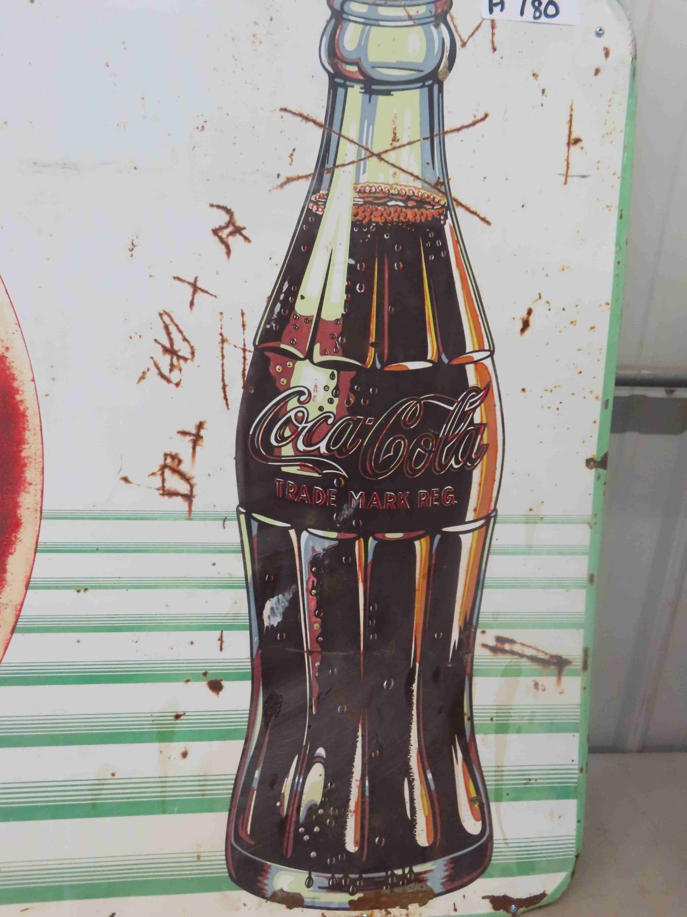 Coke Metal Embossed Sign 35" x 59" - Faded But Cool Graphics of Bottle - Vintage