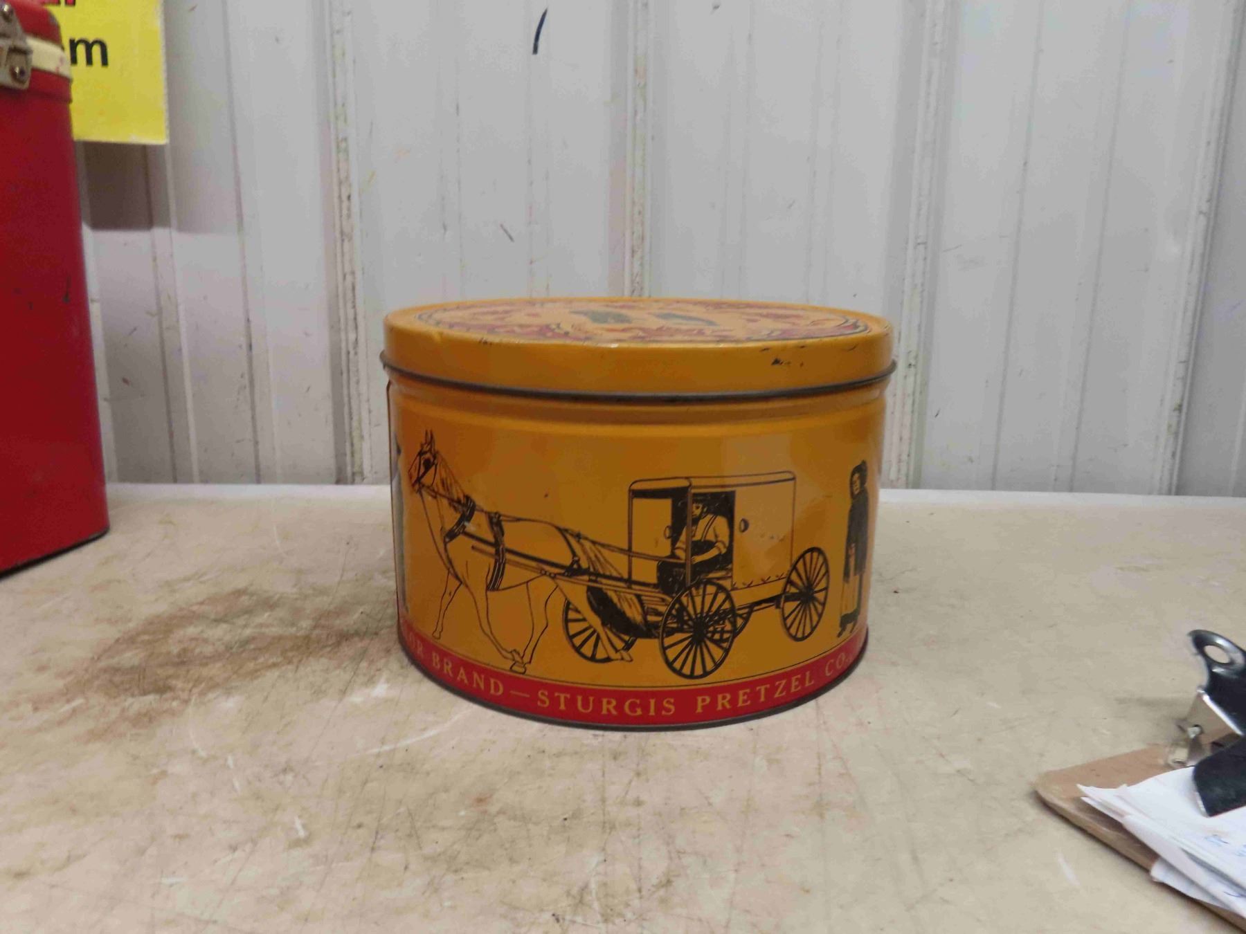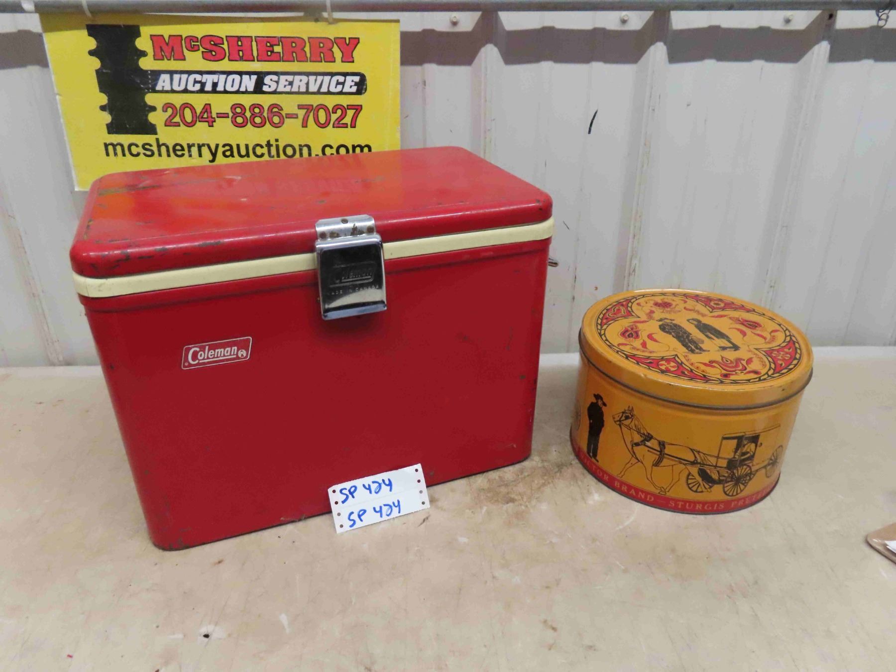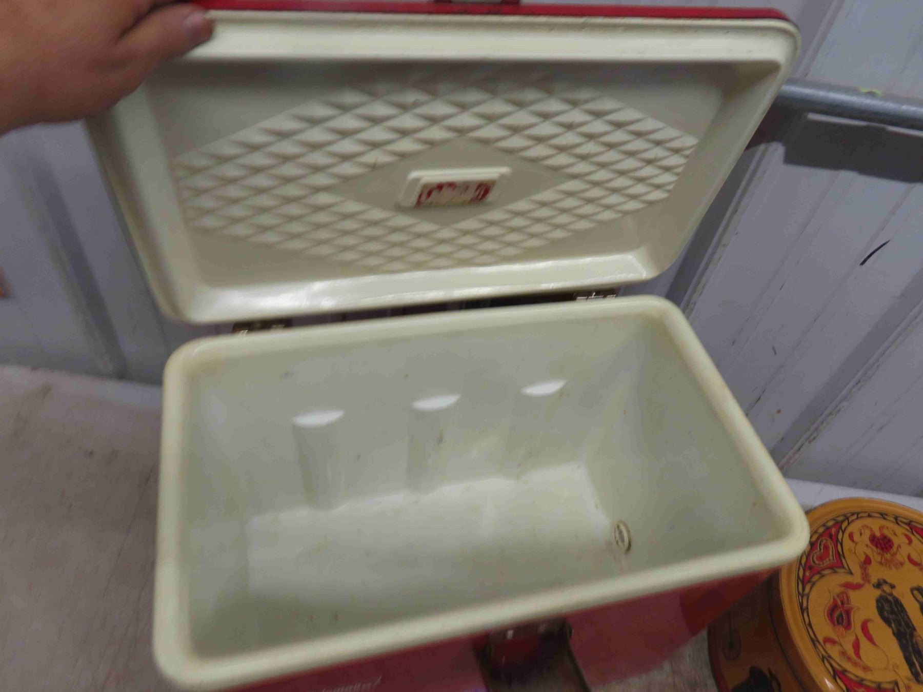 Coleman Picnic Cooler 13 1/2'' x 18'' x 10'' , Sturgis Pretzel Tin with Amish Graphics 6 1/2'' High x 10'' Across