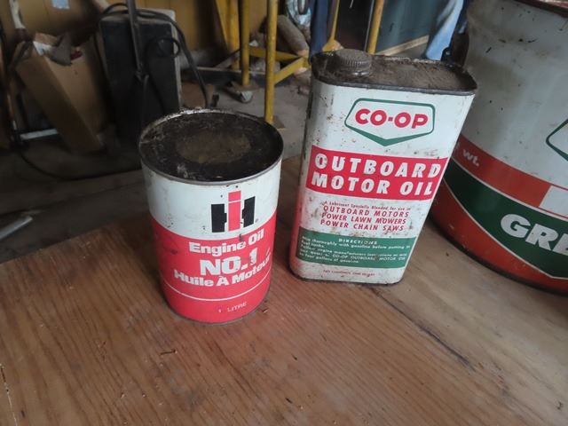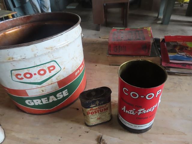Coop 25LB Grease Pail, COOP Outboard Motor Oil, Coop Antifreze, International Quart Can, Instant Postum Canada