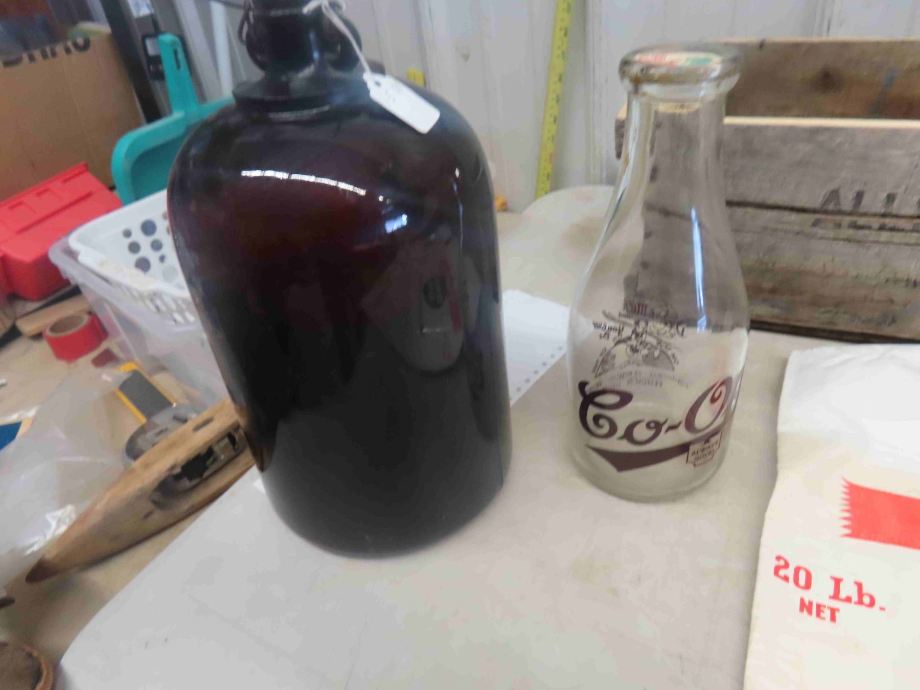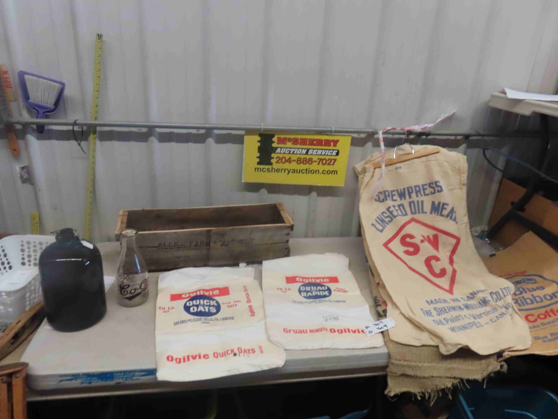 Coop Milk Bottle, Glass Jug, Ogilvie Flour, Gunny Sack, Allied Crate