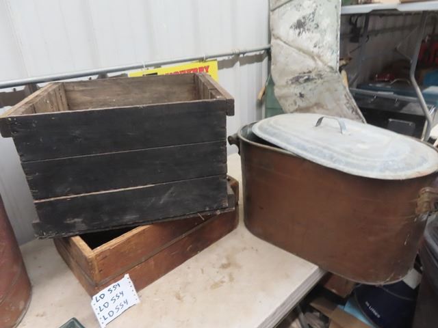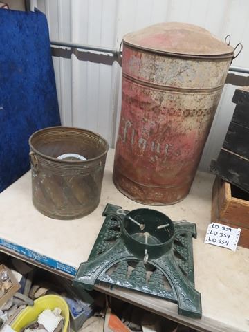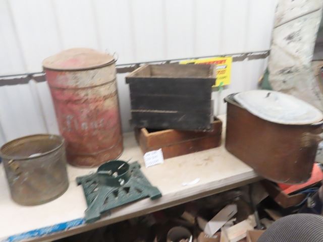 Copper Boiler, Flour Bin, Wooden Crates, Cast Christmas Tree Stand