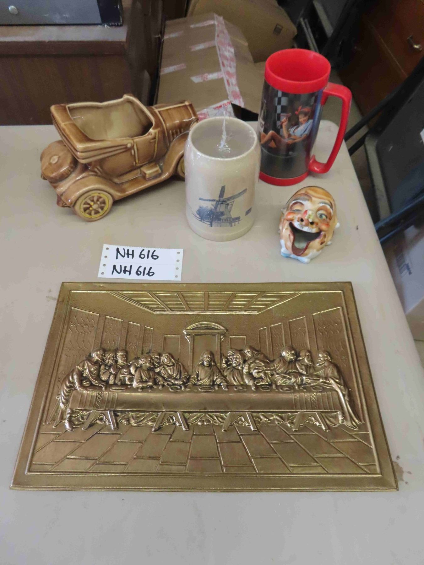 Copper Last Supper Picture, Snap On Cup, Old Man Face Ashtray, Car Planter, Stein