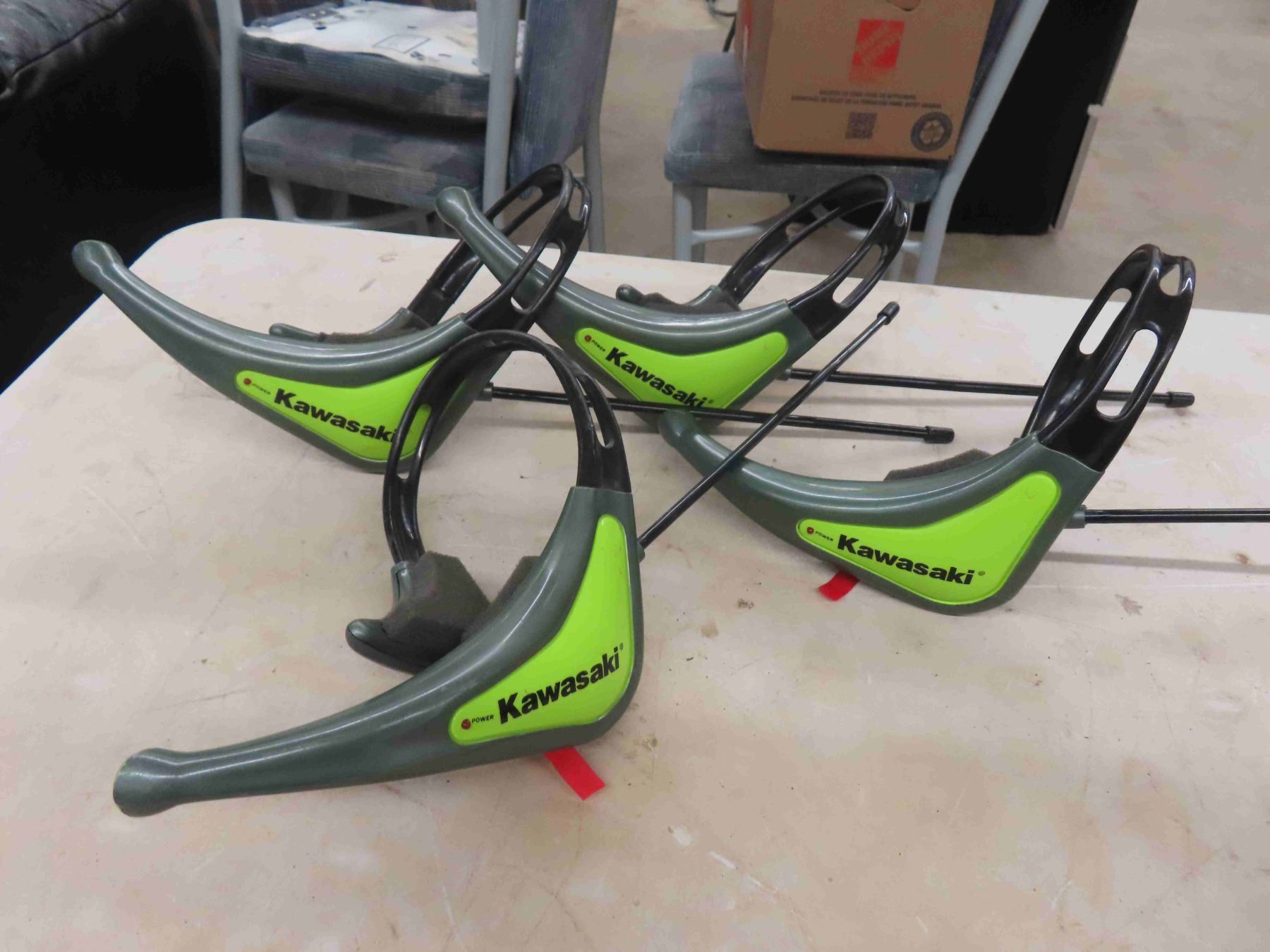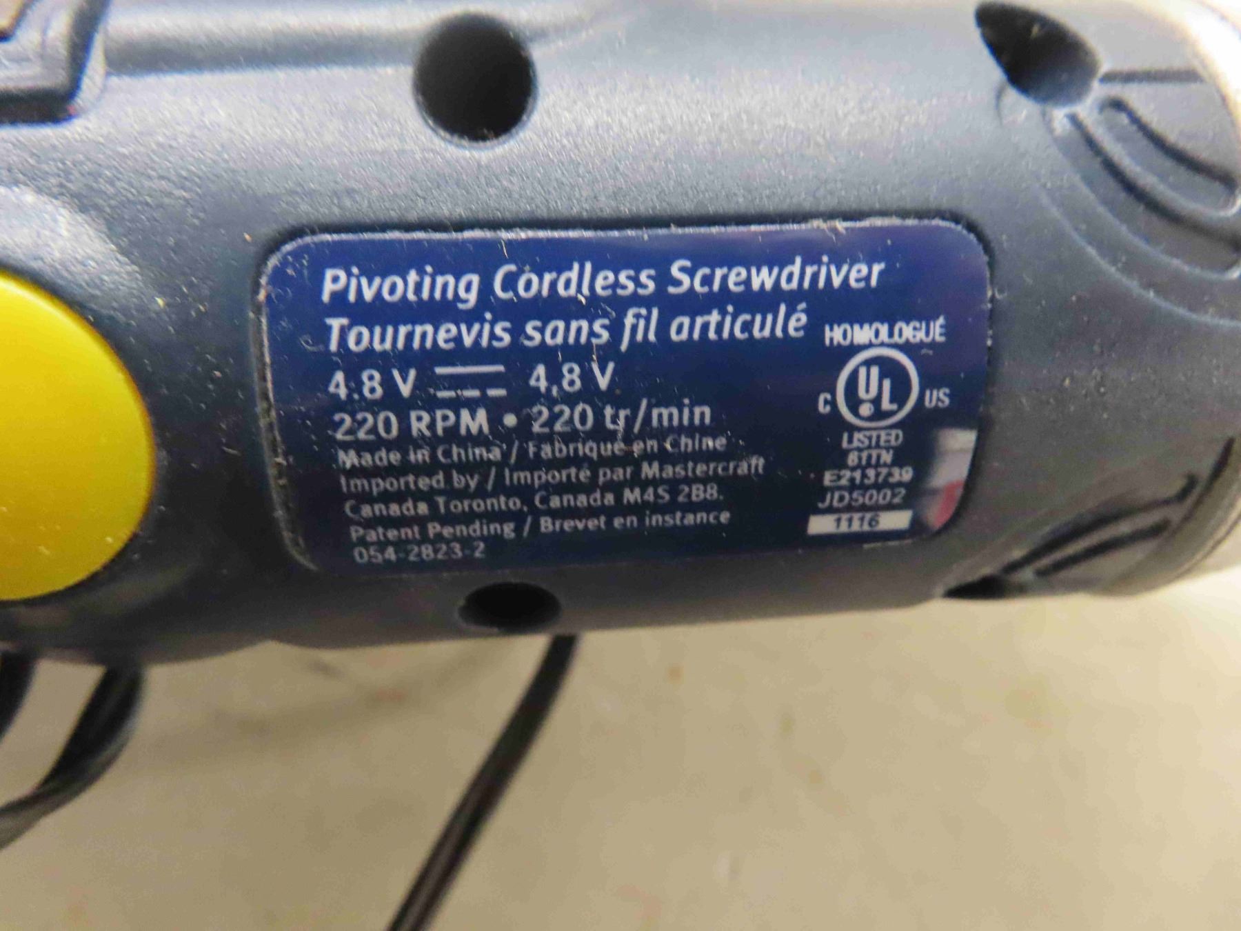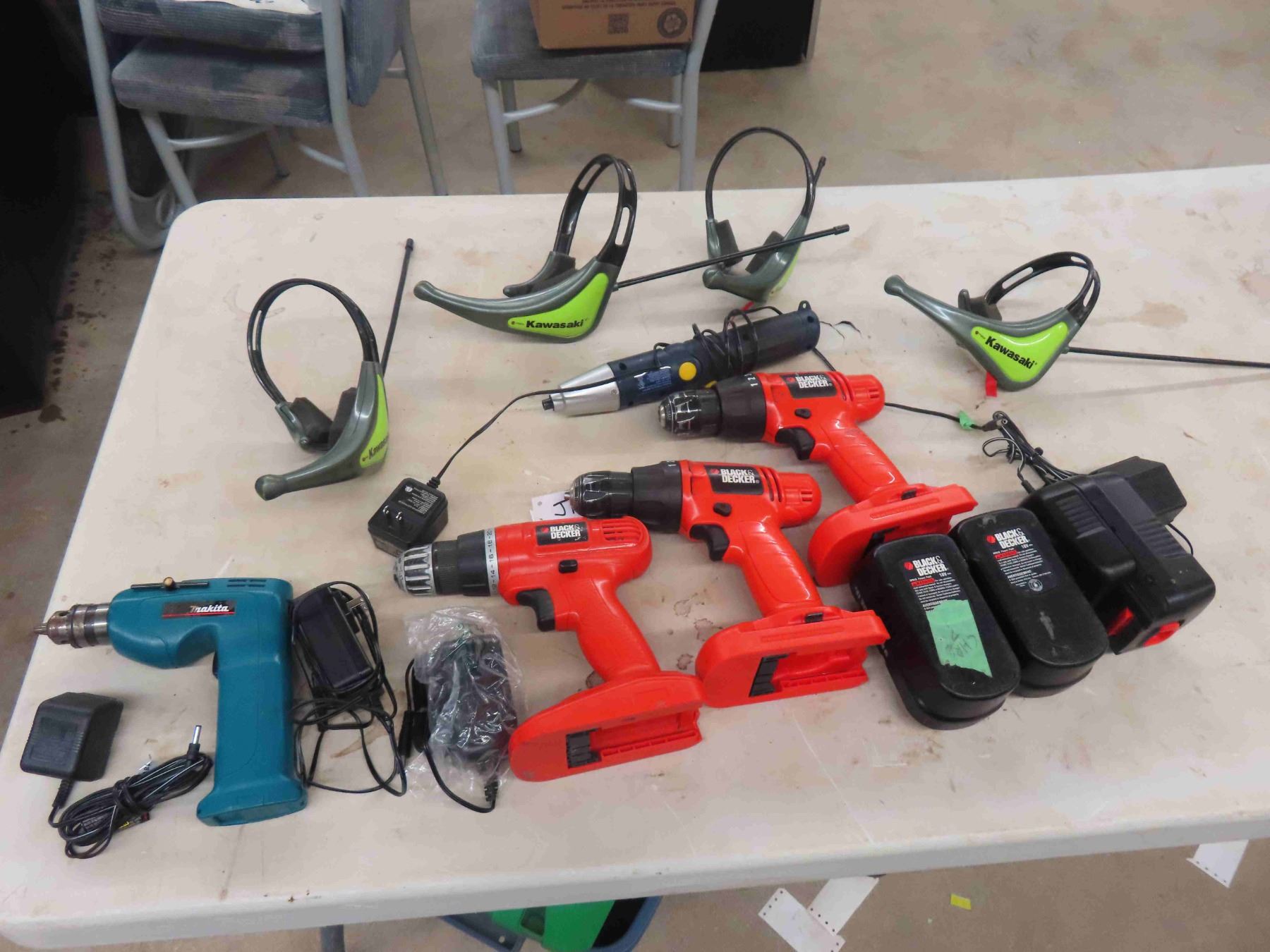 Cordless Tools : (3) Black and Decker 18V Drills , 3 Batteries, 1 Charger, Mastercraft 4.8V Screwdriver, Makita Screw Gun No Battery/Charger, 4 Kawasaki Head Sets