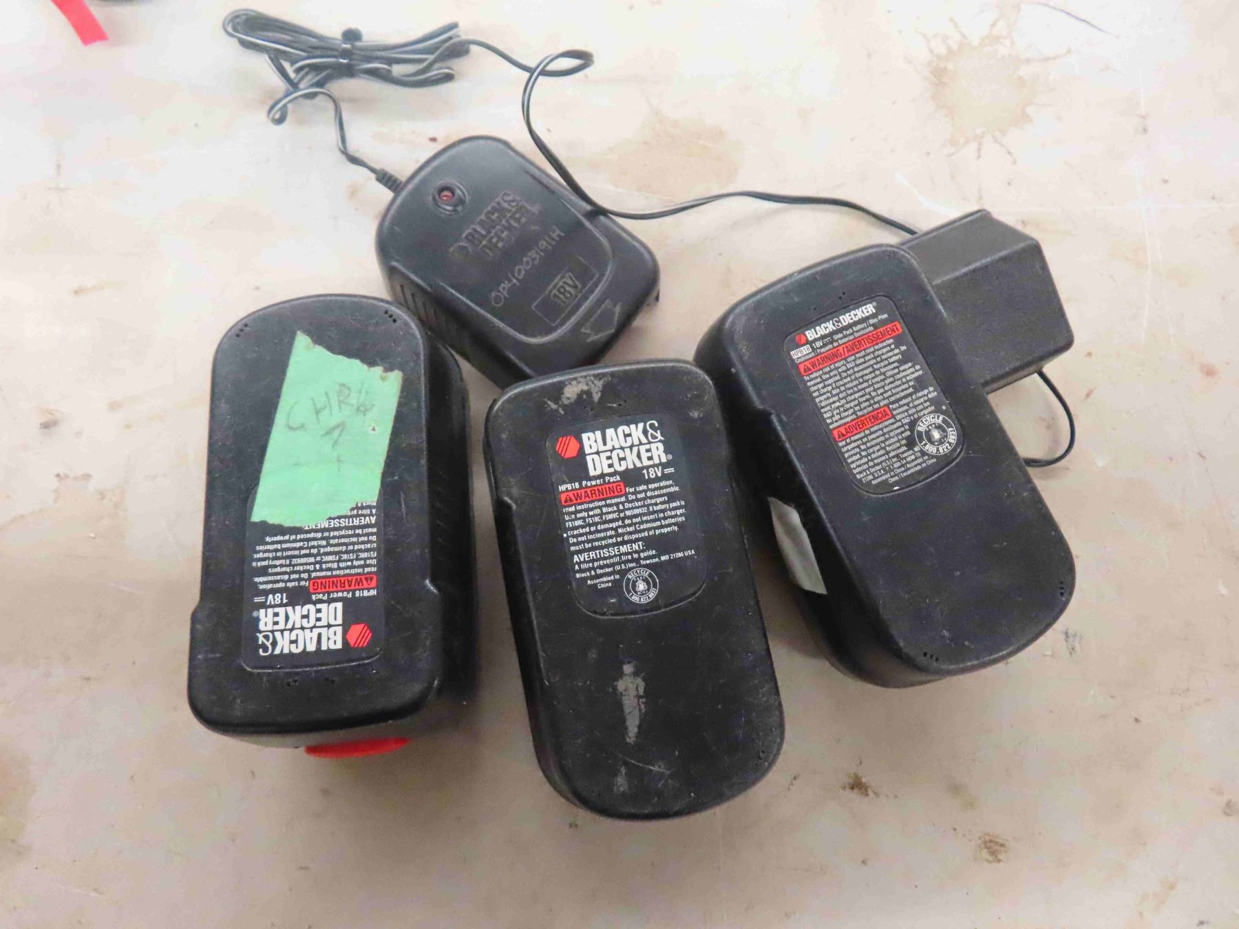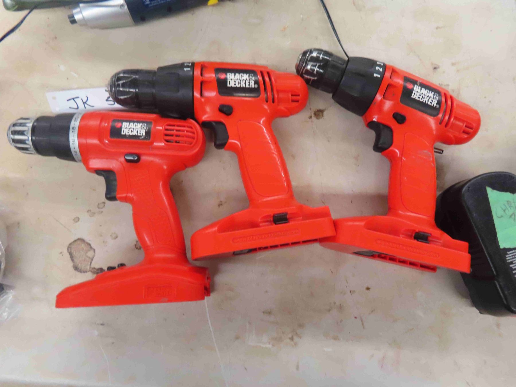 Cordless Tools : (3) Black and Decker 18V Drills , 3 Batteries, 1