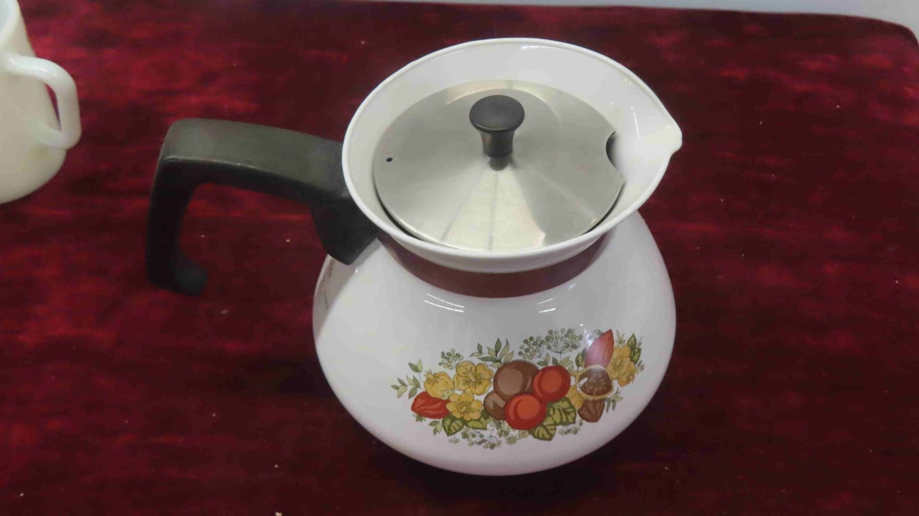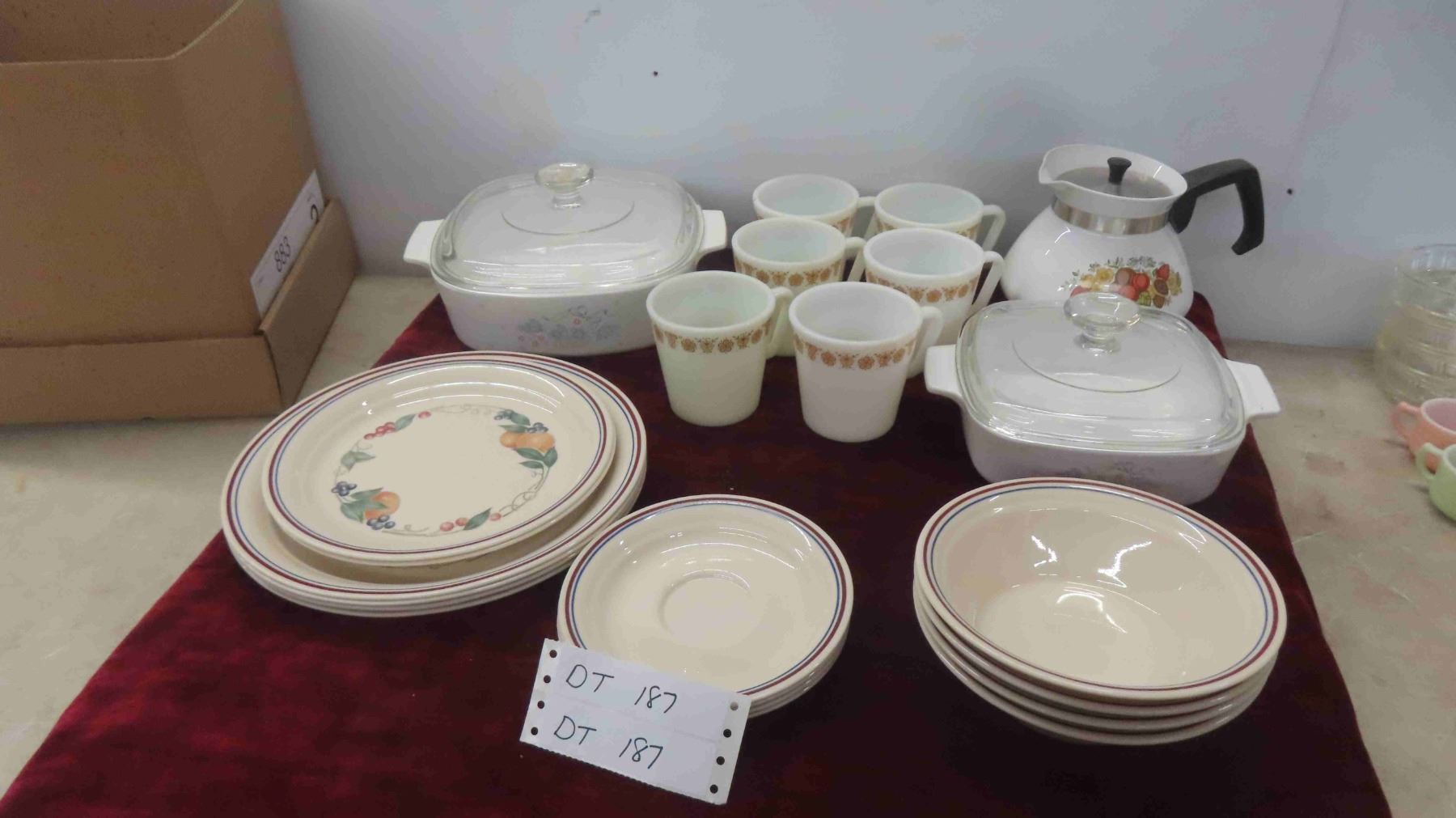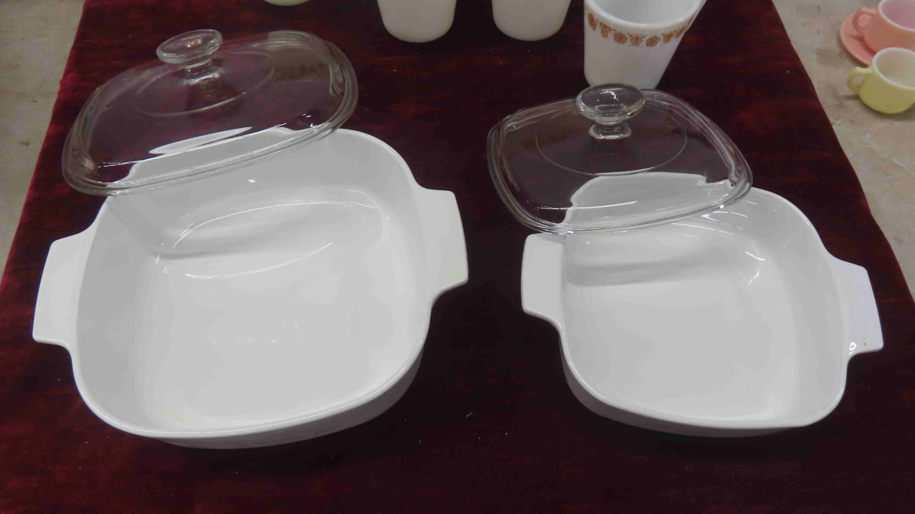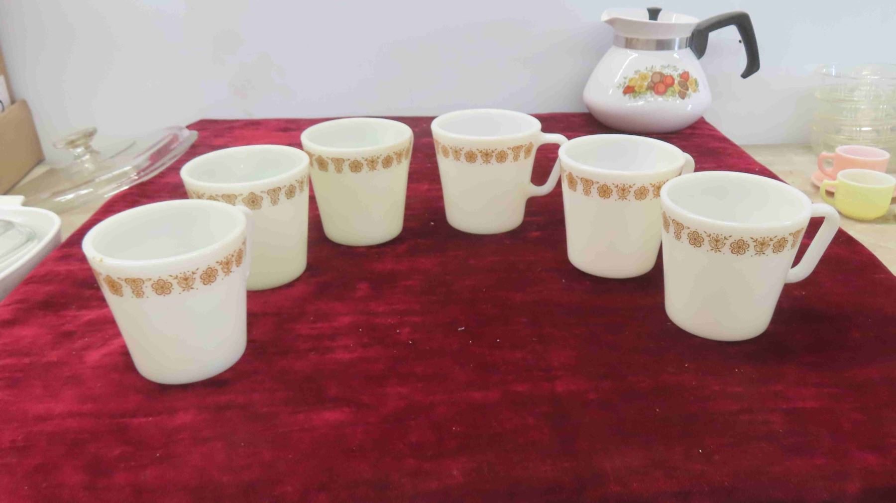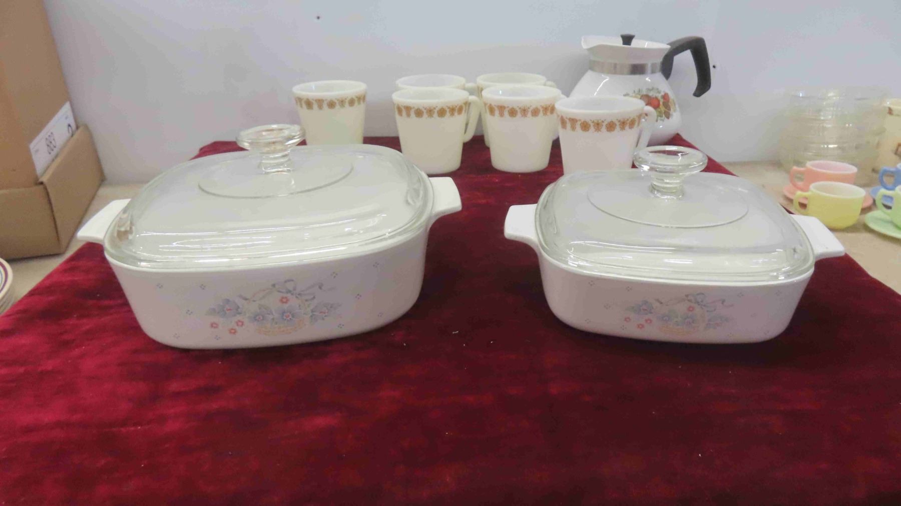 Corelle Dishes, Corningware Casseroles and Tea Pot, 6 Pyrex Coffee