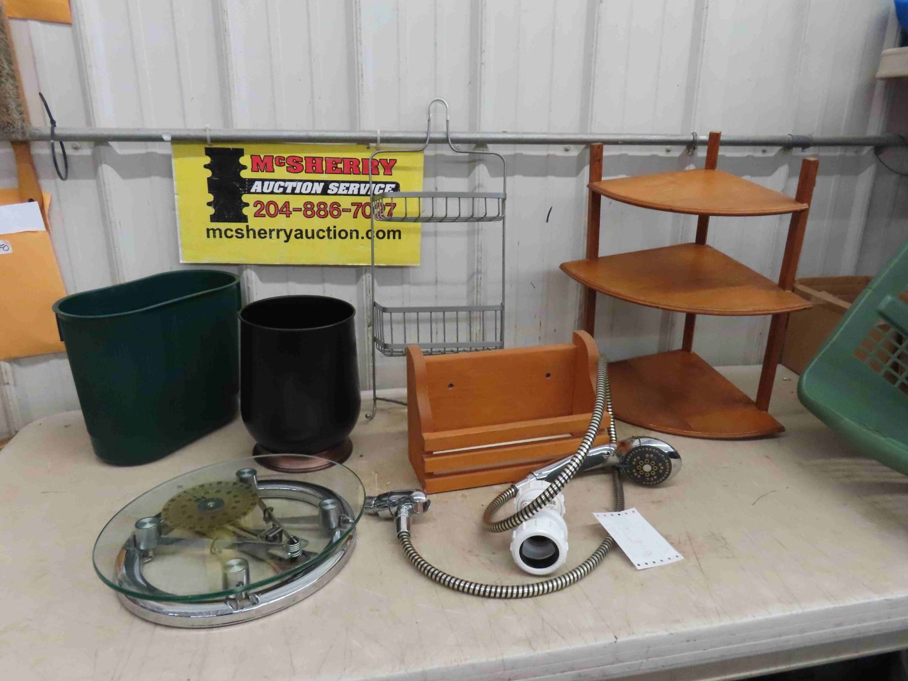 Corner Wood Shelf 12 1/4'' x 20'' , Shower Caddy Chrome+Glass Scale, Shower Wand, Metal Waste Paper Basket & More