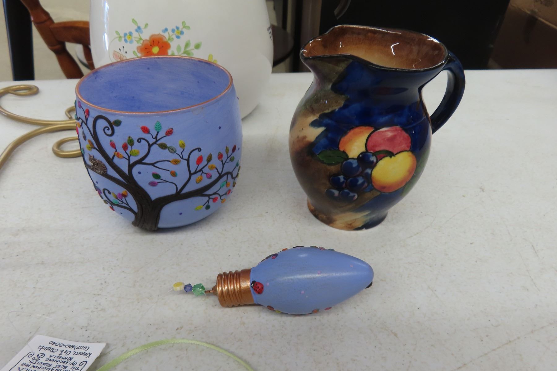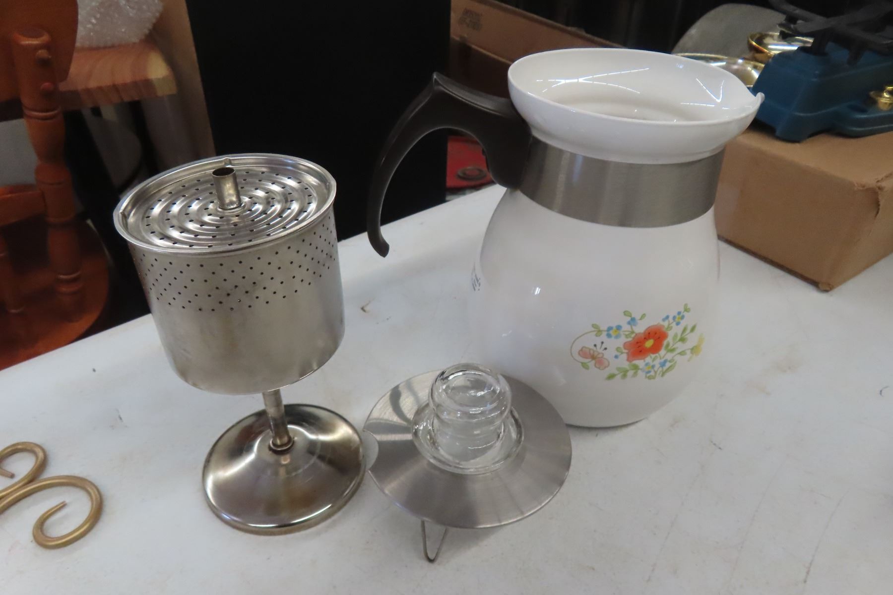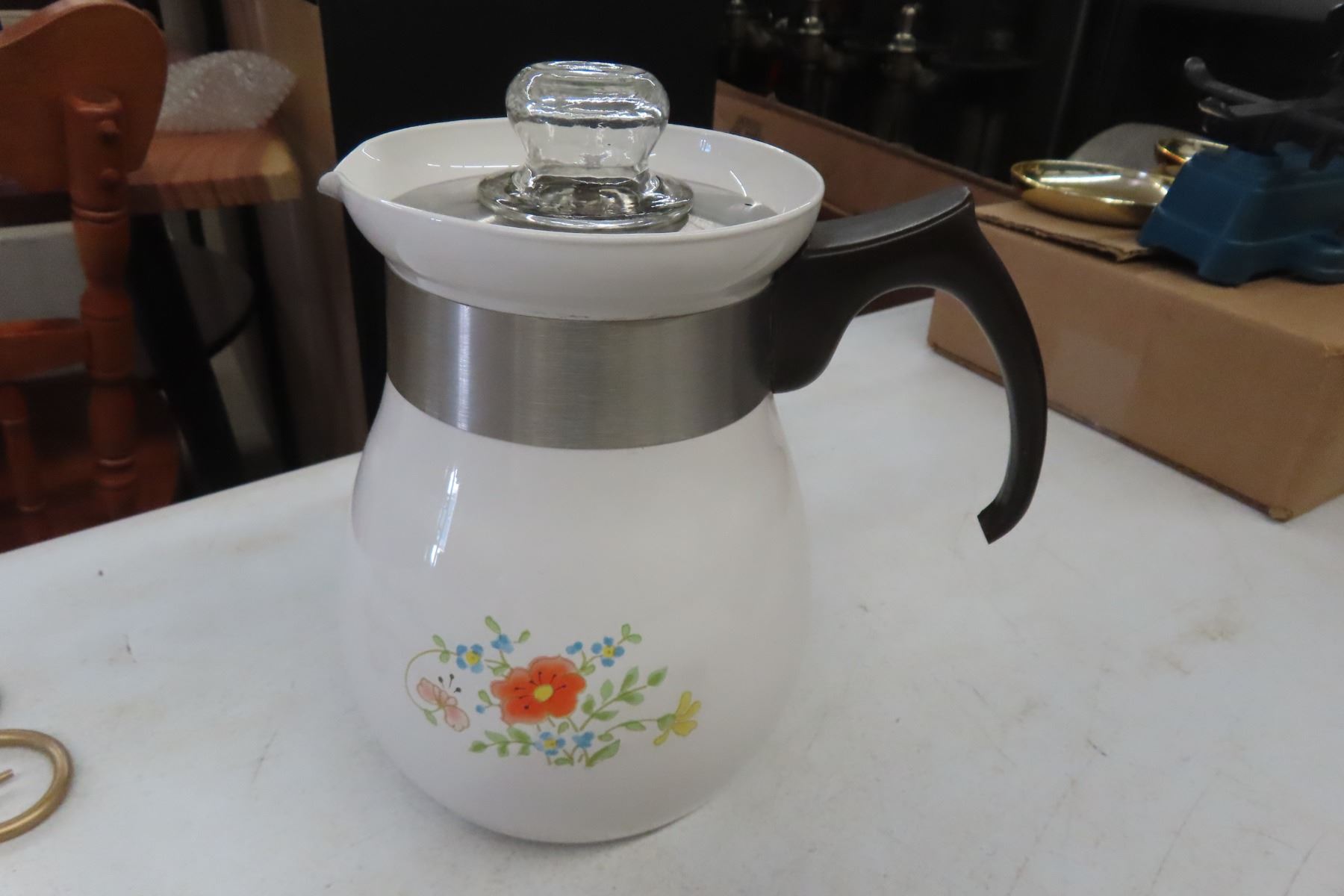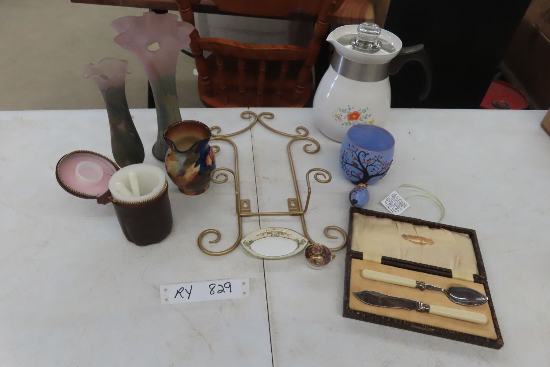 Corning Ware Coffee Percolator, HK Tunstall 1930's Creamer 2 Reuven Art Glass Vases Light Catcher/Candle Holder Noritake Miniature Porcelain Disk 1920's Crown Staffordshire Miniature Cup Nickel Plated Spoon and Knife