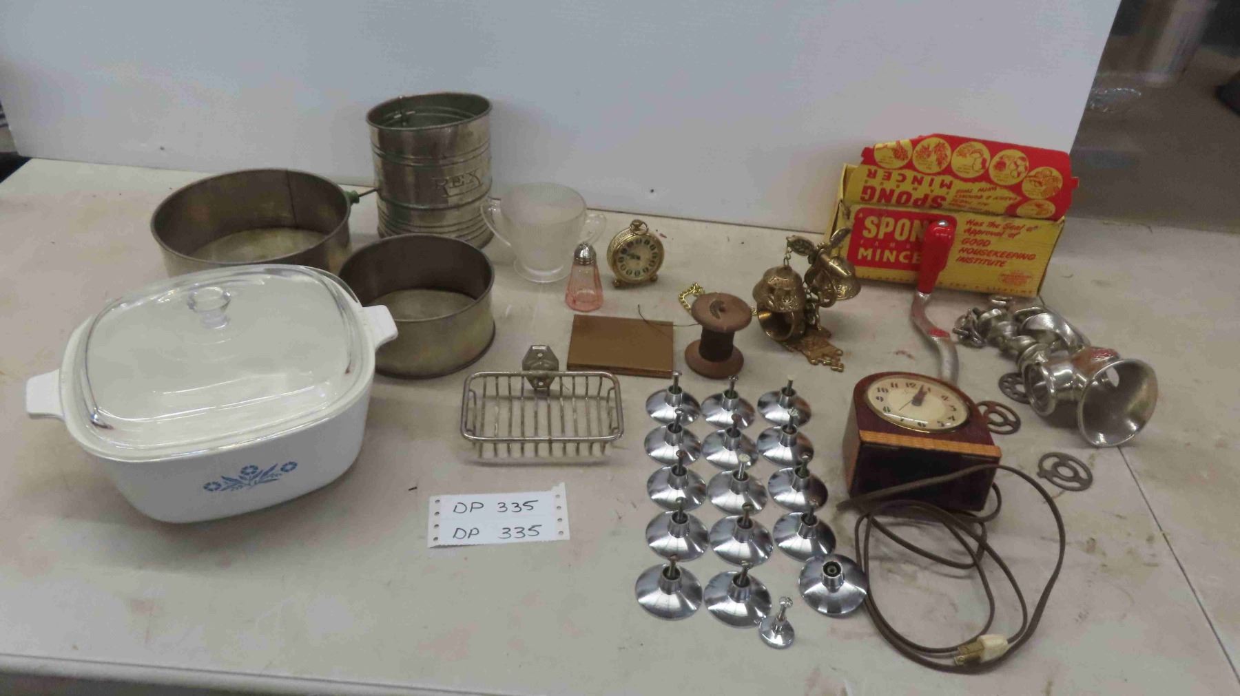Corningware Casserole Dish with Lid , Vintage Cake Pans, Sifters, Meat Grinder with Box, Chrome Door Knobs, Plus