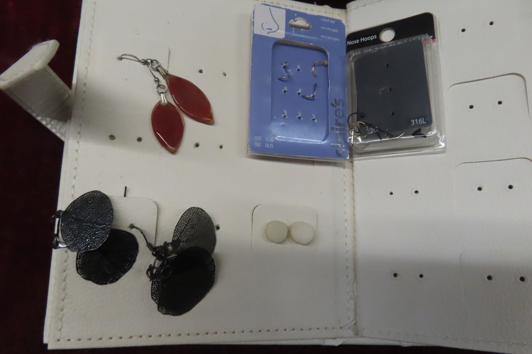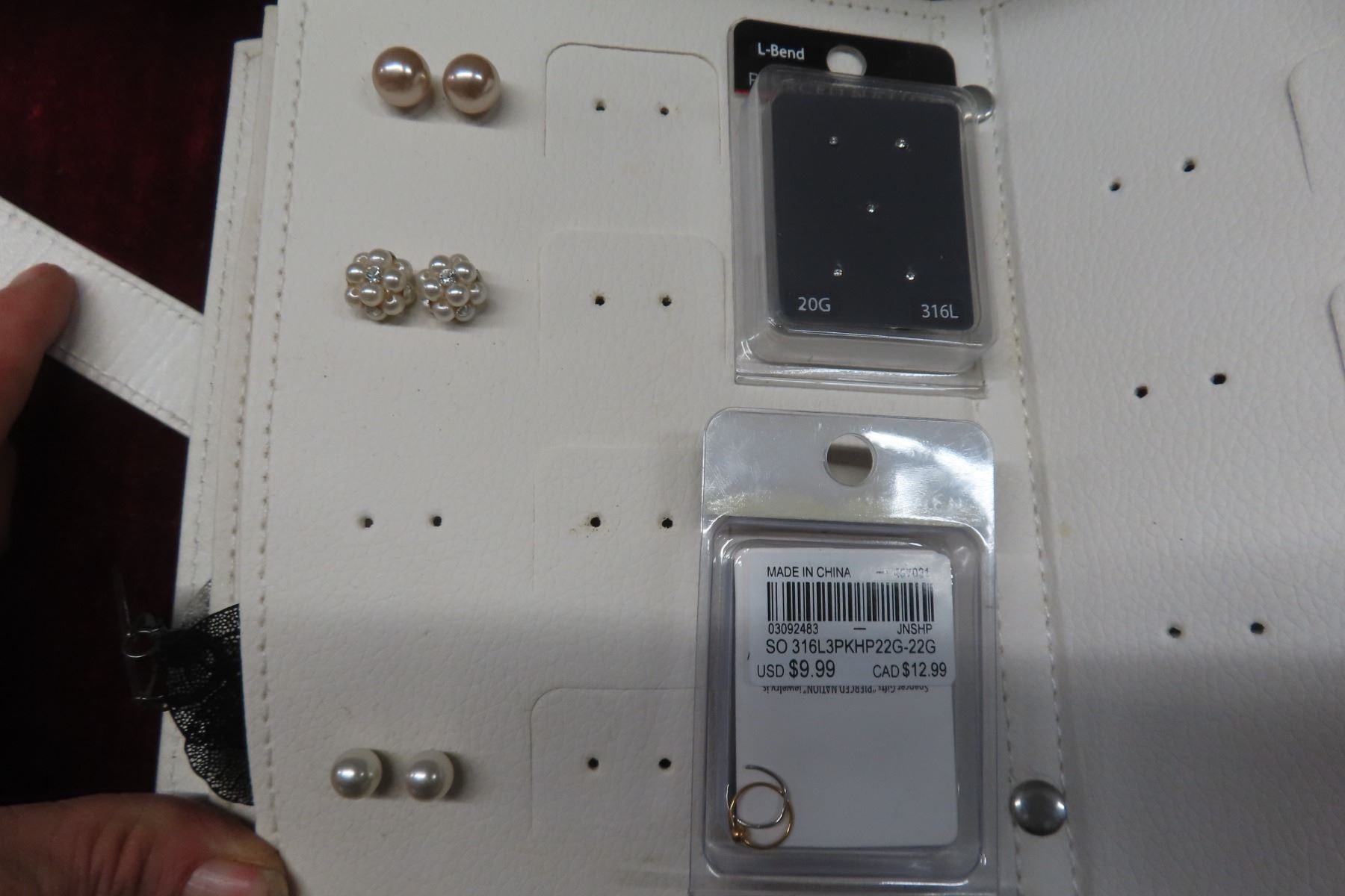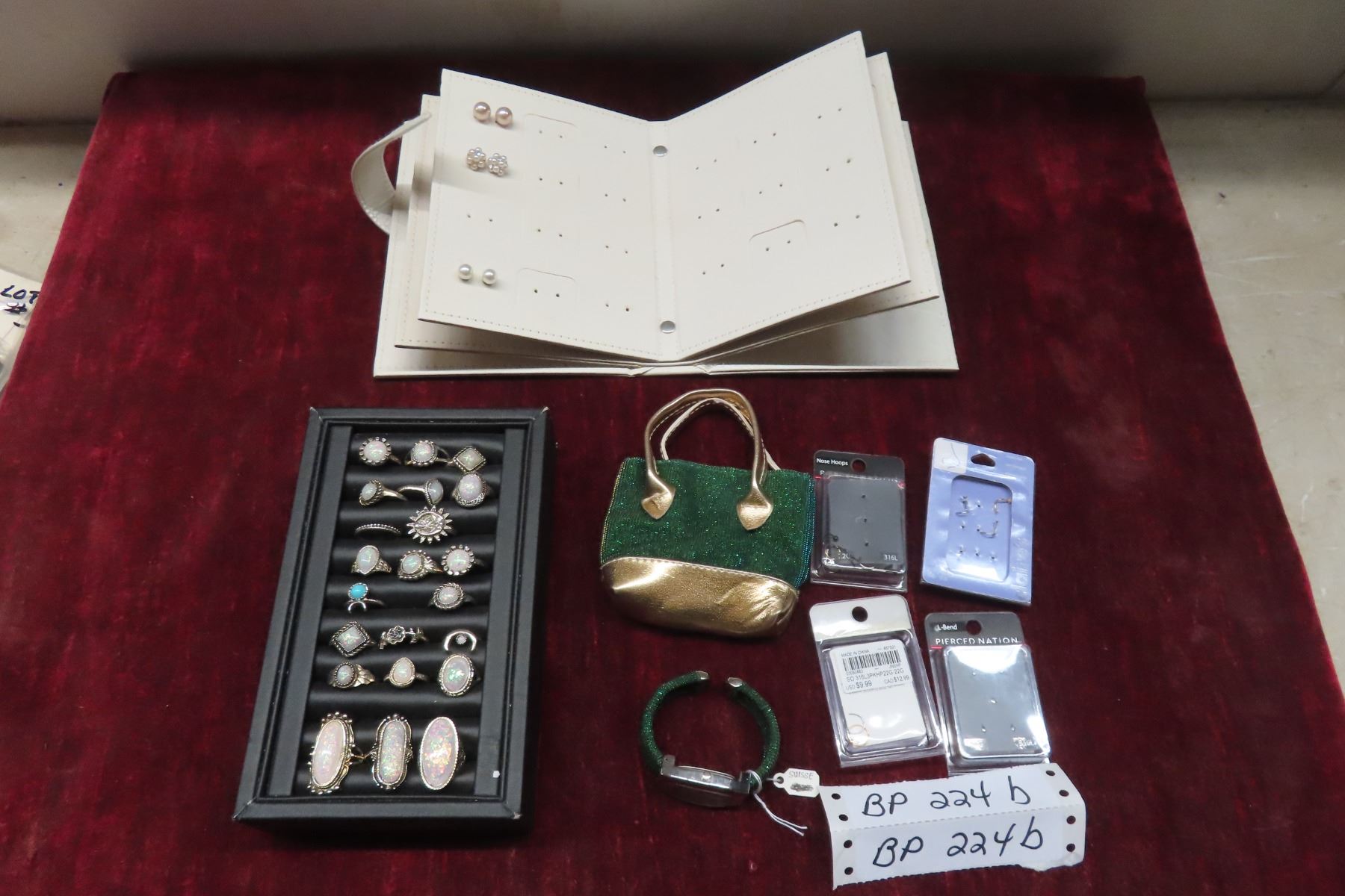 Costume Jewelery in Cases: 22 Rings, 9 pairs Earrings, Suisse Watch and 4 Pkgs Pierced Hoops