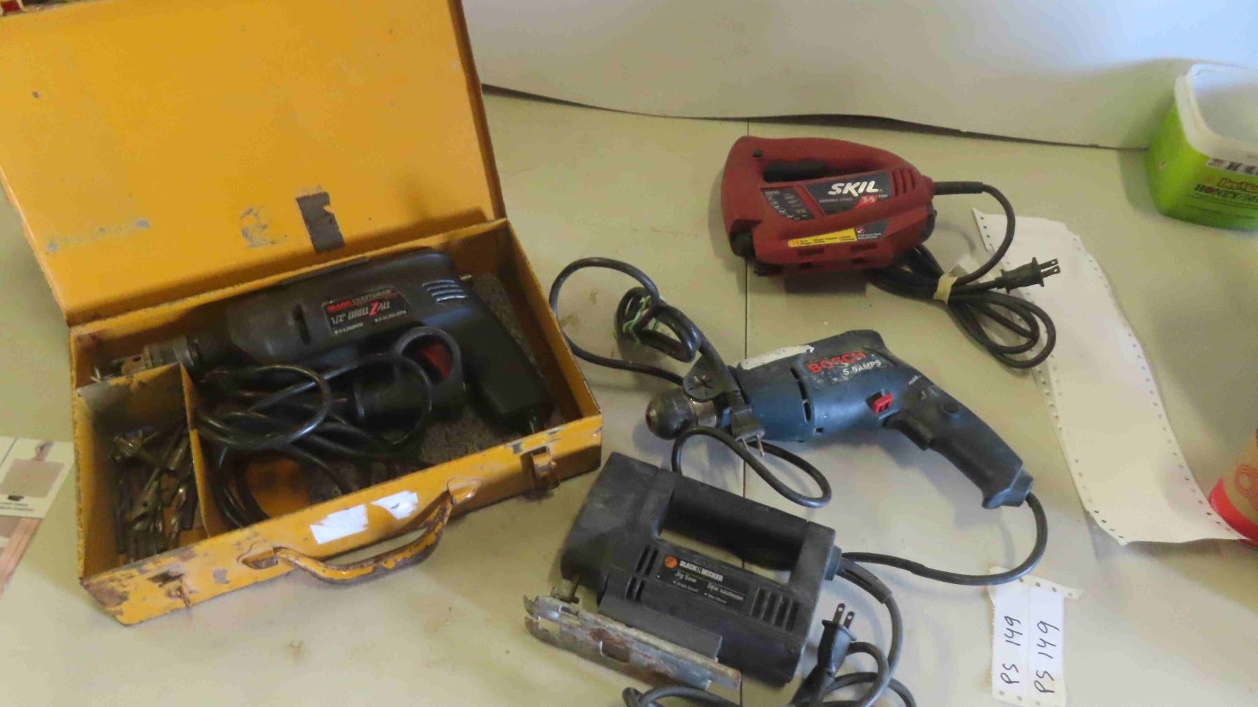 Craftsman 1/2'' Drill, Bosch 5.5 Amp Drill, 2 Jig Saws 1 Missing