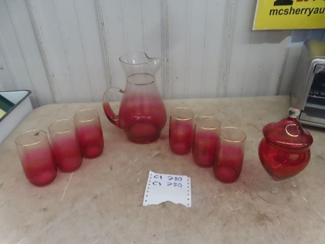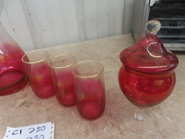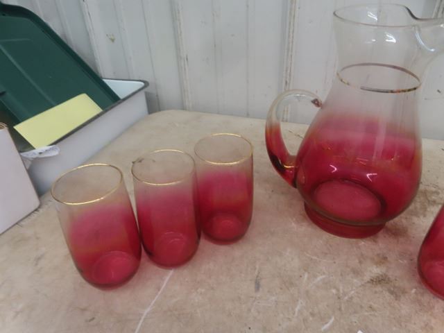 Cranberry Glass Pitcher with 6 Matching Glasses & Covered Candy Dish
