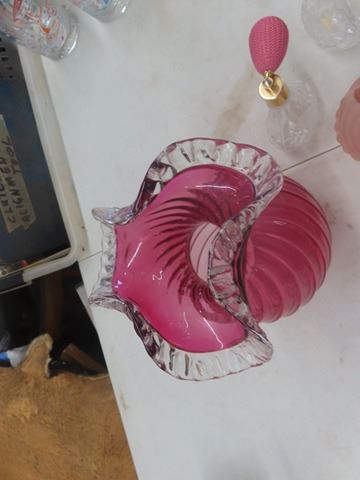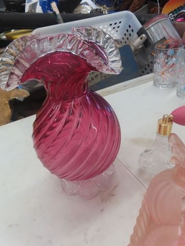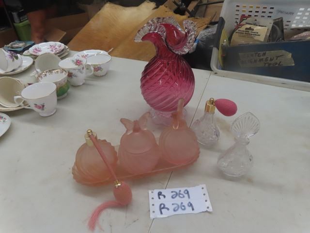 Cranberry Glass Vase 10" Tall & Perfume Bottle Set with Tray plus 2 others