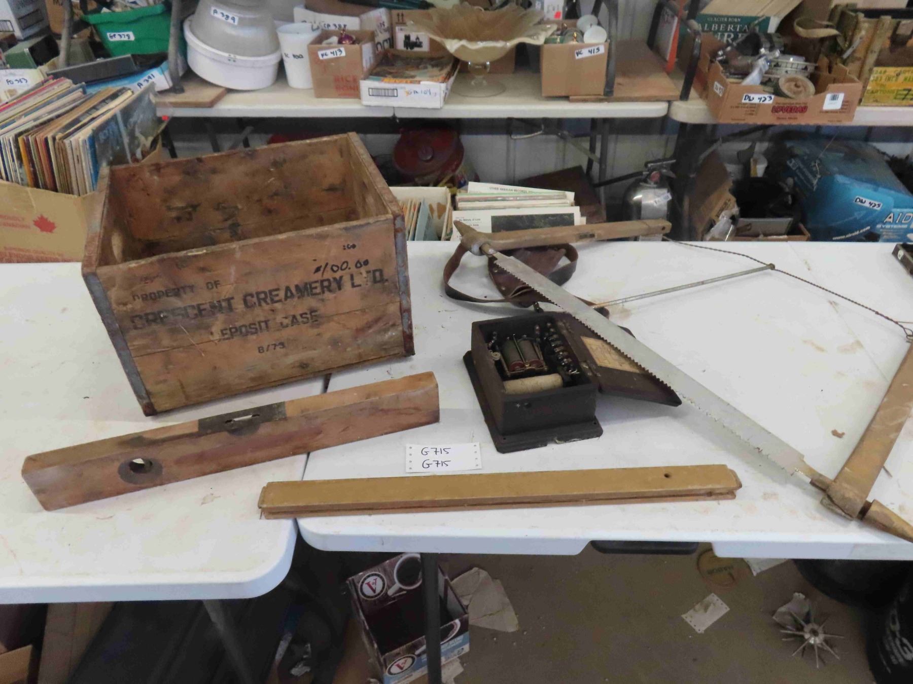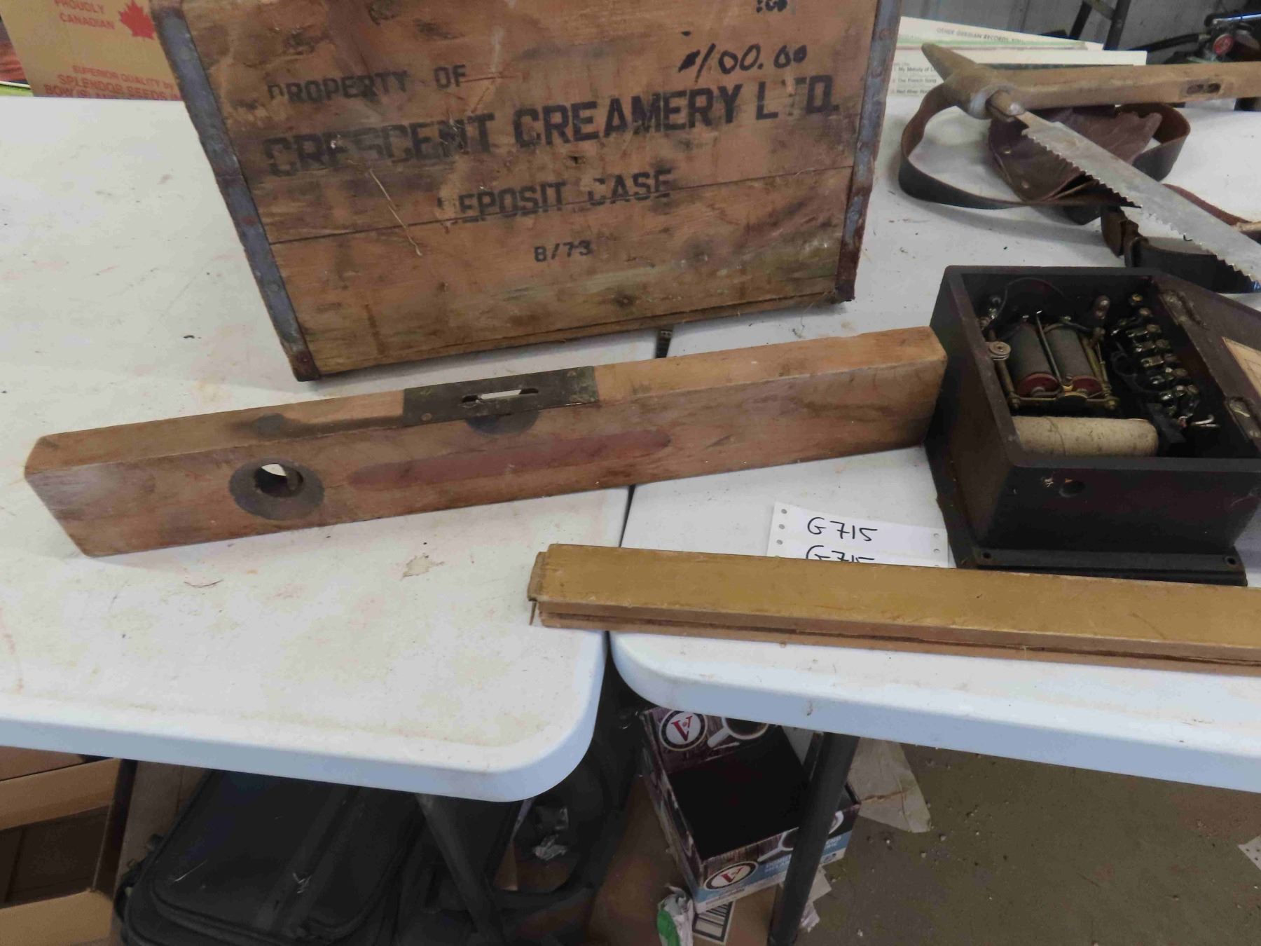 Crescent Creamery Crate, Buck Saw, Telephone Box, Wooden Level