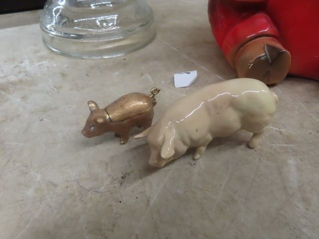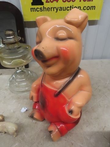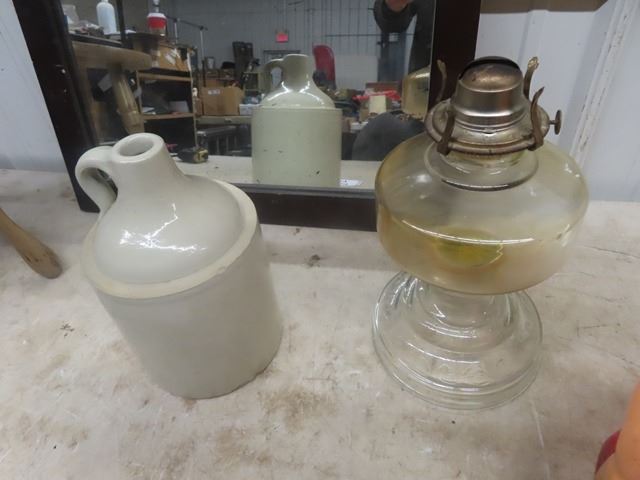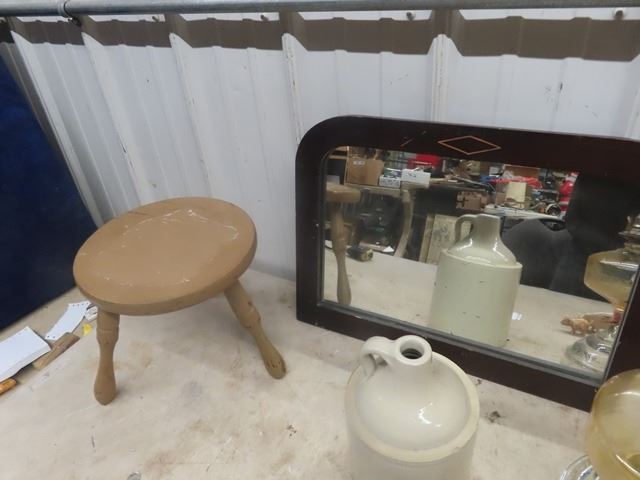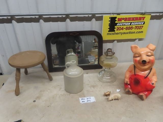 Crockery Jug, Cool Oil Lamp, Mirror 21" x 15", Stool & LG Ceramic Piggy Bank 14" Tall