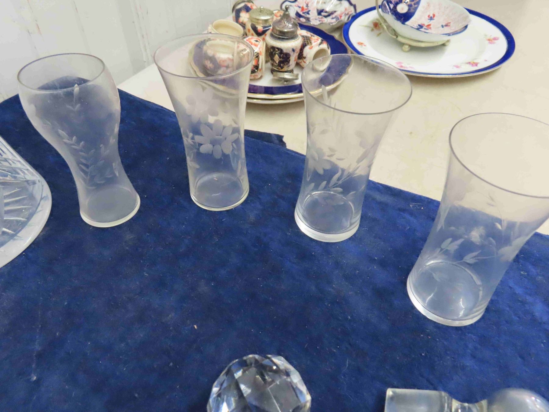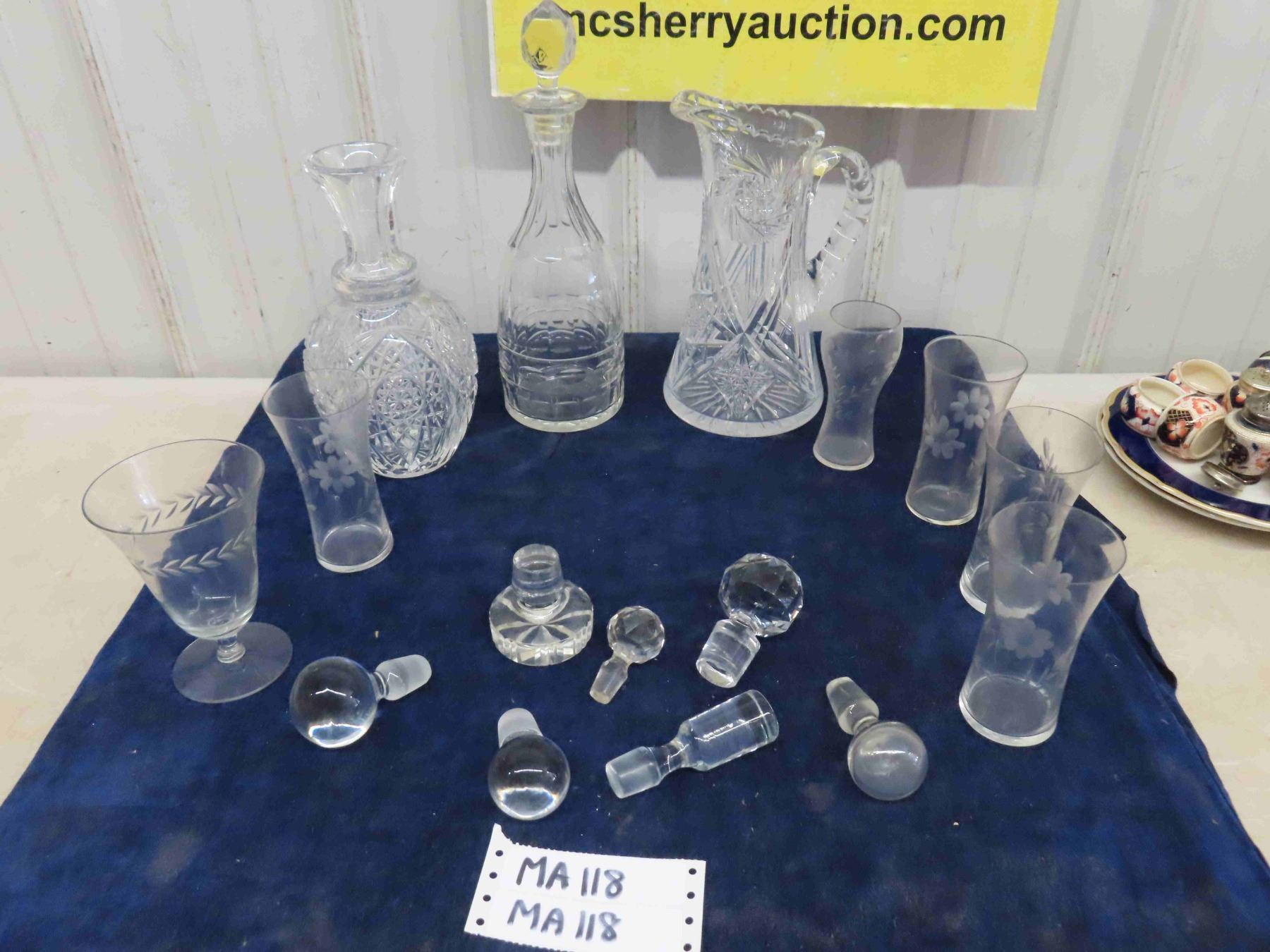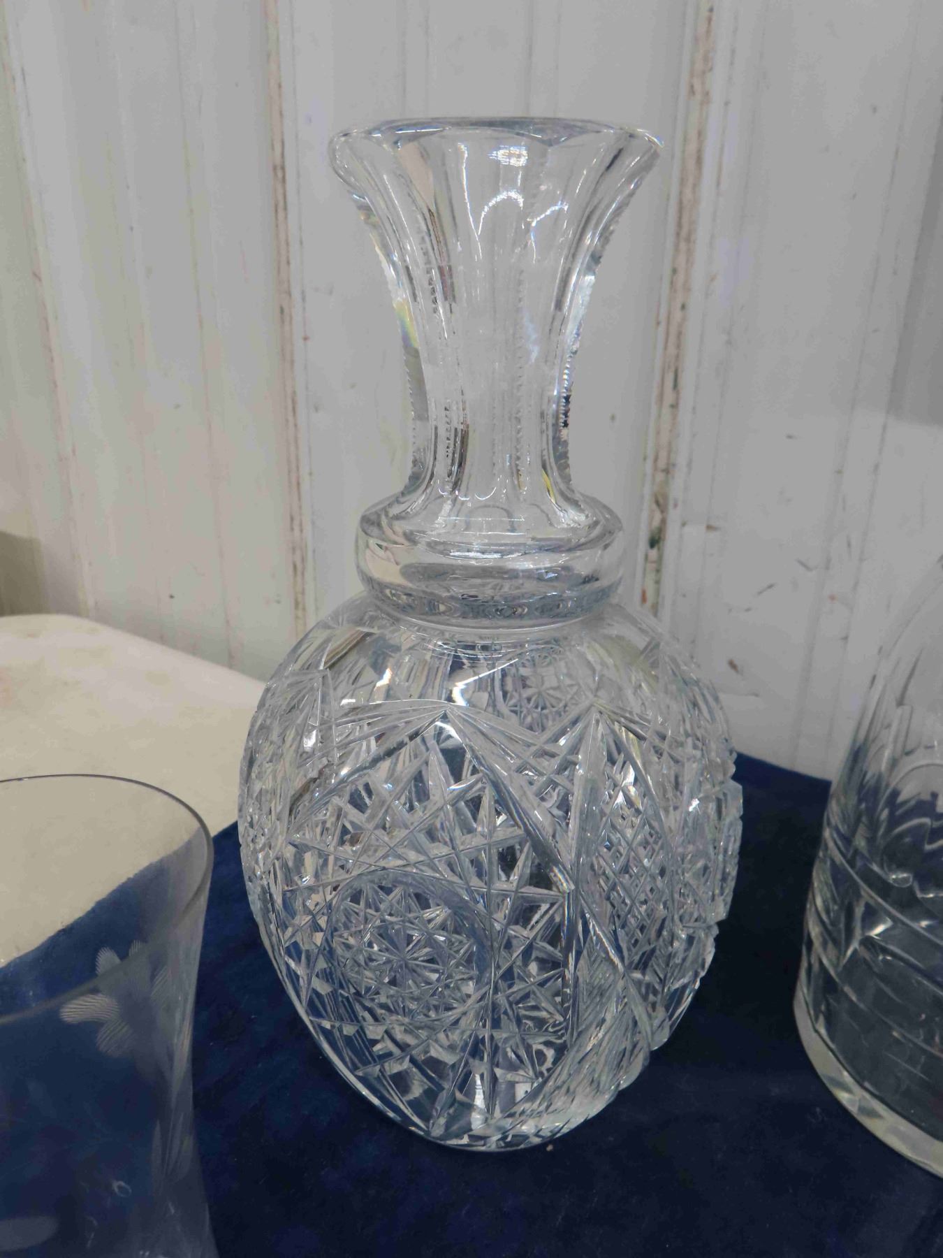 Crystal + Cut Glass ; Pitcher, Decanters, Floral Etched Glasses + Stoppers
