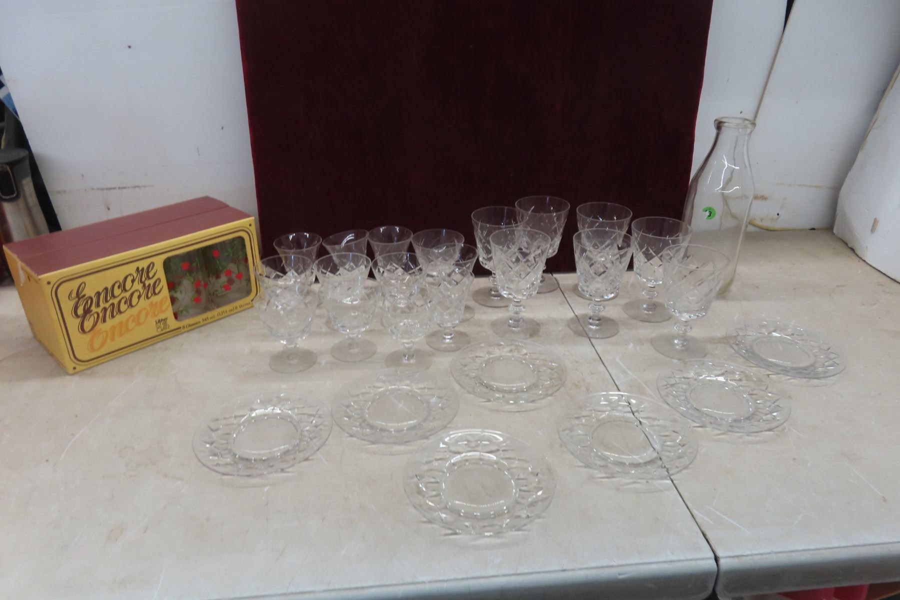 Crystal Glasses, Side Plates, New Old Stock Libbys Encore Glasses, Milk Bottle