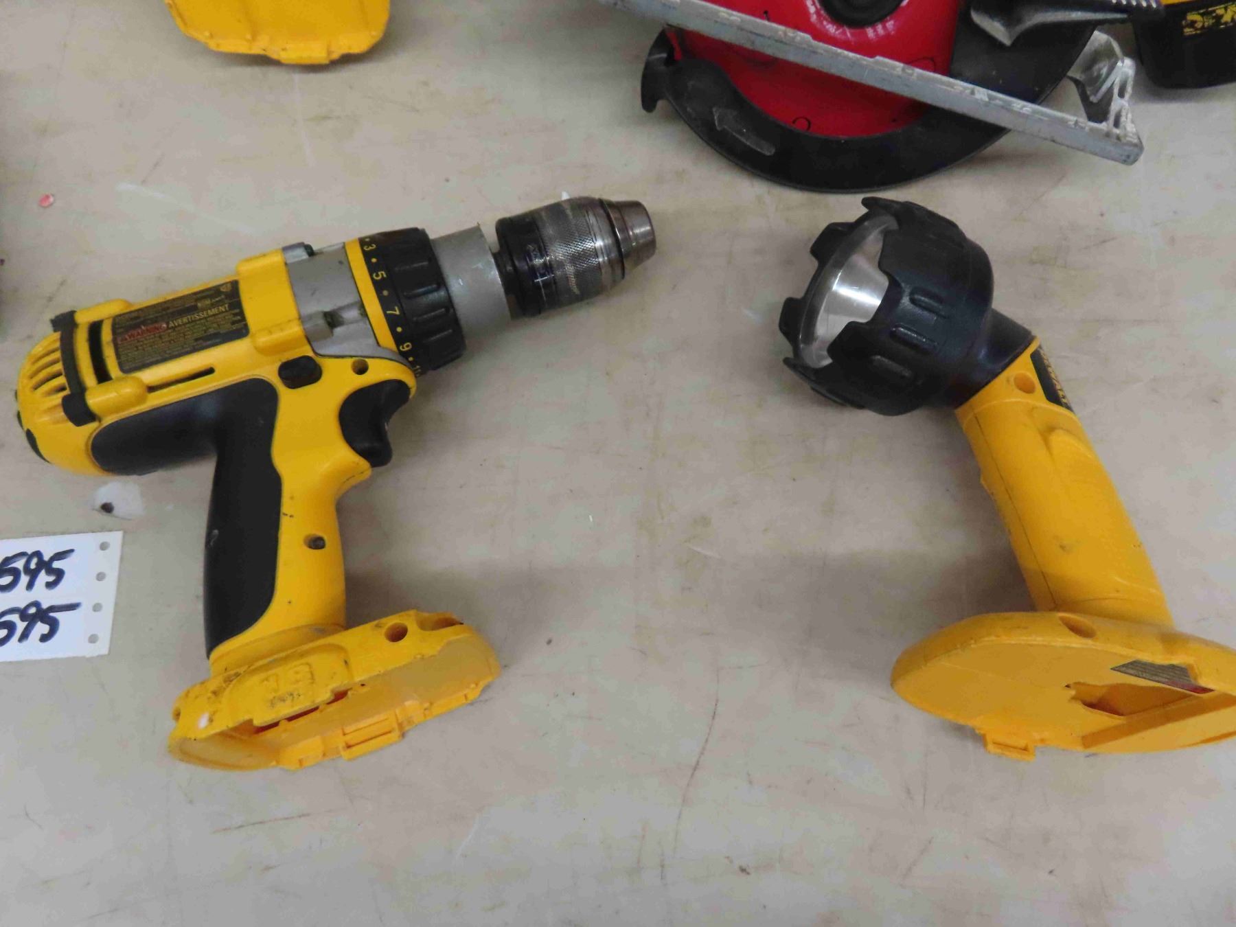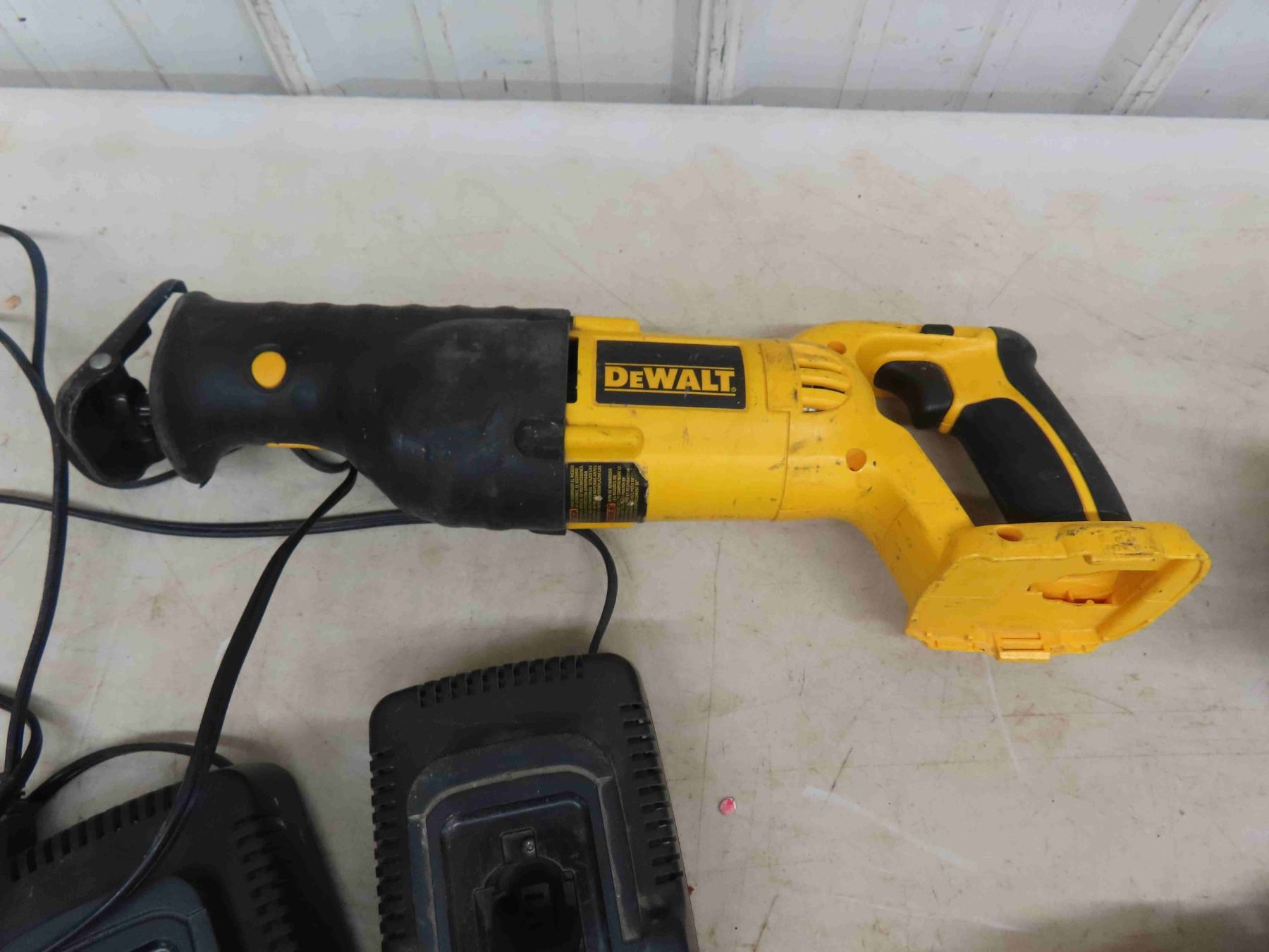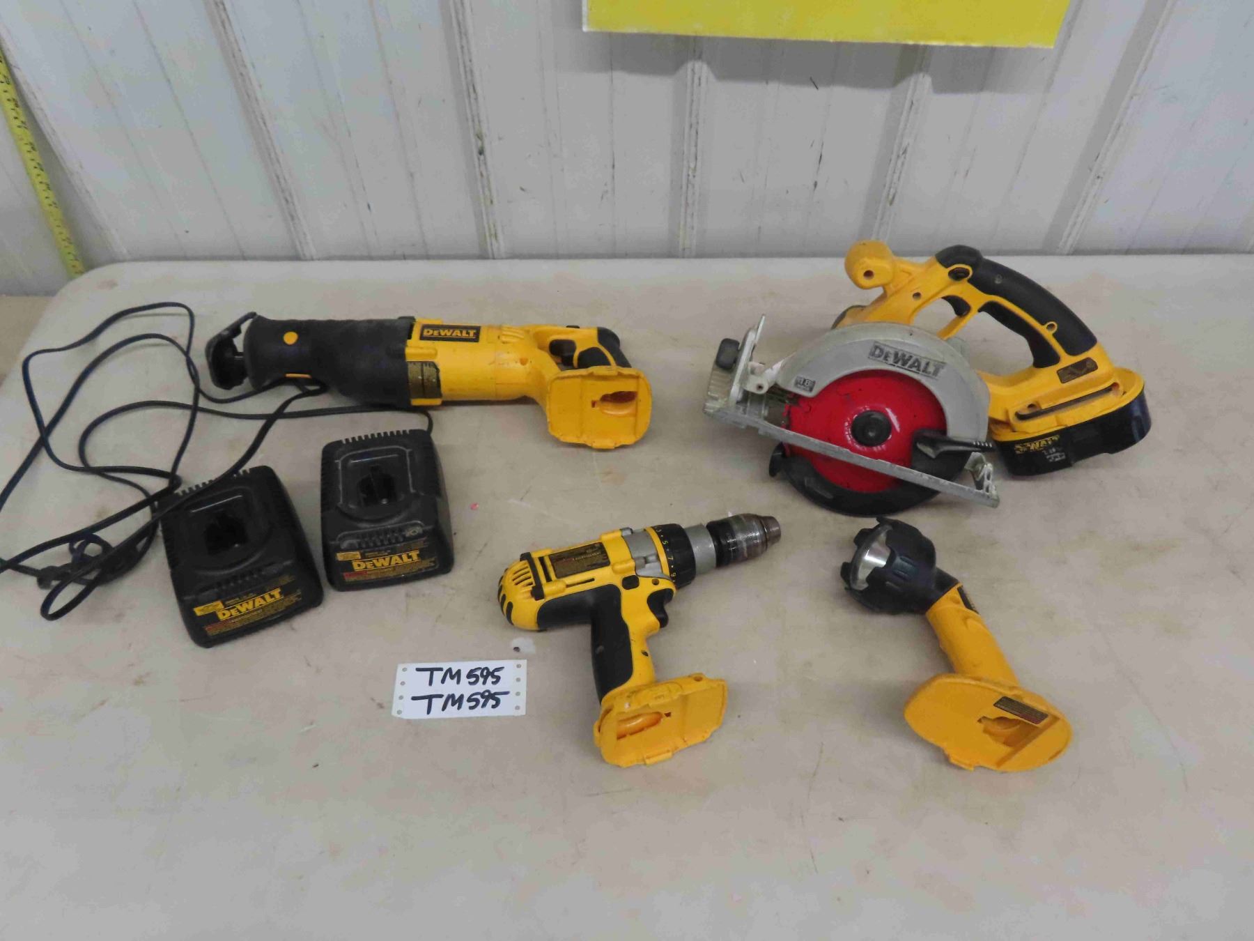 DeWalt 18V Cordless Tools; Circular Saw, Reciprocating Saw, 1/2" Drill, Flashlight, with 2 Chargers + 1 Battery - Owners says they work but need battery
