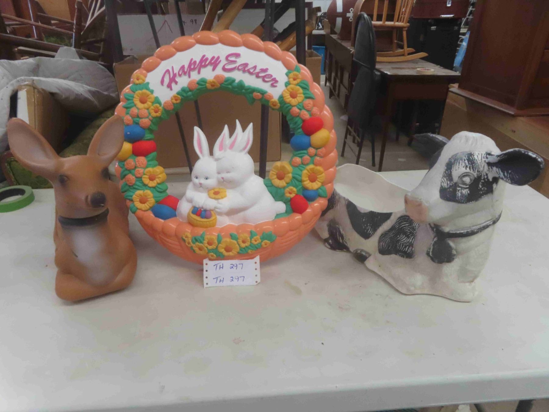 Deer and Cow Blow Molds 14'' Tall , Plastic Easter Wreath , Metal Stand with Plastic Pot 33'' Tall