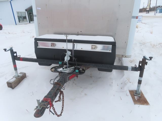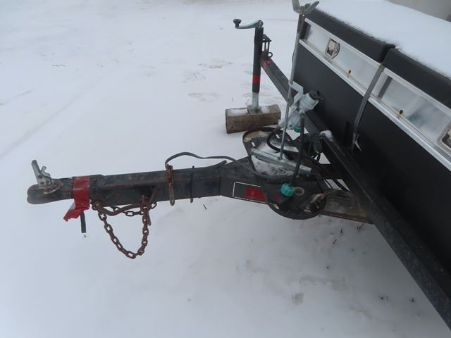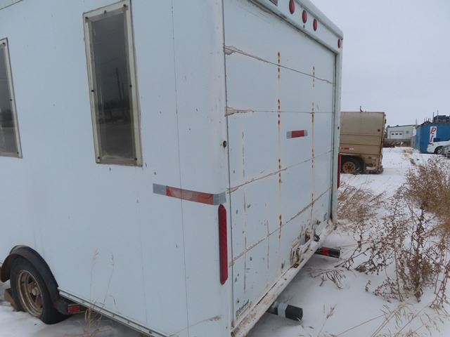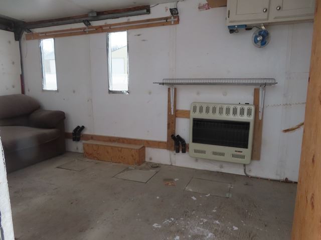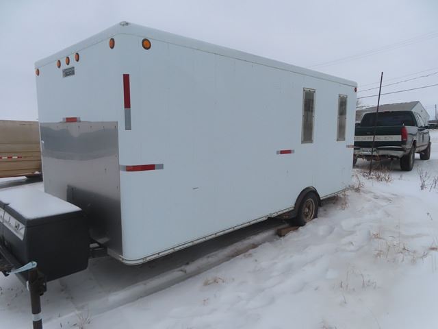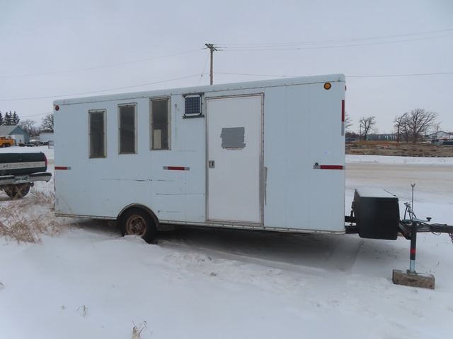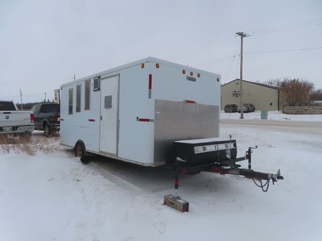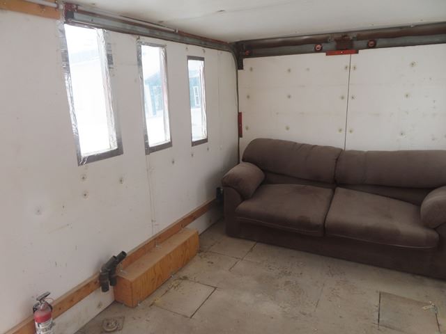 Enclosed Insulated Bumper Hitch 8'x16' Trailer Converted to Ice Fishing Deluxe Castle with Roll Up Rear Door, LED Interior Lighting, Solar Powered, Blietooth Speaker, Ventless Propane Fireplace, Lexan Windows, Hide-a-Bed Sofa - Have TOD