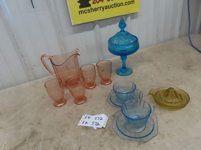 Depression Glass Pitcher + 4 Glasses ,2 Depression Cups + Saucers , Covered Candy Dish