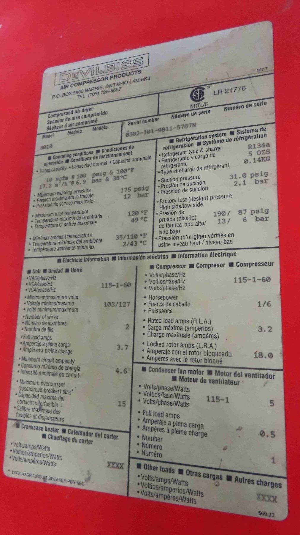 Deviar Devilbiss Air Dryer Model LR21776