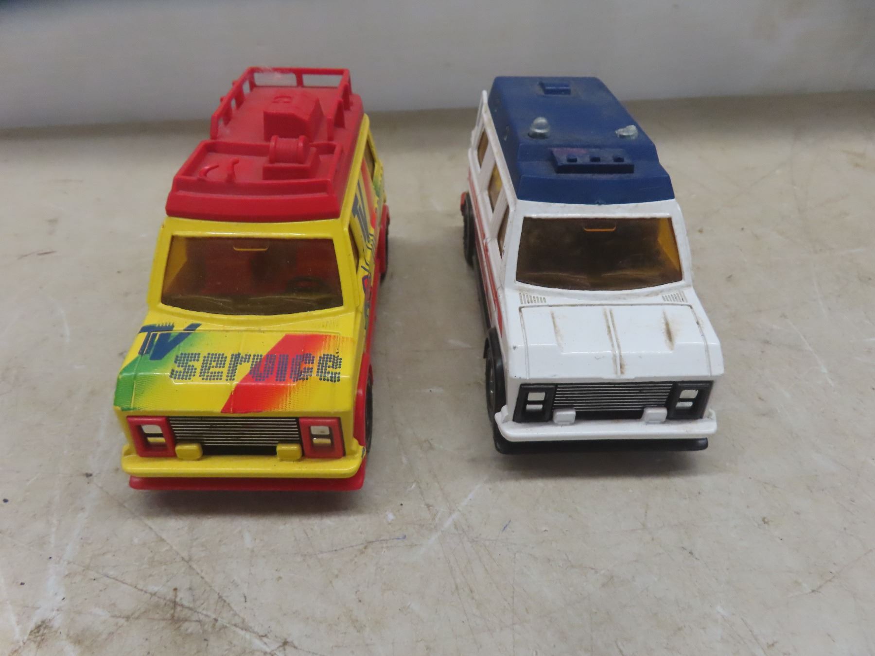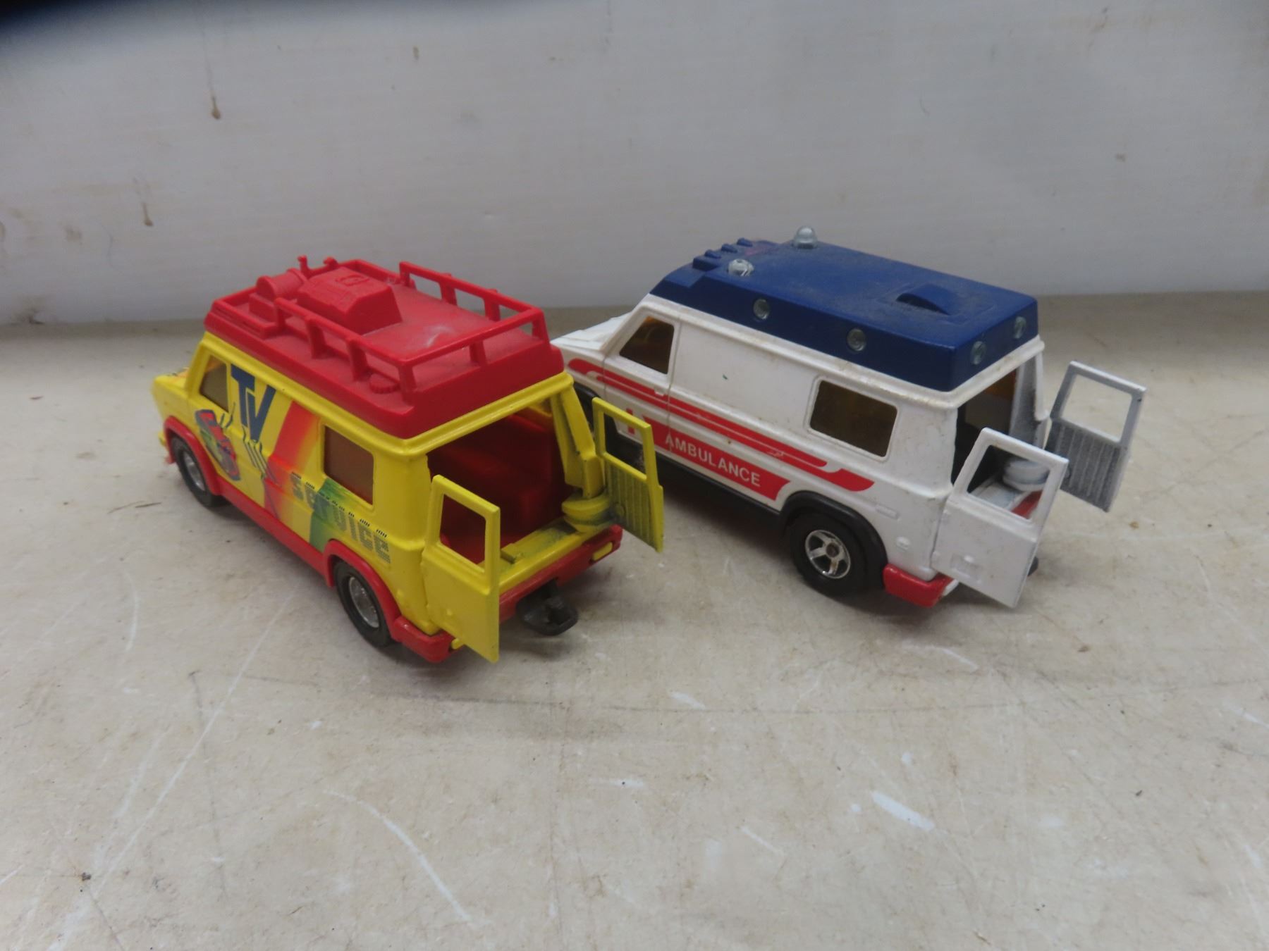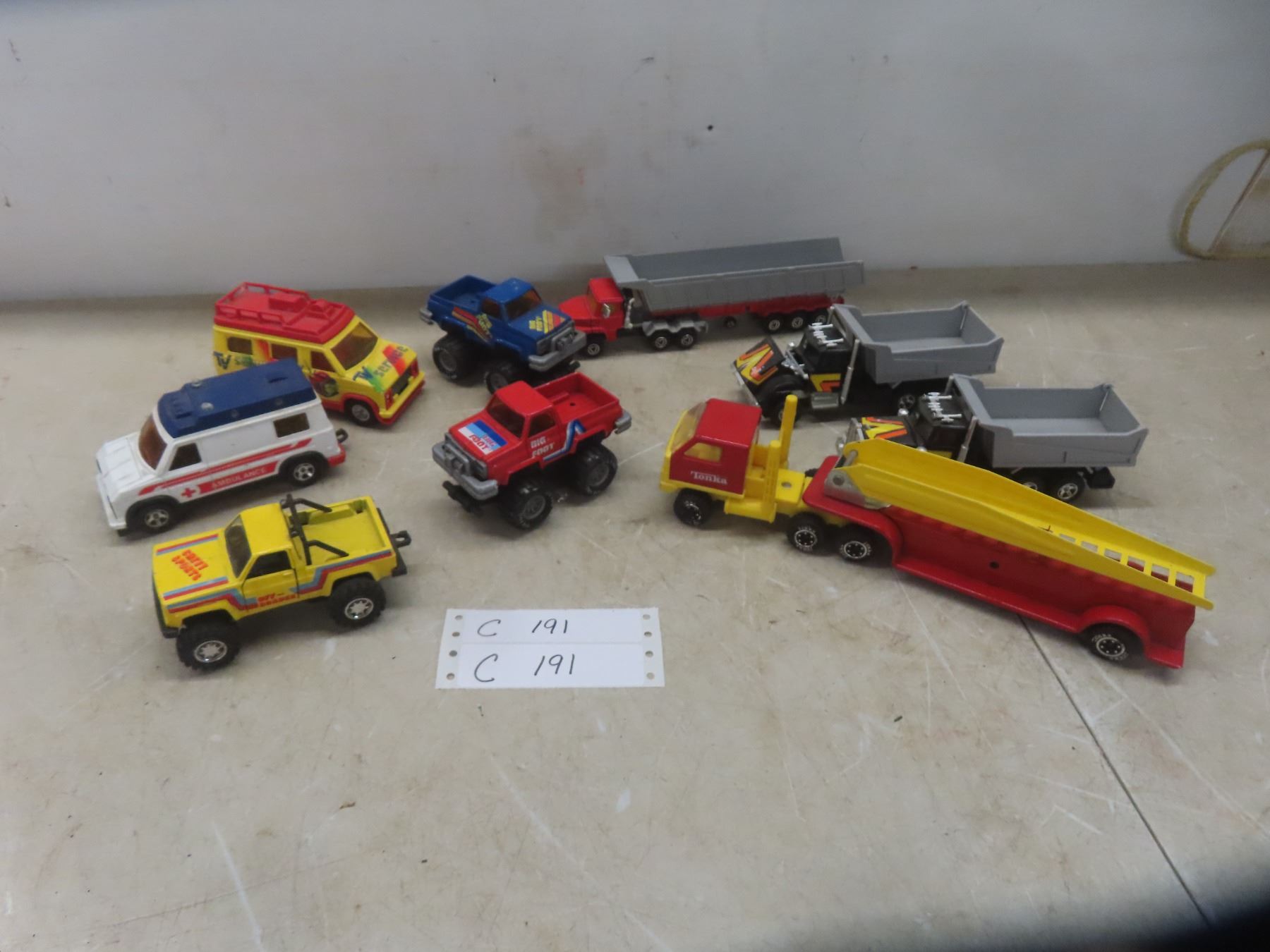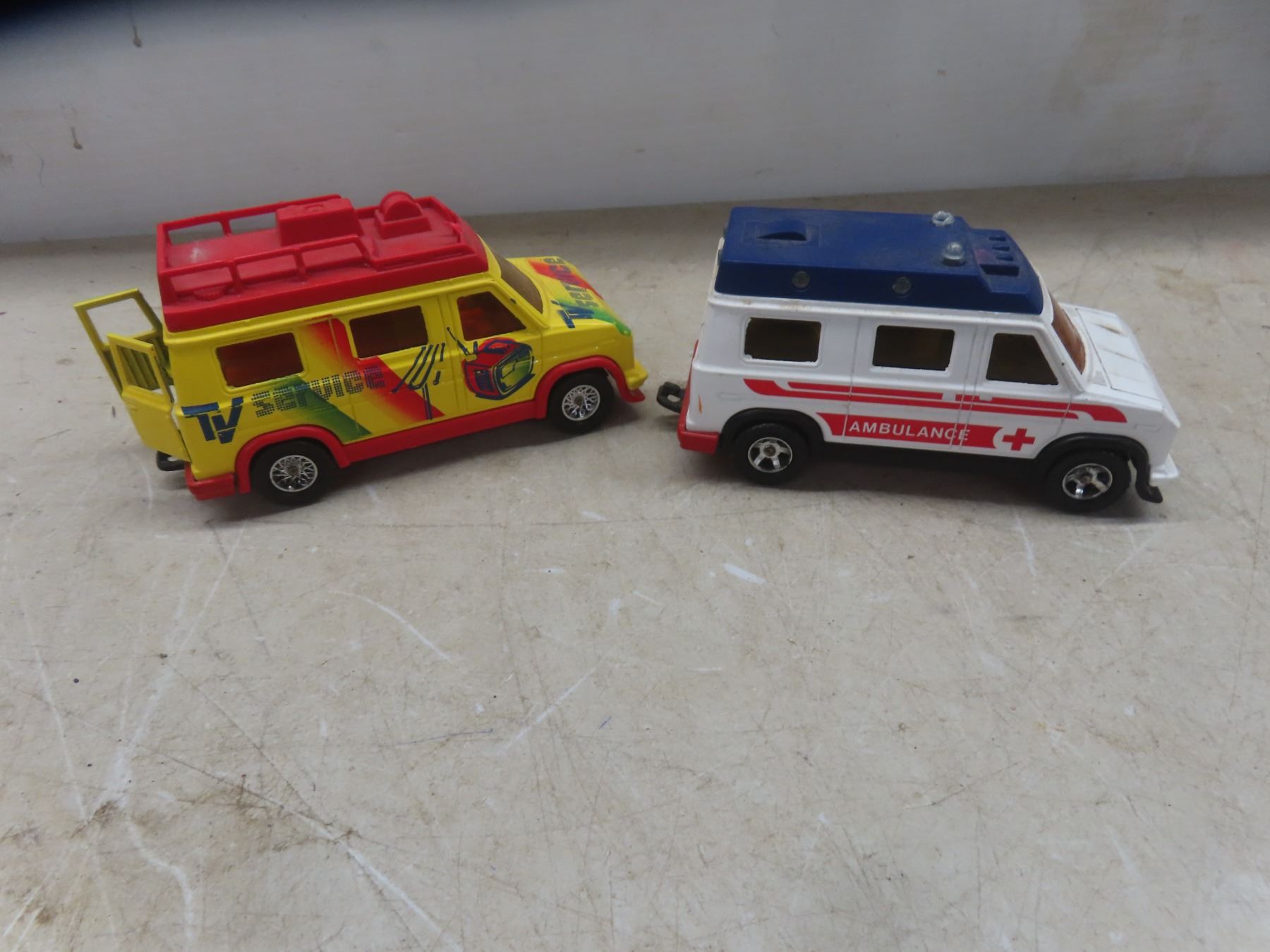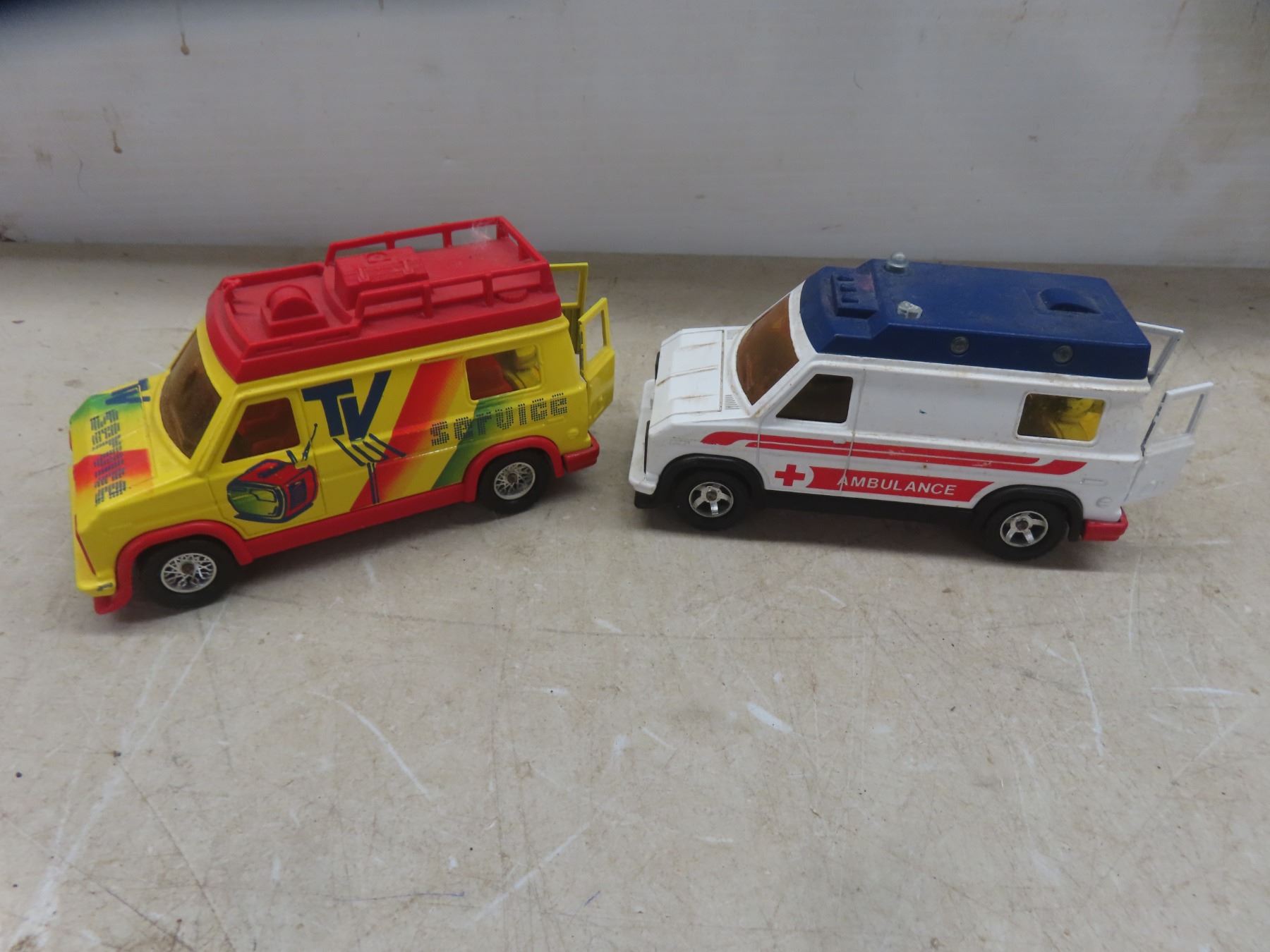 Diecast Vehicles: Majorette, Yatming, Tonka Ambulance, Service Van, Dump Trucks.