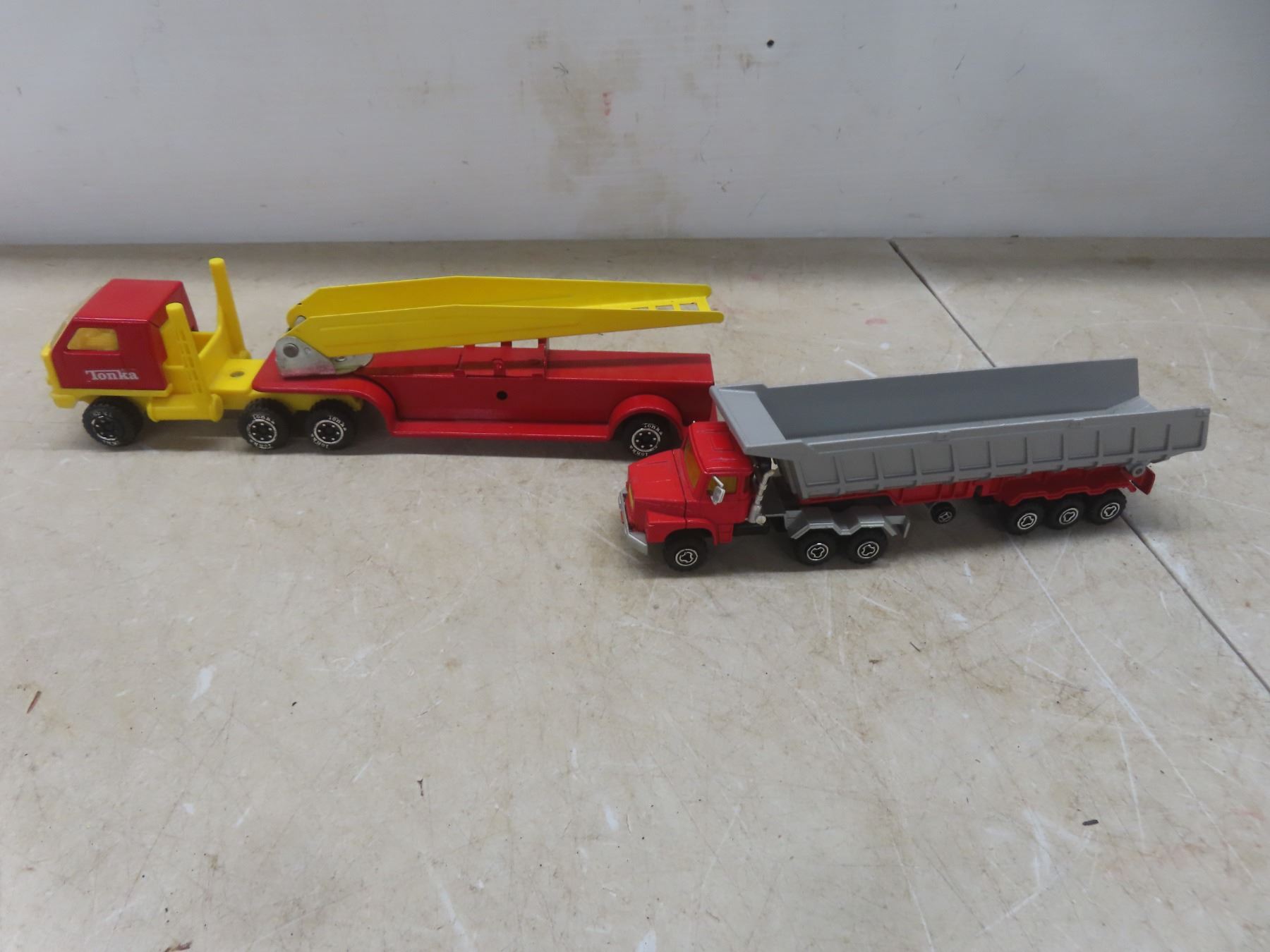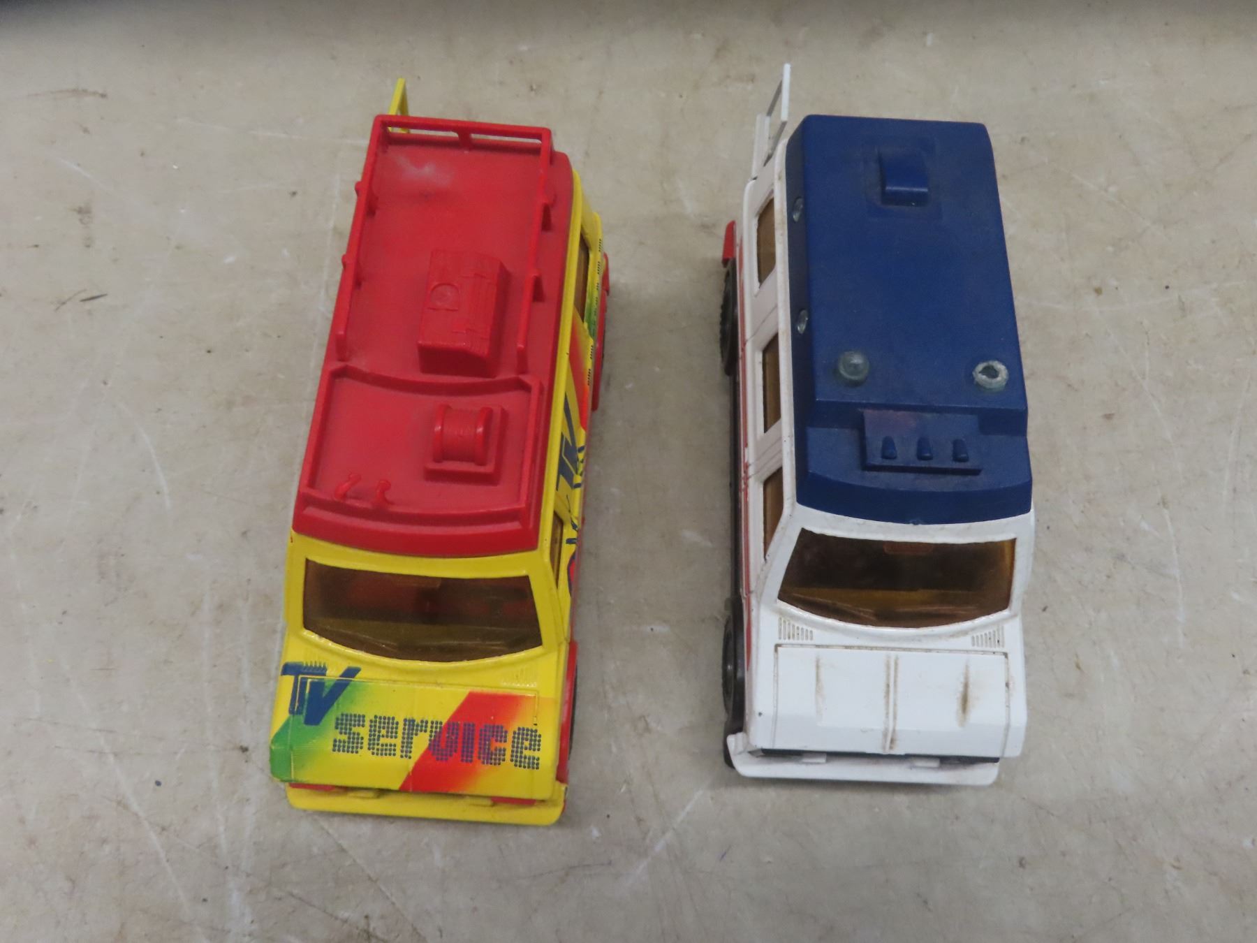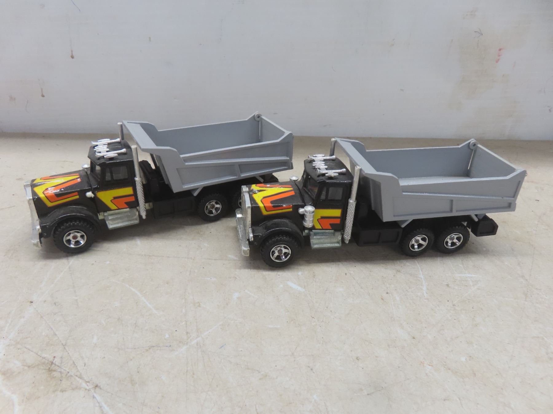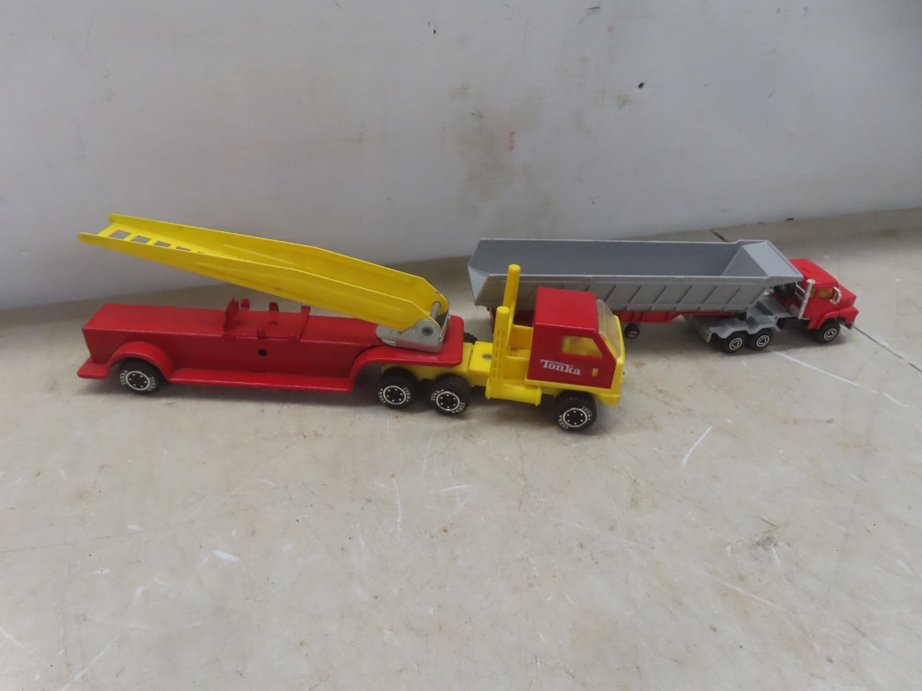 Diecast Vehicles: Majorette, Yatming, Tonka Ambulance, Service Van, Dump Trucks.