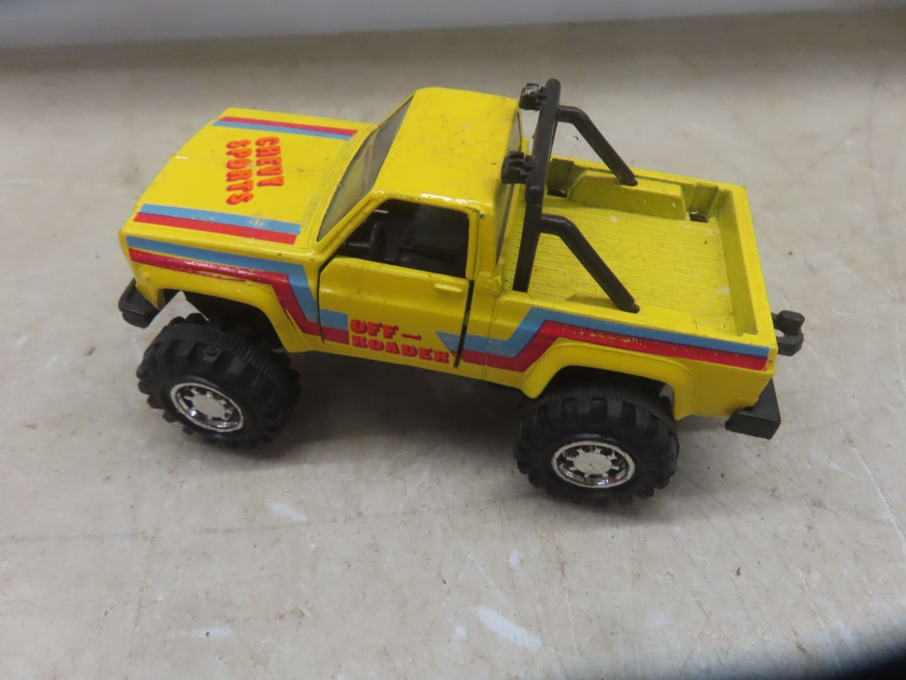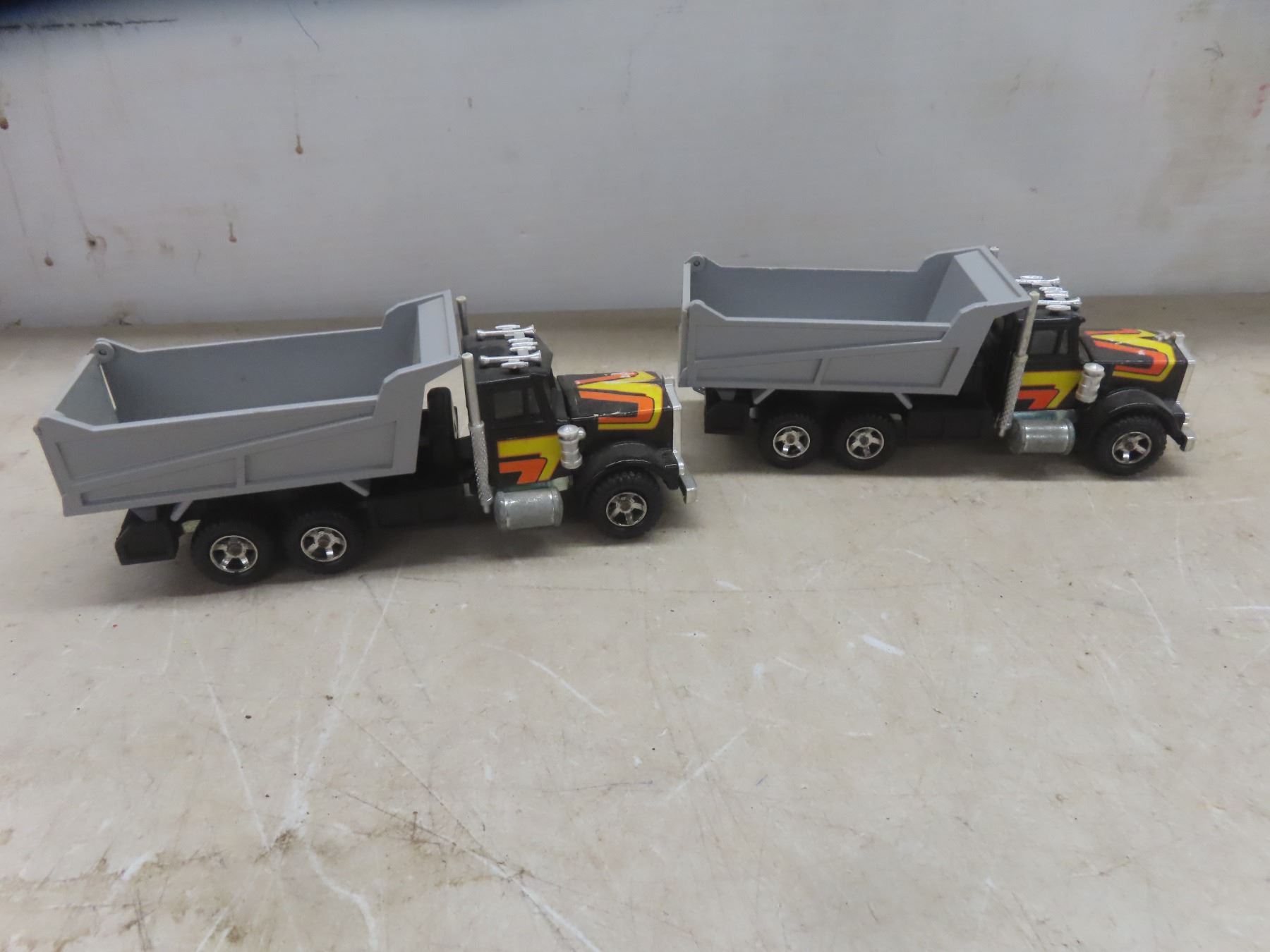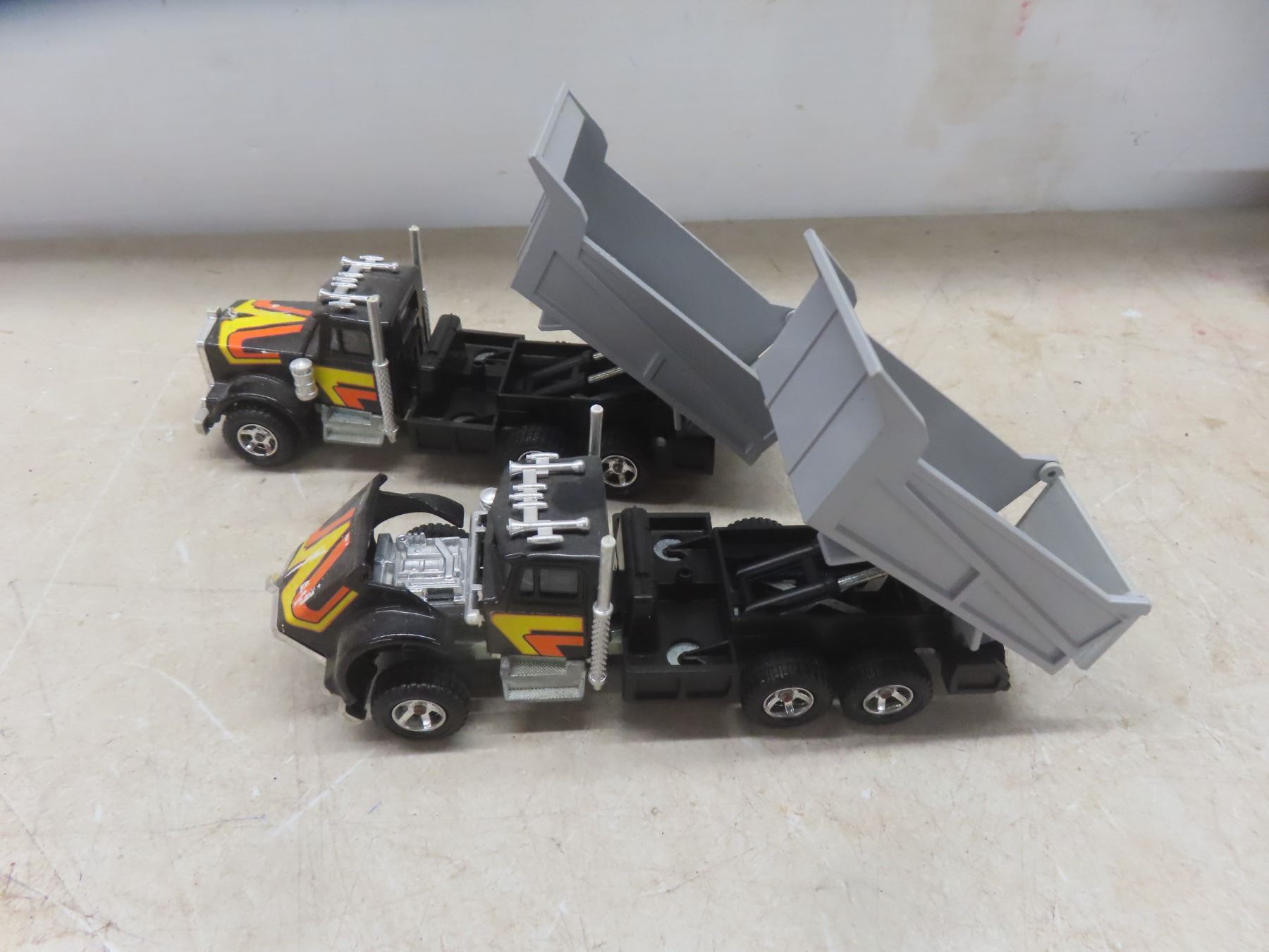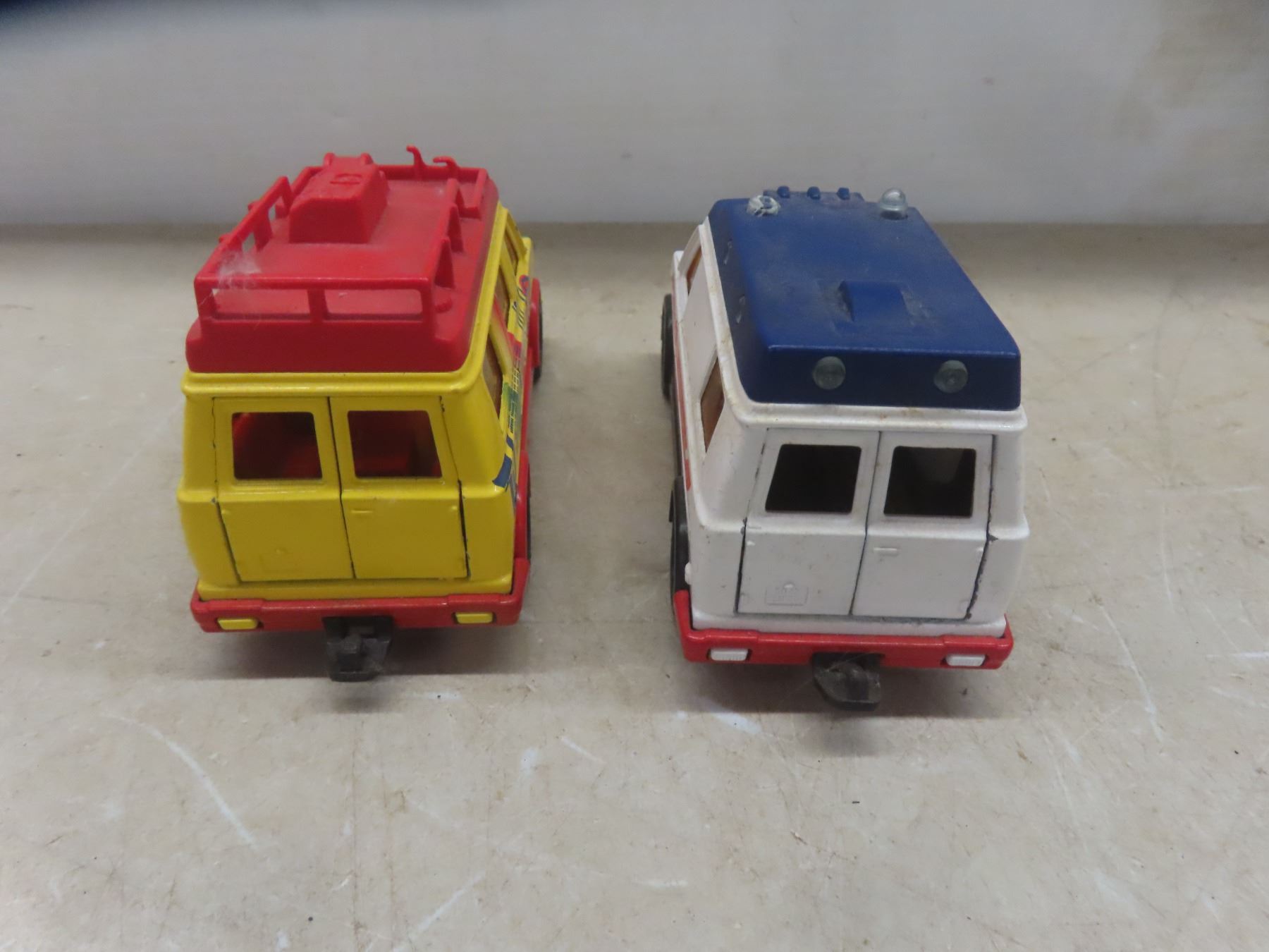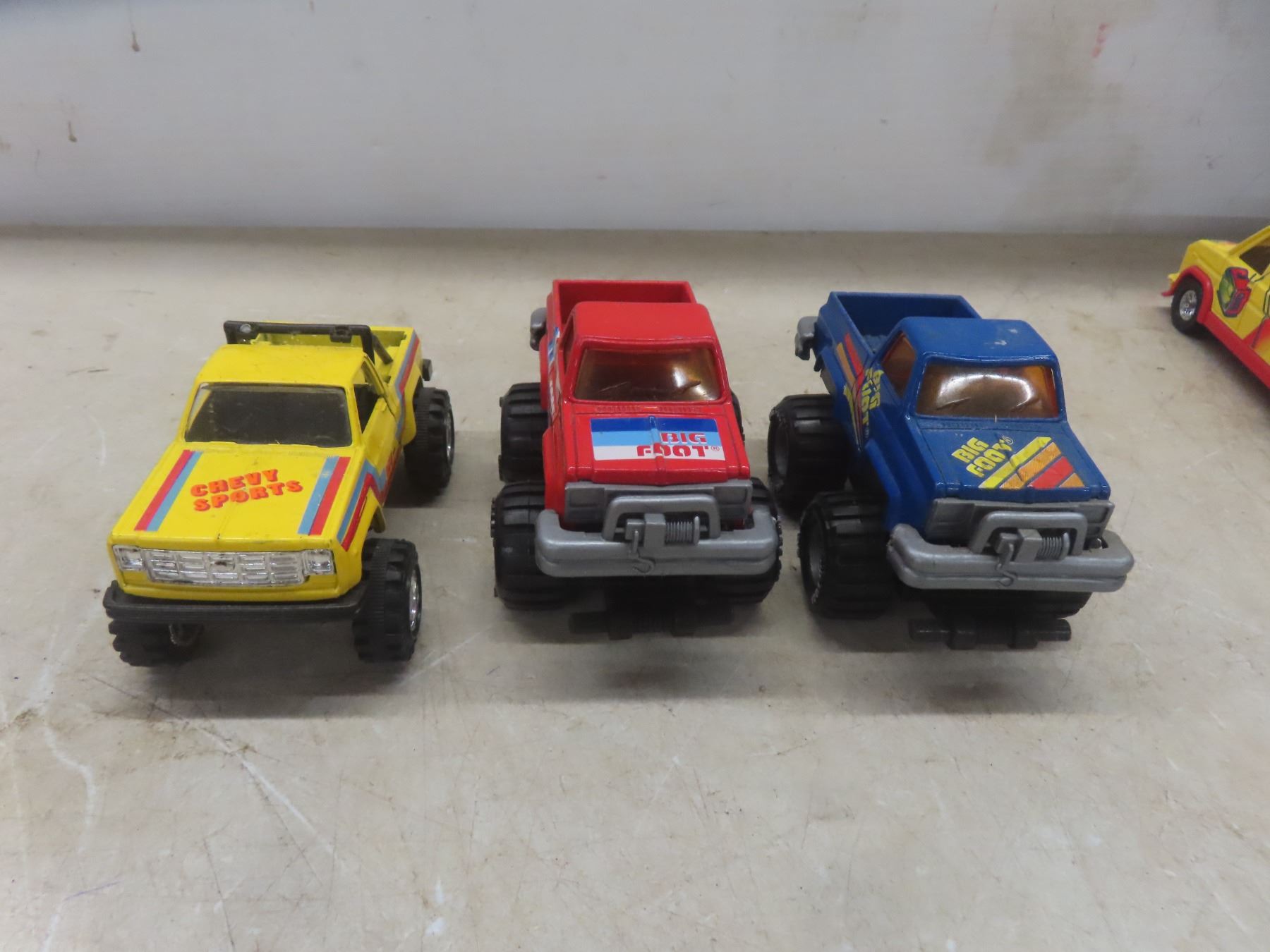 Diecast Vehicles: Majorette, Yatming, Tonka Ambulance, Service Van, Dump Trucks.