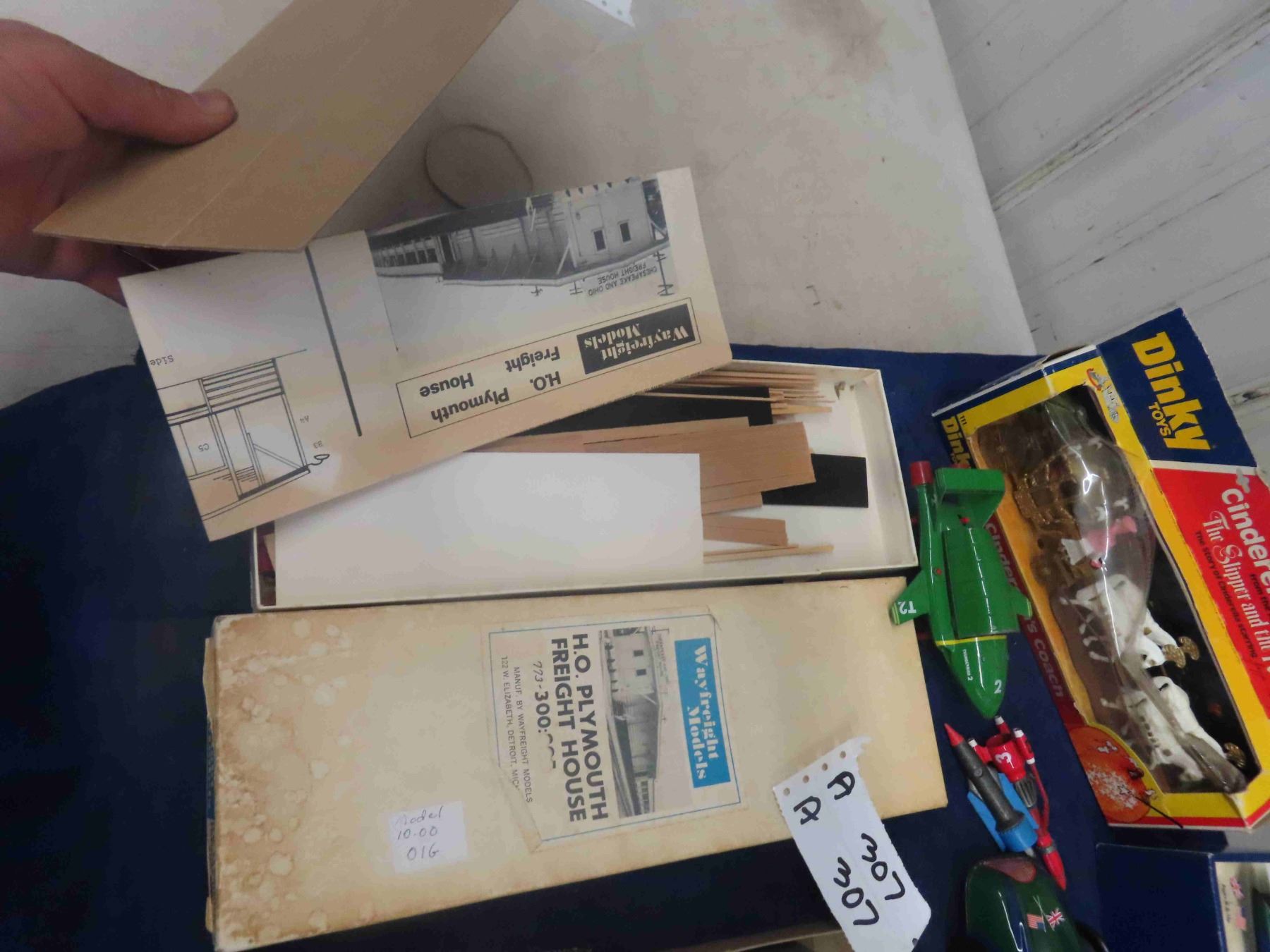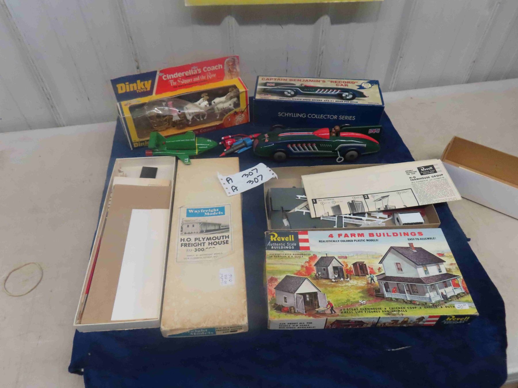 Dinky Toys Cinderella Coach, Captain Benjamin Wind Up Car, 2 Models; Farm Buildings + Freight House
