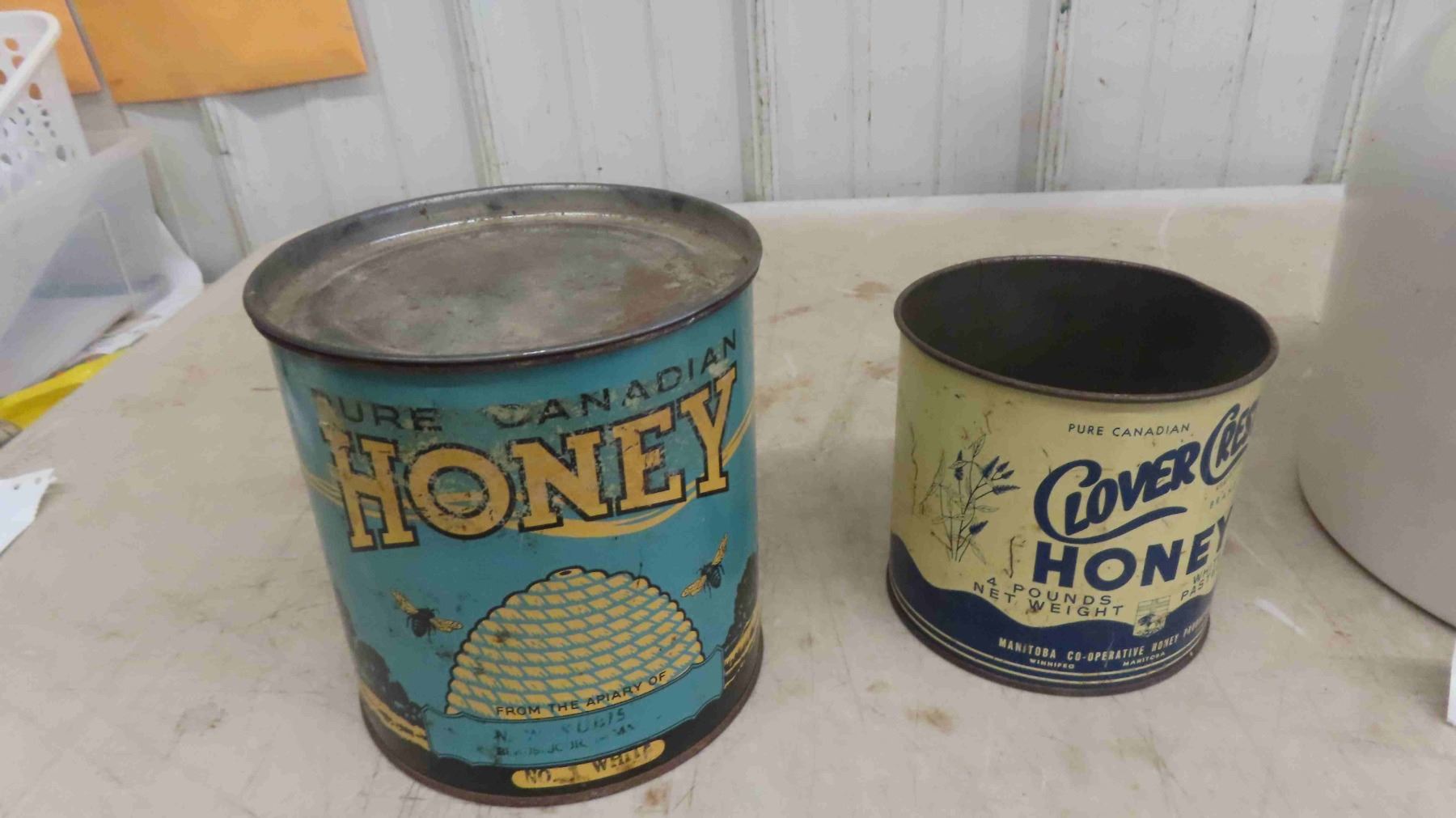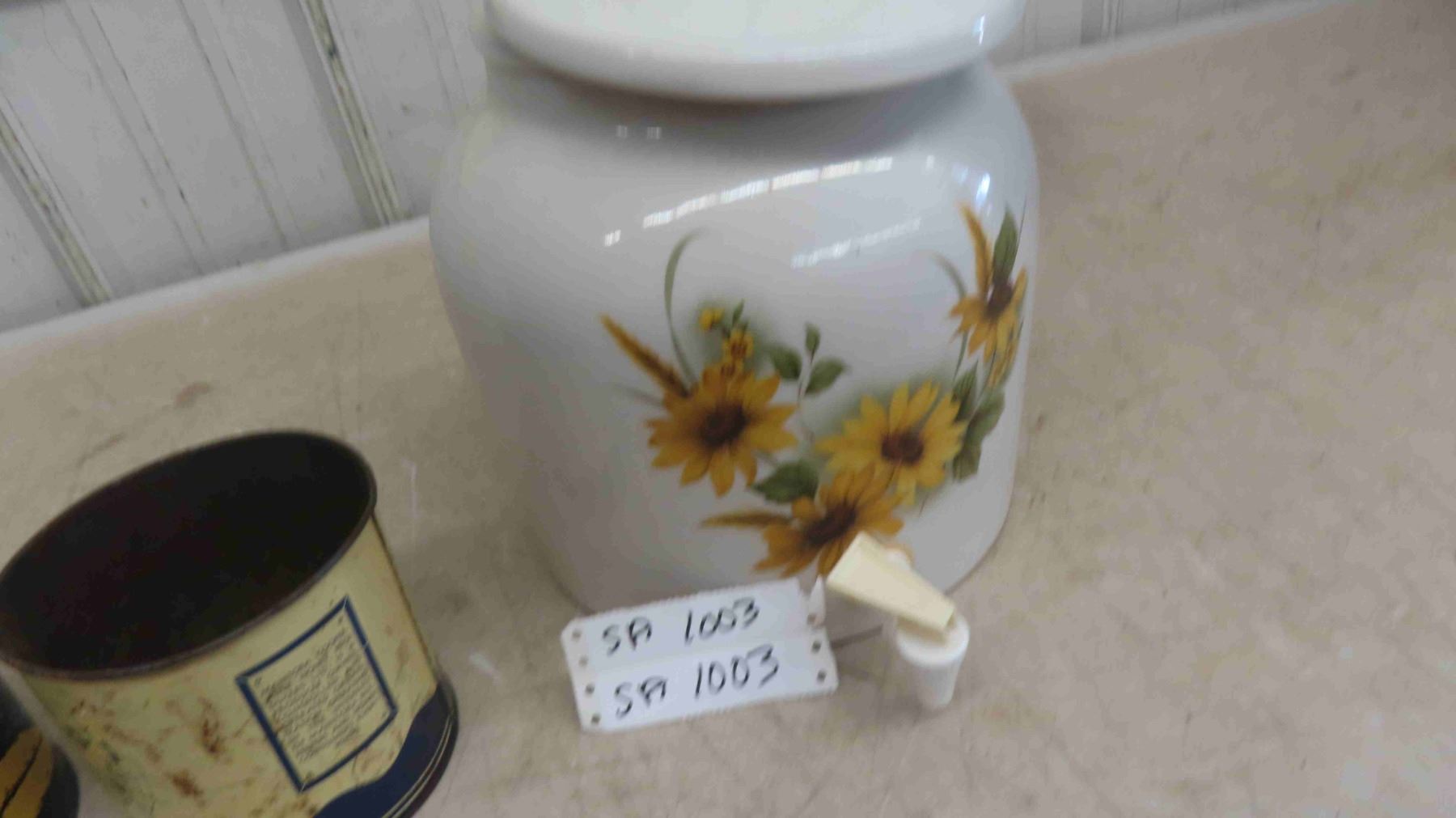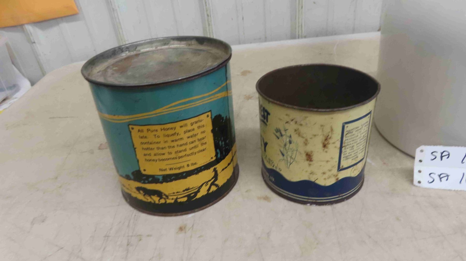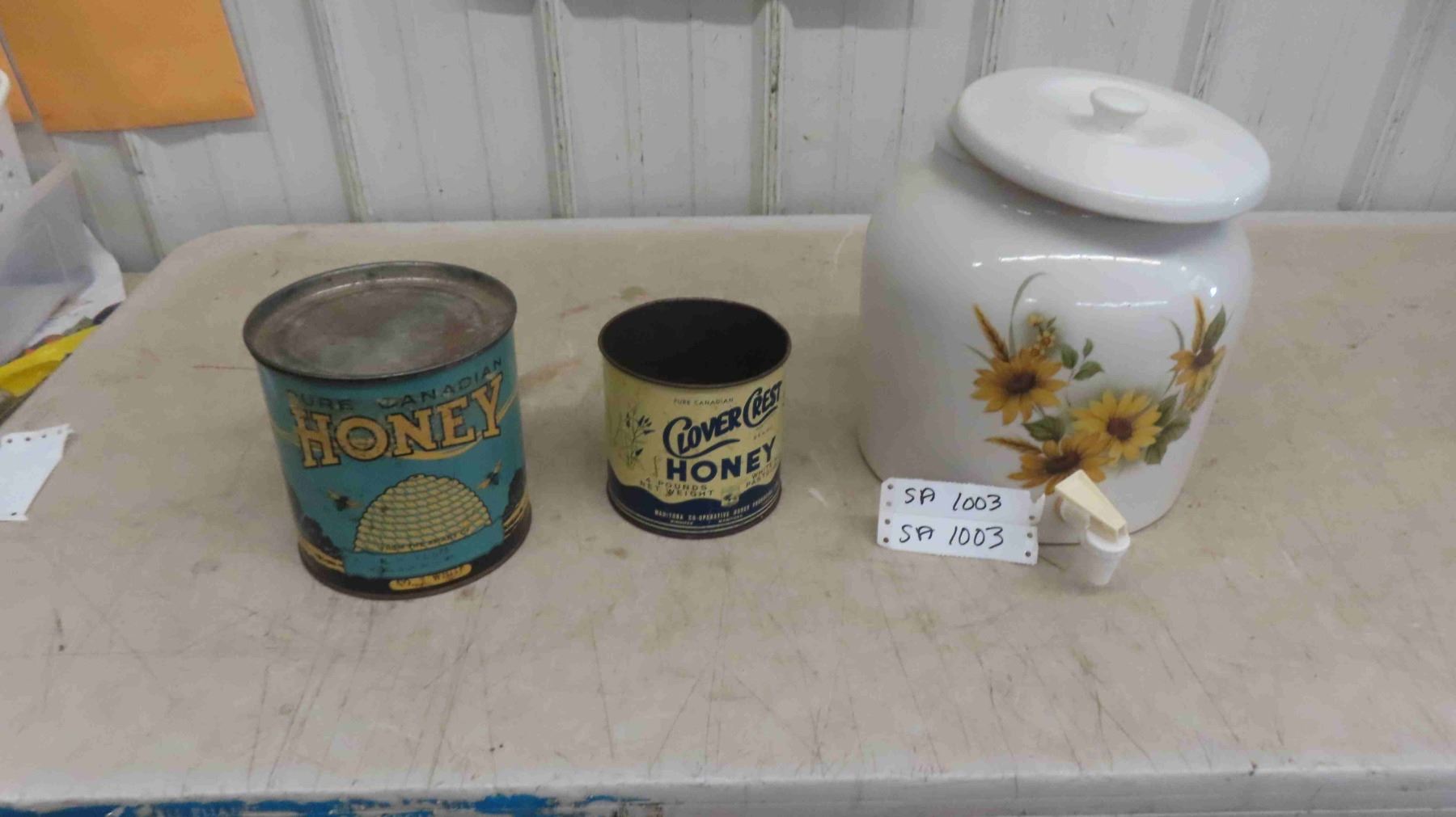 Drink Dispenser (Some Cracks), 2 Vintage Honey Tins