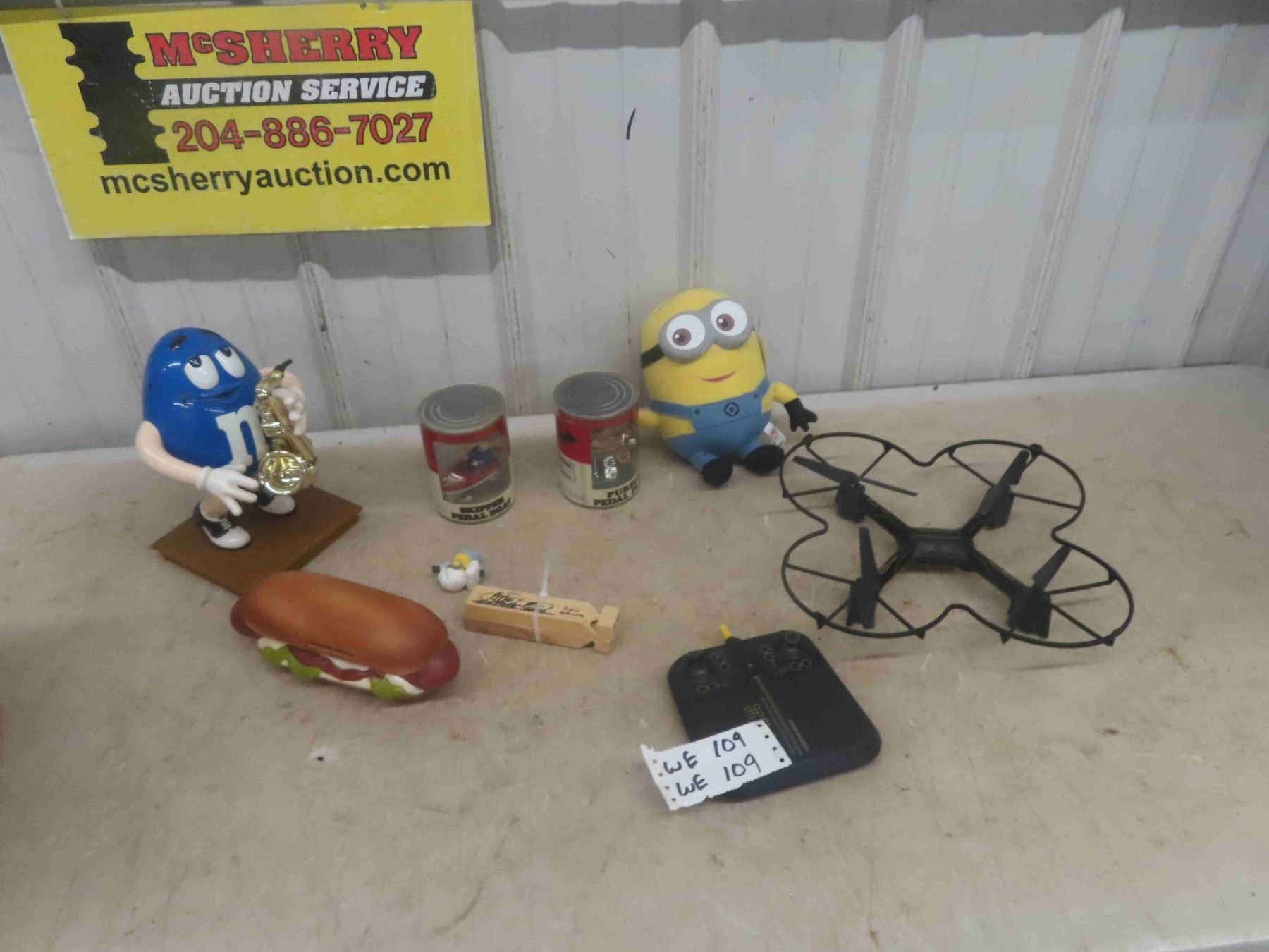 Drone DX-3 Remote Control, M+M Figurine, Pedal Boat , Hot Dog Bank, Train Whistle