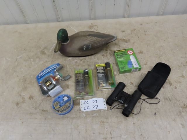 Duck Decoy, Bushmaster Binoculars, New Goose + Duck Call, New Shakespeare Fishing Reel, Fishing Weights, Pocket Knife, plus more
