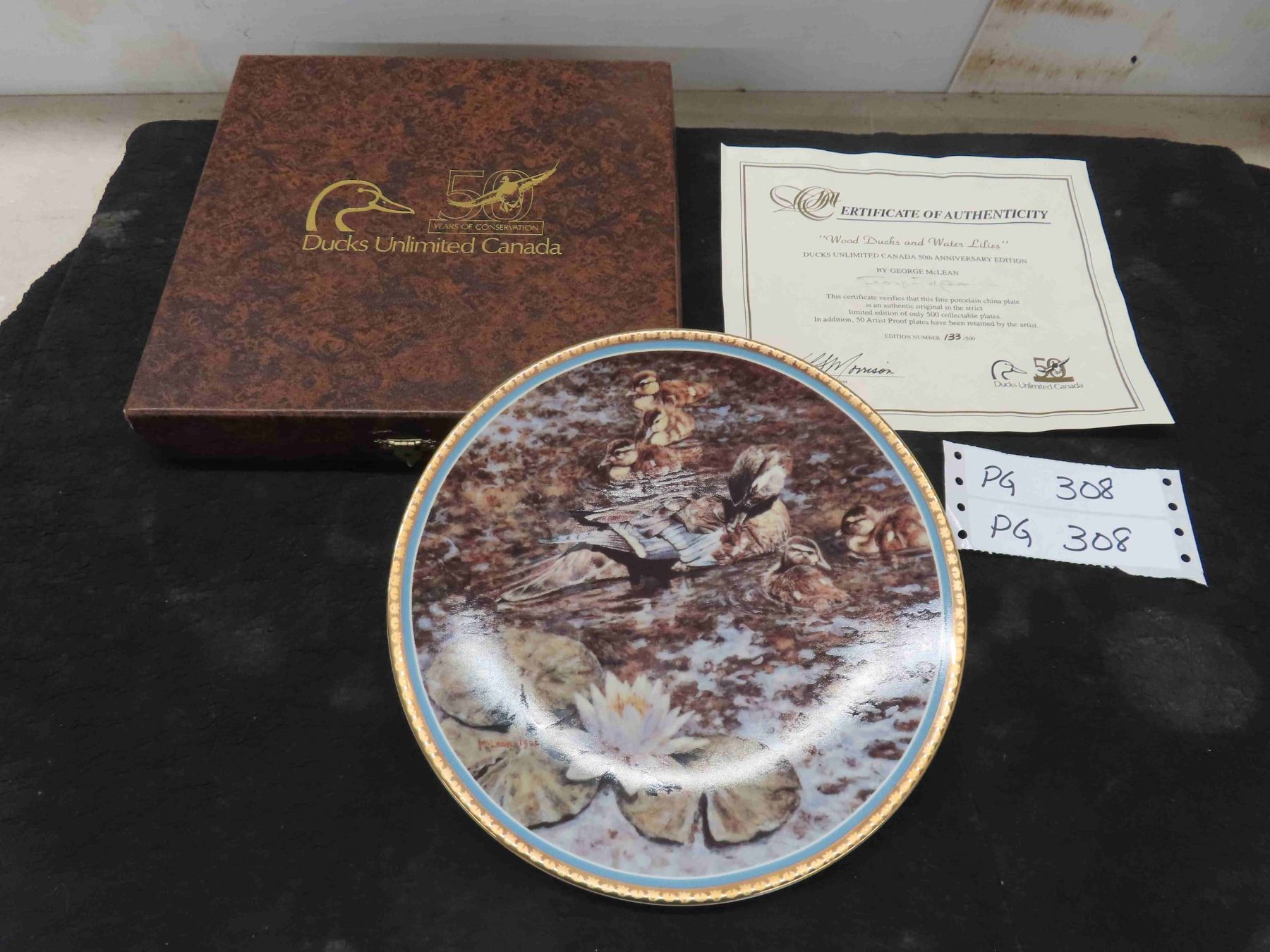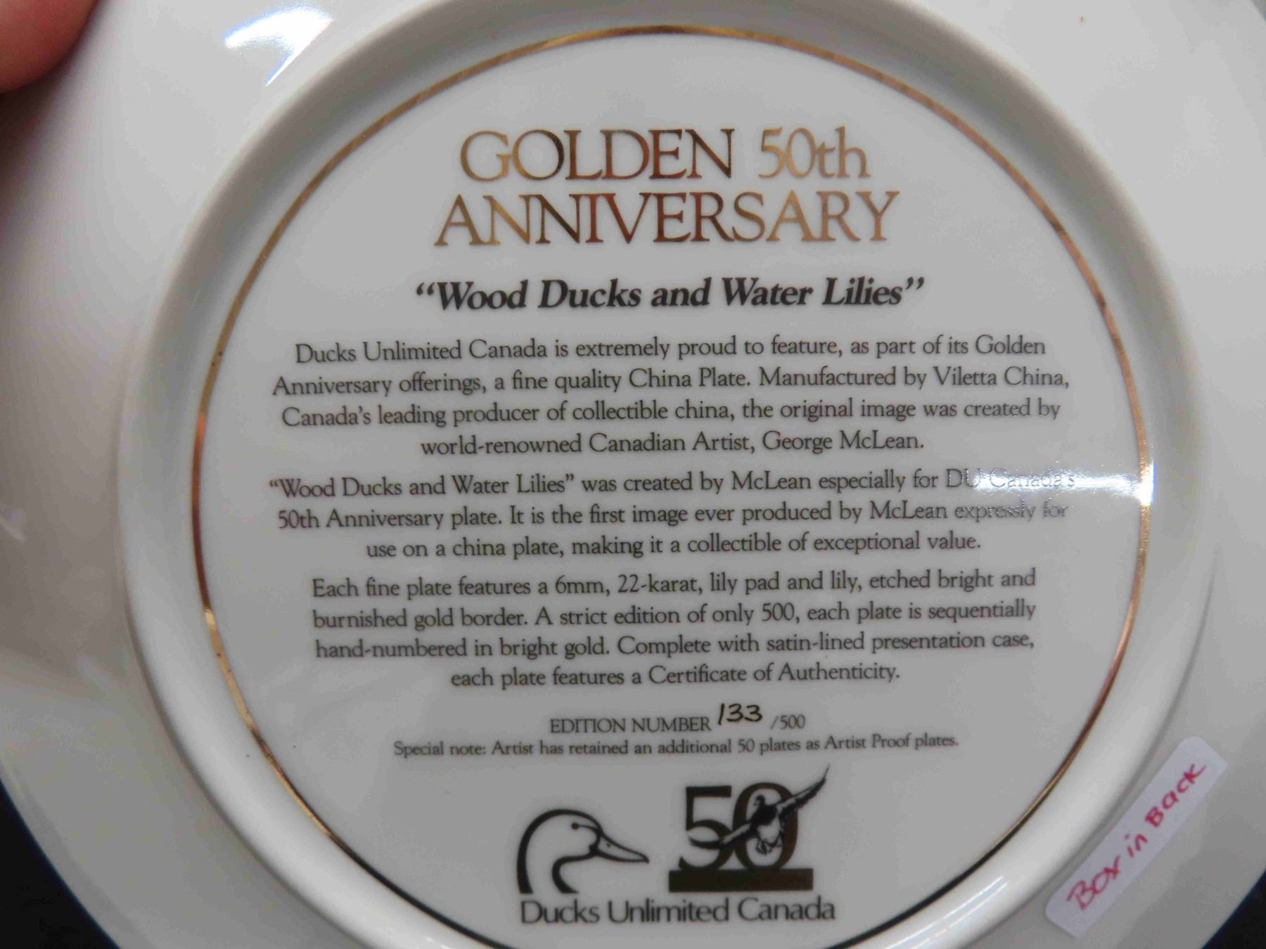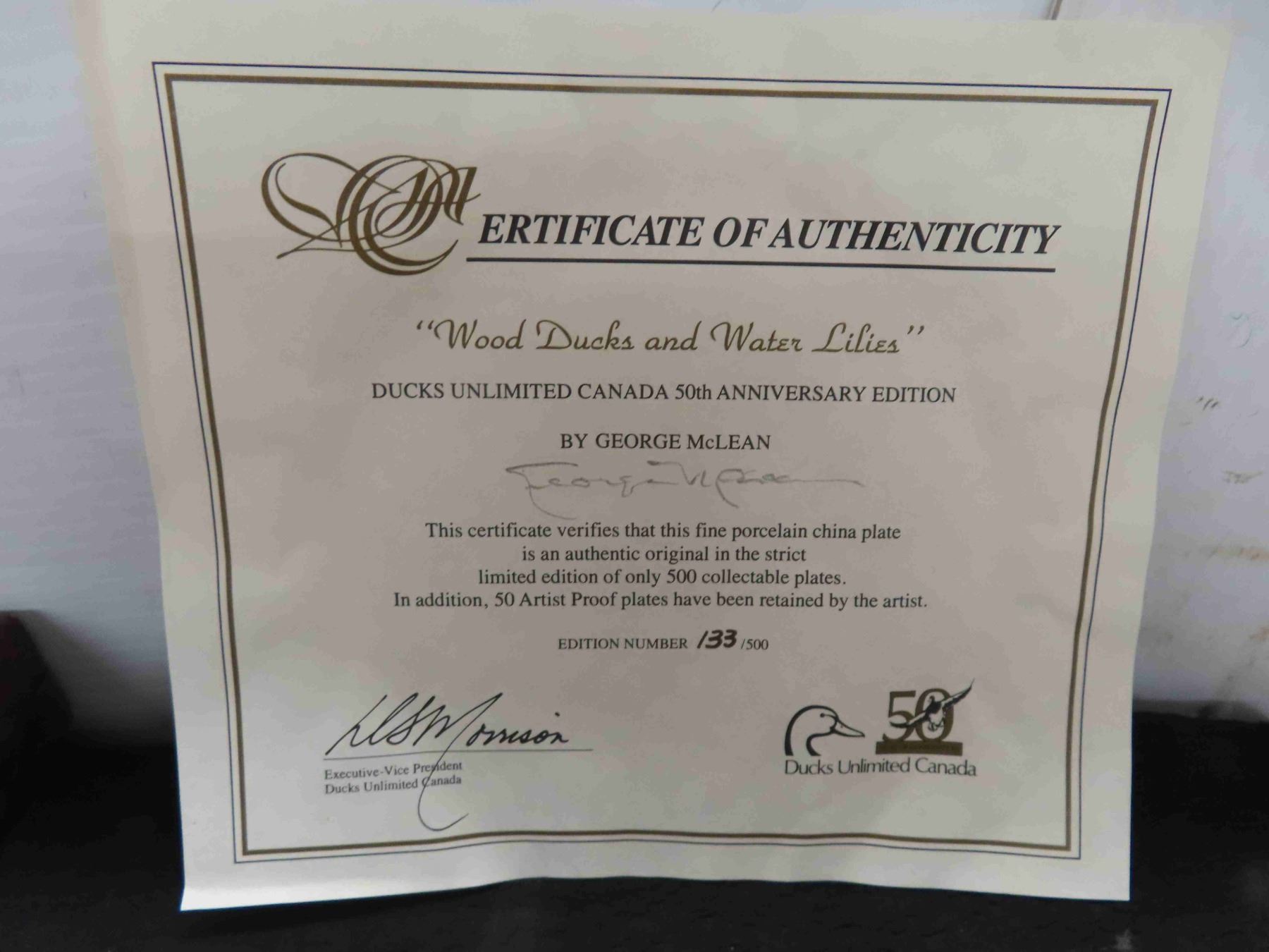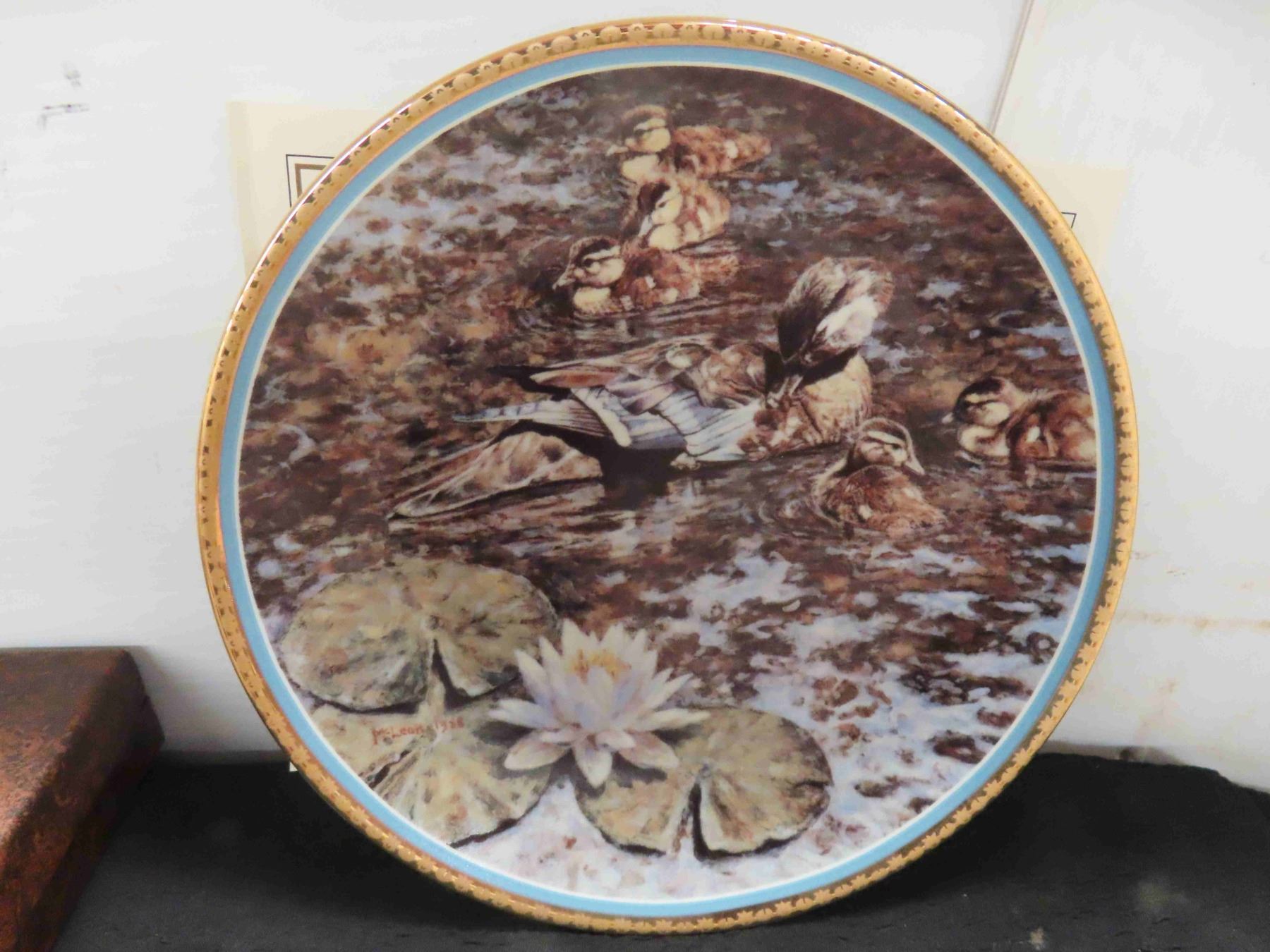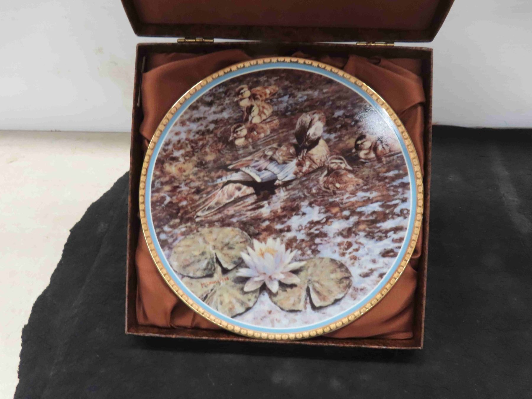 Ducks Unlimited Commemorative Plate "Wood Ducks and Water Lillies" 50th Anniversary Edition, Artist George McLean, Low Number of Production only 500 Made, Very Rare! 22K Trim, 8.5" Diameter, Origional in Box, No Chips or Cracks