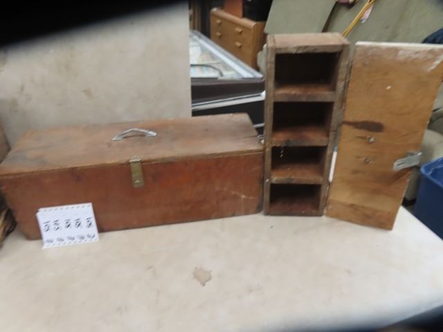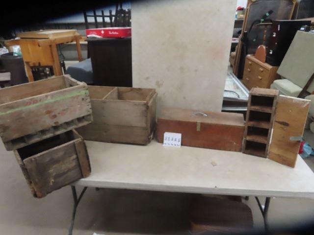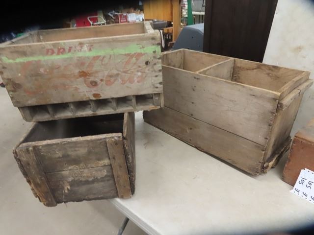 (E) Wooden Egg Crate, Coke Crate, & Wood Tool Box
