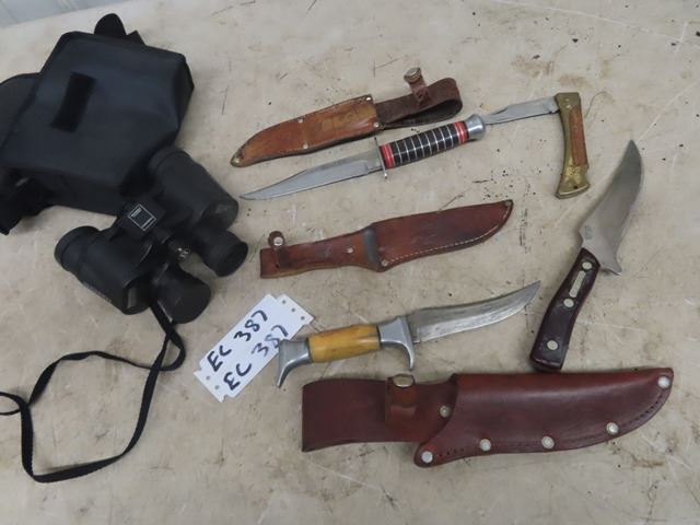(EC) 4 Hunting Knives - 1 Is Original Buffalo Skinner Germany, 1 is Old Timer Schrade USA, 1 is Sherif Knife - Brazil, 1 Flip Out Knife Plus Bushnell 7 x 35 Binoculars
