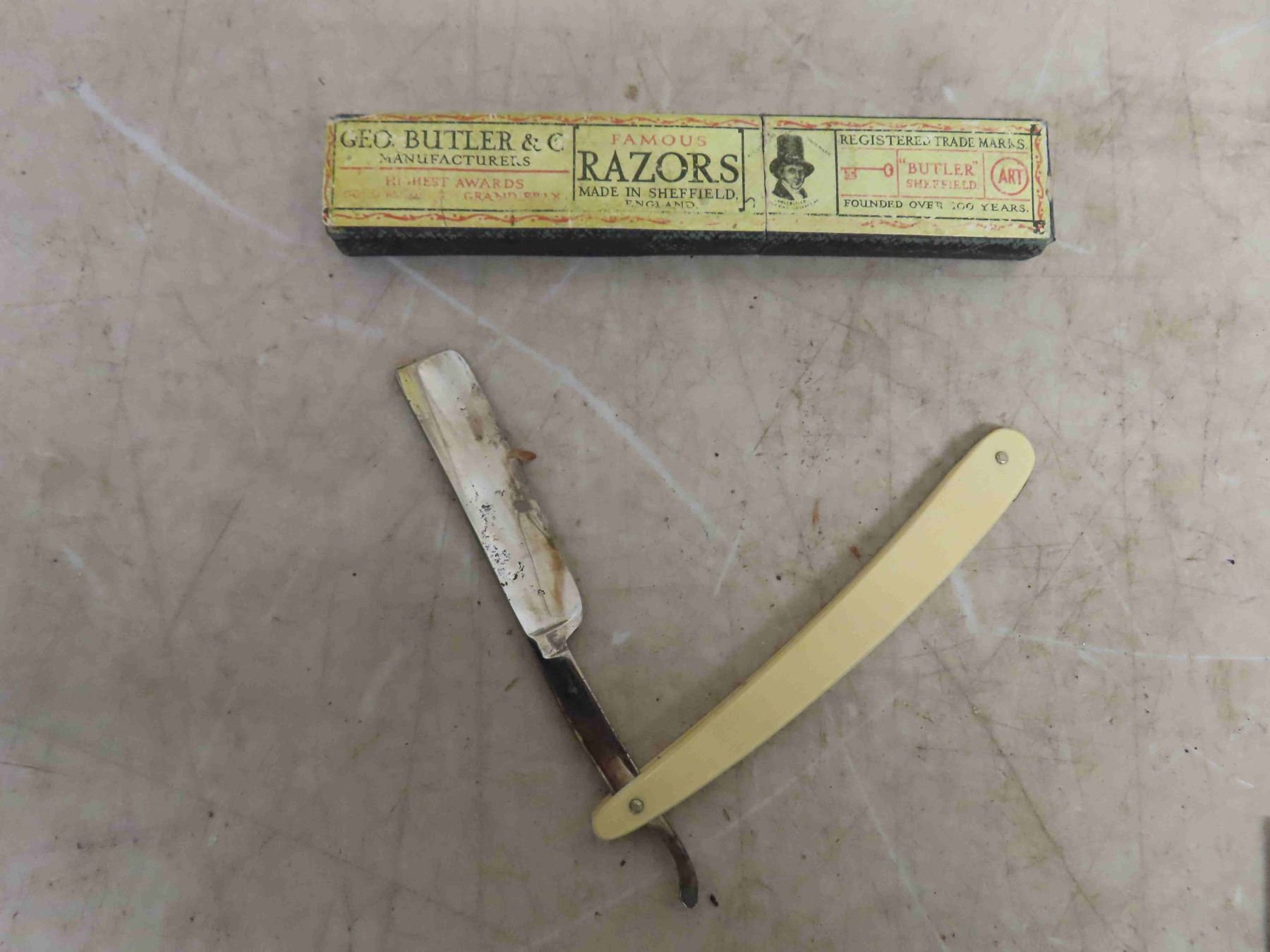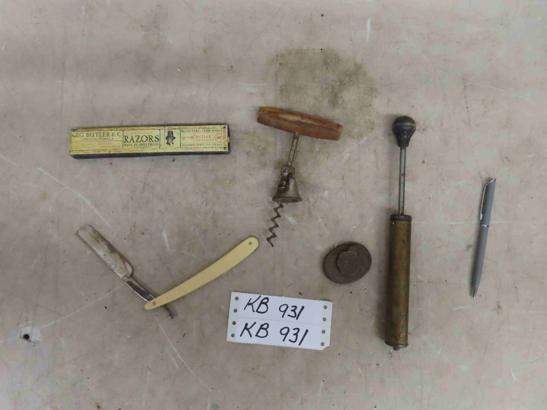 Ebony Straight Razor in Box, Brass Sausage Pump, Early Diet Coke Pen,
