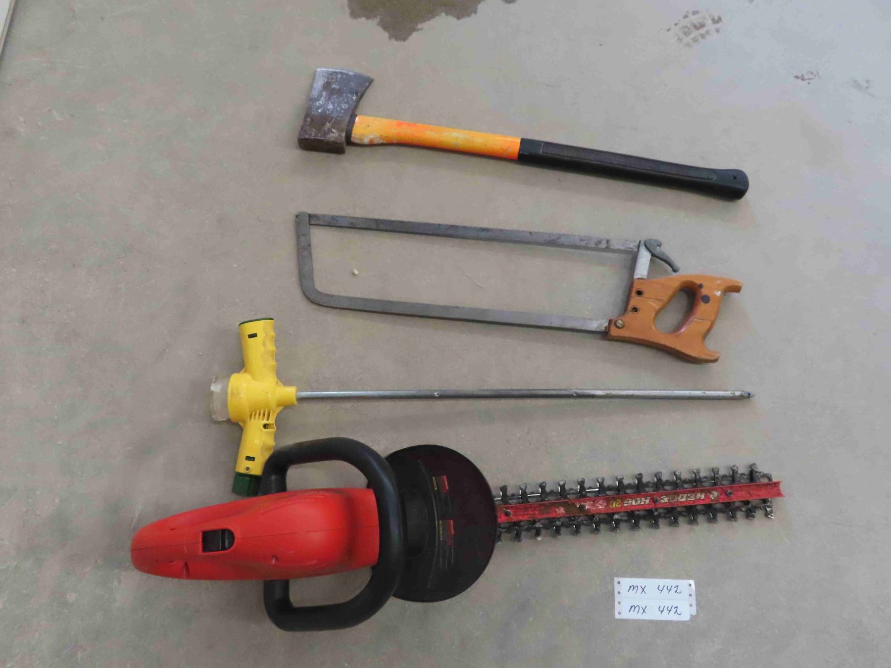 Electric Hedge Hog, Axe, Sprinkler, Butcher Saw