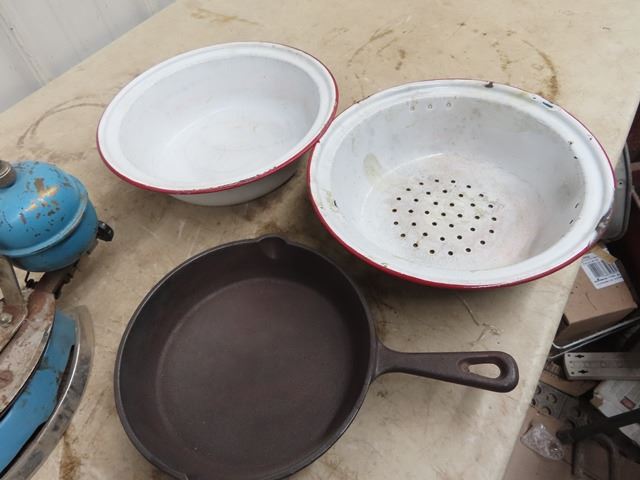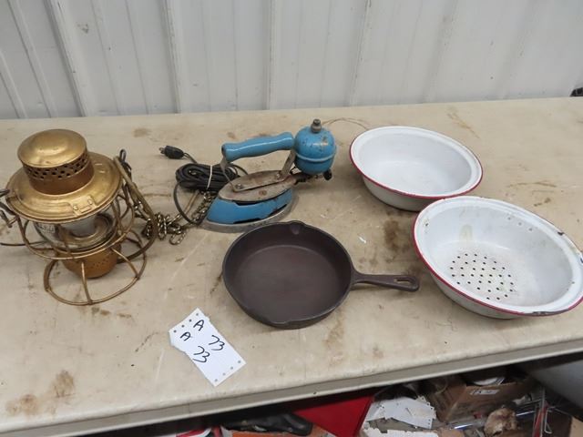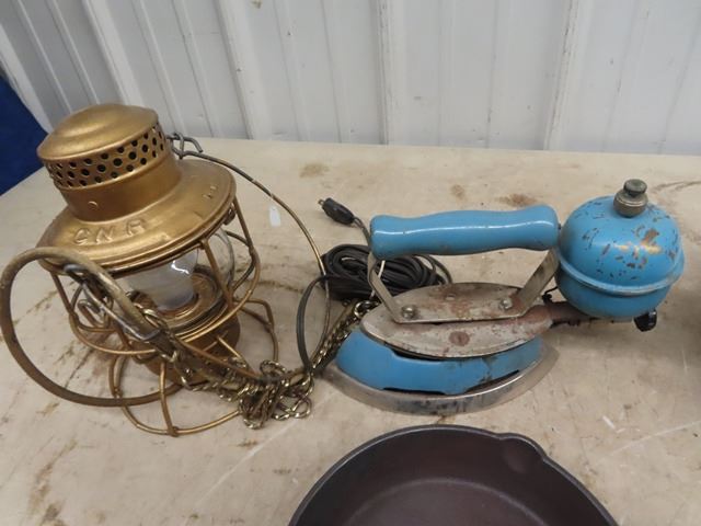 Electrified CNR Lamp, Coleman Iron Gas, Cast Frying Pan, & Enamelware