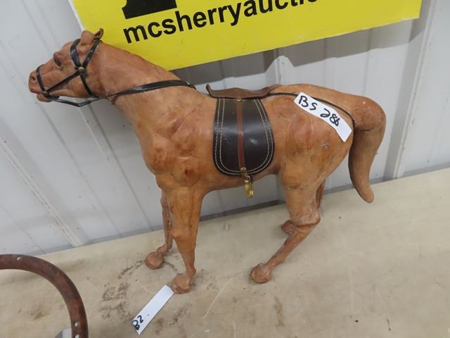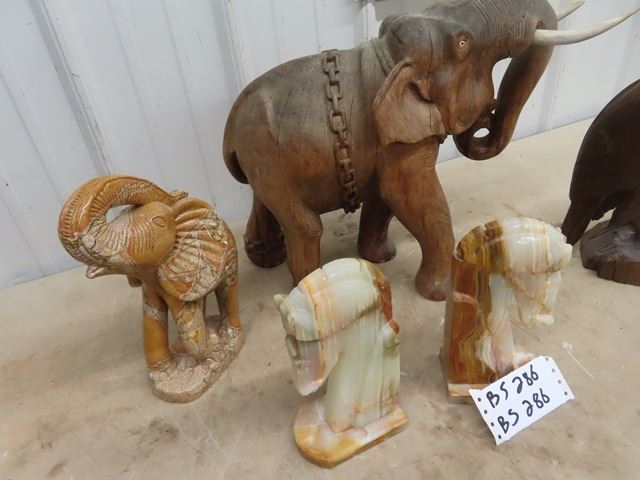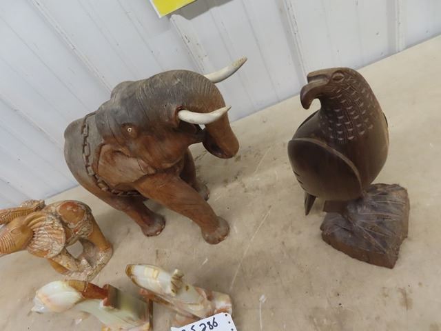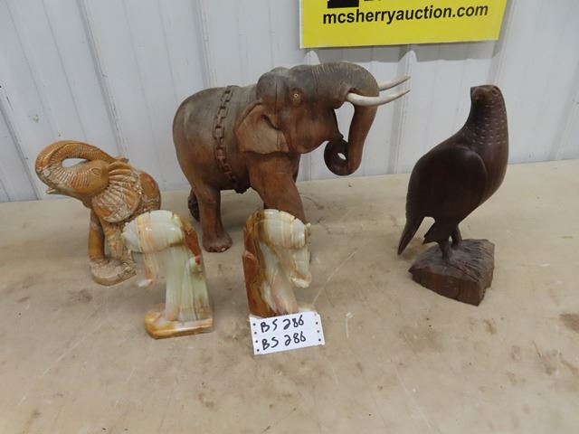 Elephant Ornaments 1) Wood 1) Plastic Alabaster Horse Bookends, Wood Carved Eagle & Leather Horse Or
