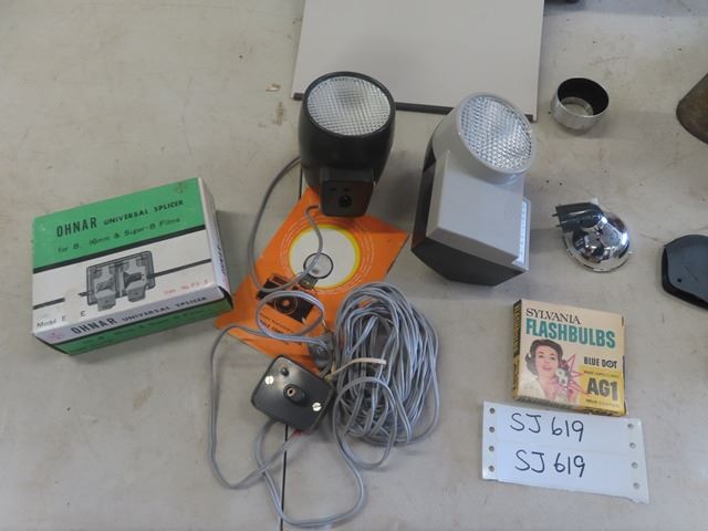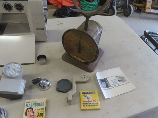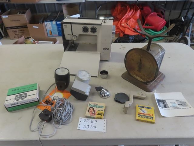 Elna Lotus 22 Sewing Machine, 2 Camera Flash, Film Splicer, Rusty Scale