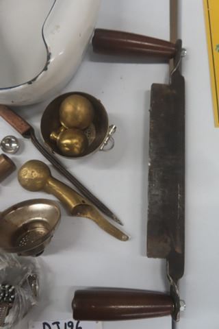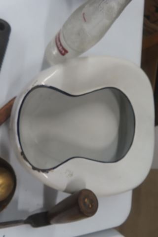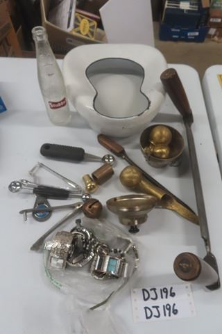 Enamel Bed Pan, Watches, Draw Knife, Stubby Bottle, plus more